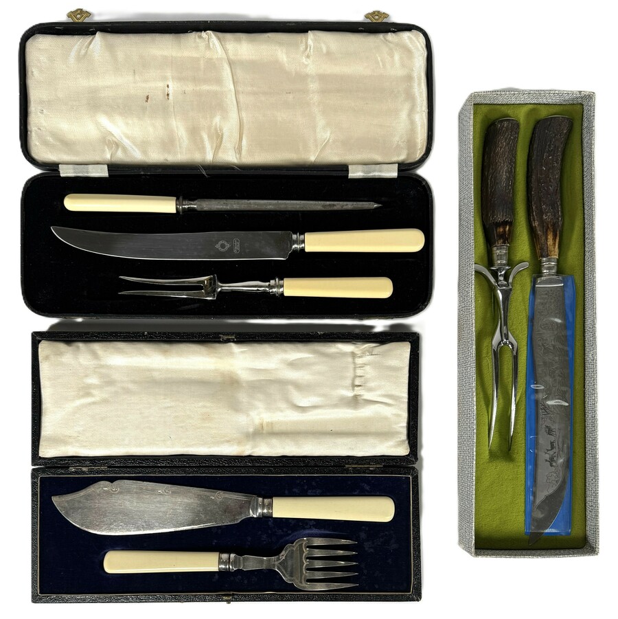 Drie sets vis- en vleesbestek uit midden 20e eeuw, bestaande uit staal met kunststof- en geweiheften, deels gegraveerd, in originele etuis met fluweel en zijde gevoerd interieur. De set met gewei is gemerkt Zwilling J.A. Henckels, een Duitse fabrikant uit Solingen en bevat een mes met gegraveerde jachtscène.