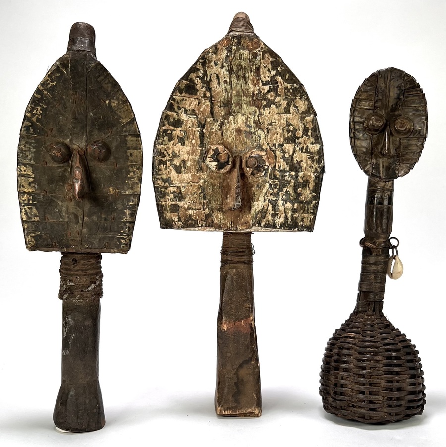 Mahongwe reliekhouders uit Gabon, midden 20e eeuw, vervaardigd uit hout bekleed met messing en koperen lamellen. Deze zogeheten boho-na-ulu figuren uit de Kota-traditie tonen concave gezichten met geprononceerde ogen en centrale neusrug en fungeerden als bewakers van voorouderlijke reliekmanden. Eén exemplaar heeft een basis in pitriet.