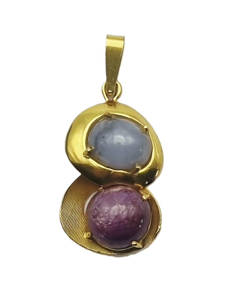 Hanger in Mid-century modern vormgeving vervaardigd uit 14 karaat geelgoud met klauw gezette cabochons van blauwgrijze stersaffier en paarsrode sterrobijn. Kenmerkend zijn de overlappende bolle schijfvormen en het fijn geribde waaiervormige accent achter de onderste steen. Gemerkt 585, de hanger dateert uit circa 1970.