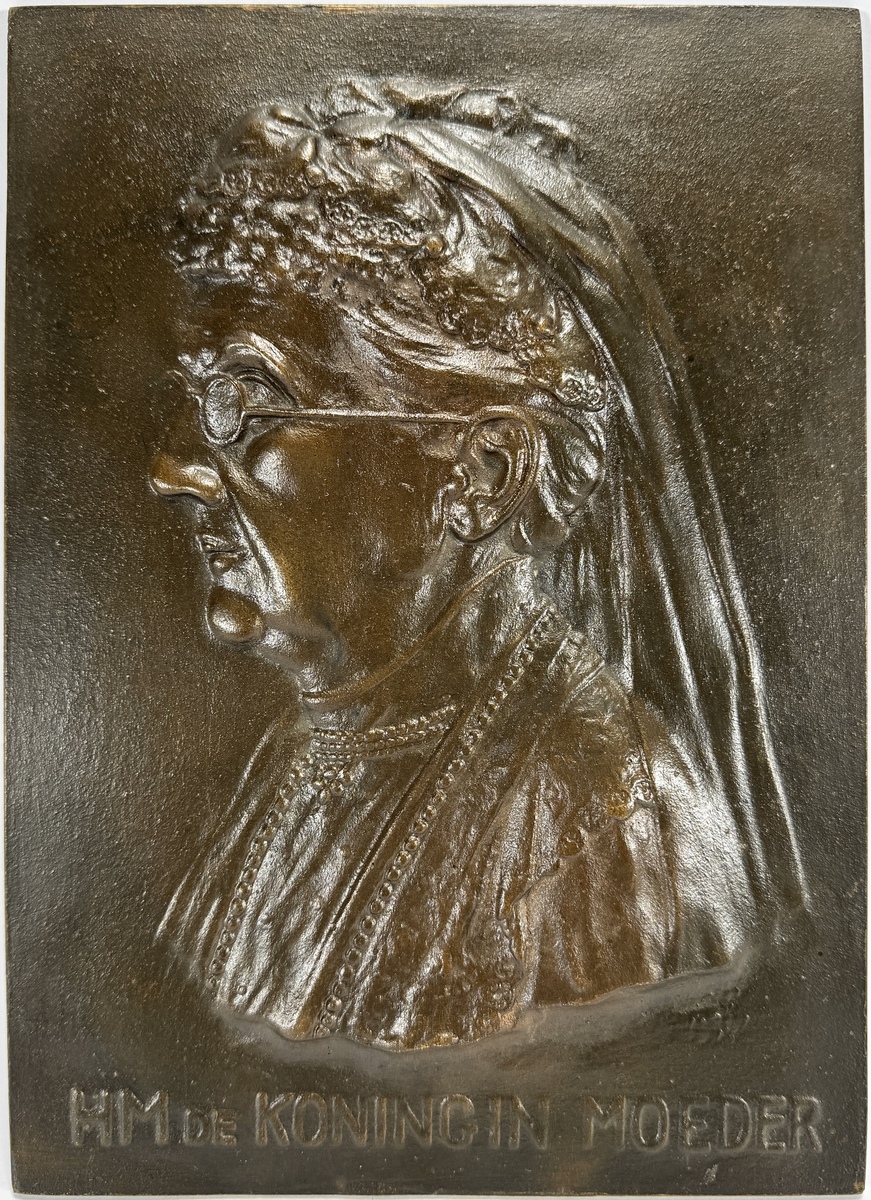 Bronzen plaquette in interbellum-modernistische stijl, circa 1934. Het portret toont Koningin Emma en profil met haar kenmerkende bril en weduwensluier boven het gegoten onderschrift "HM DE KONINGIN MOEDER". De plaquette dateert uit het tweede kwart van de 20e eeuw en heeft een Nederlandse herkomst.