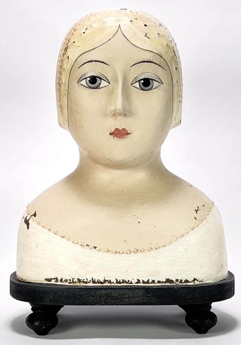 Beeld in neoclassicistische stijl, vervaardigd uit beschilderd gips met handmatige decoratieve afwerking. De buste toont een jonge vrouw in historische klederdracht met een gedetailleerde kap en parelranden langs de halslijn. Het geheel rust op een zwartgelakte houten sokkel met bolpoten. Dit beeld dateert uit de tweede helft van de 20e eeuw en heeft een Europese herkomst.