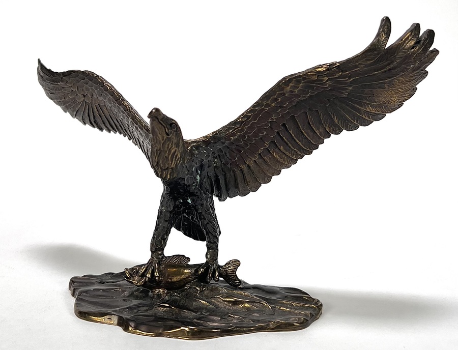 Bronzen beeld met gegoten en geciseleerde details. Het realistische beeld toont een zeearend met wijd uitgeslagen vleugels, staand op een rotsachtige basement met vis onder de klauwen, waarbij de veren in lagen zijn uitgewerkt. Aan de onderzijde gegraveerd met “1946-1996 Van den Herik- Sliedrecht, 50 jaar waterbouw, Sponsor WNF projekt Zeearend” en oplagenummer 86/750.