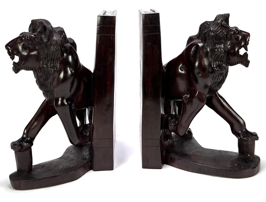Boekensteunen uit de Art Deco periode, vervaardigd uit handgesneden donker gepolijst hout. Het paar toont twee gespiegelde leeuwenfiguren in een krachtige aanvallende pose met opengesperde muilen en expressieve gestileerde manen. De boekensteunen dateren uit circa 1930 en hebben een Europese herkomst.