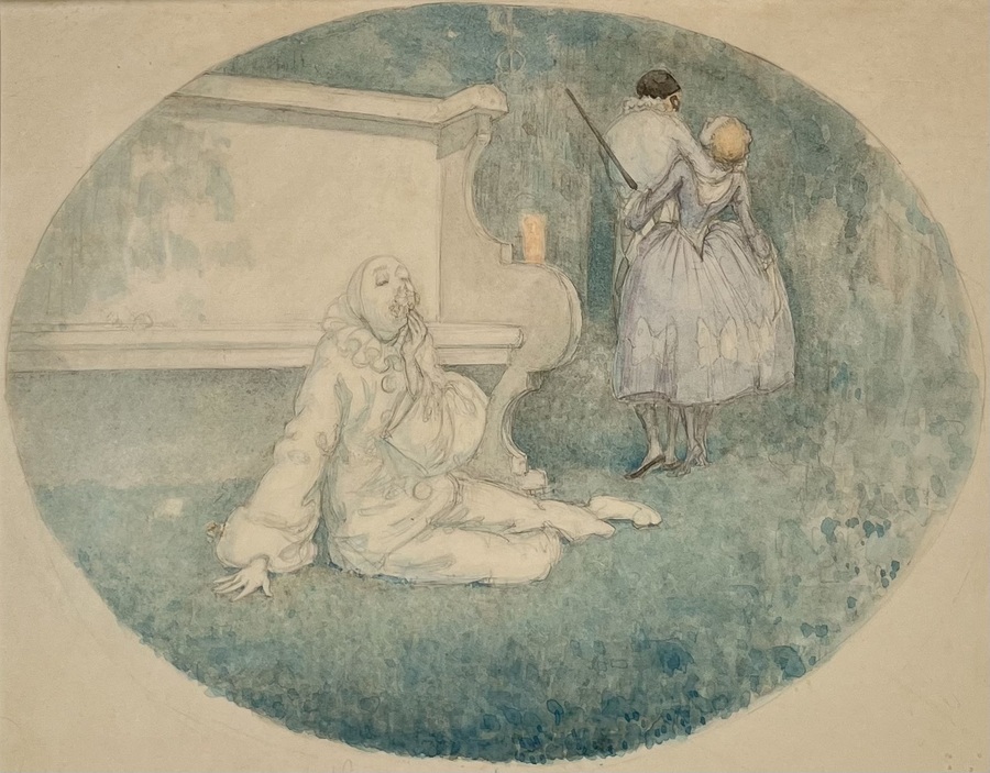 Dubbelzijdige tekening met potlood en waterverf getiteld "Fleur jeté - Symfonie in theeroos" en "Pierot in Giethoorn" door Reinhart Dozy (Nijmegen, 28 september 1880 – Elp, 27 januari 1947). De tekeningen komt uit de serie Reinhart Dozy & de Commedia dell' Arte, periode 1913-1919.