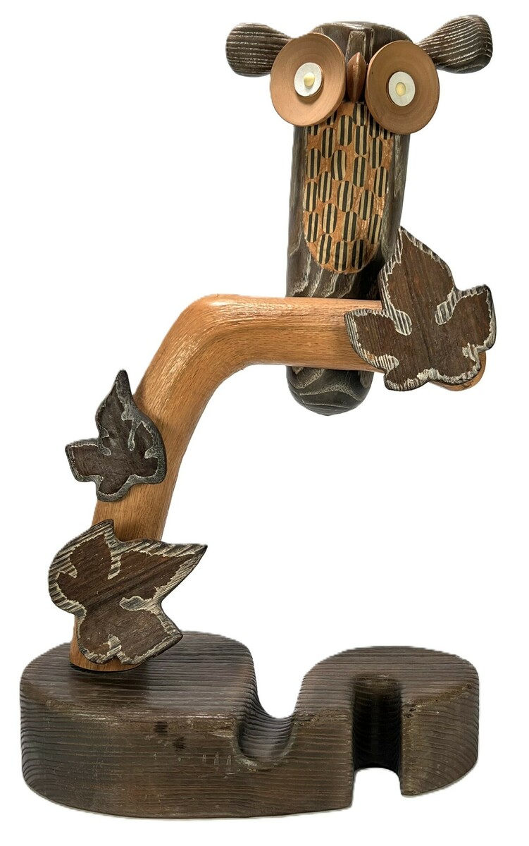 Beeld in modernistische stijl, vervaardigd uit gebeitst hout met houtsnijwerk en geassembleerde elementen. De uil op een tak is voorzien van kunststof pupillen en zit op een organisch gevormde tak. Het beeld staat op een geprofileerde voet met uitsparing en de onderzijde heeft de label van Hopman Alkmaar. Het beeld dateert uit de tweede helft van de 20e eeuw.