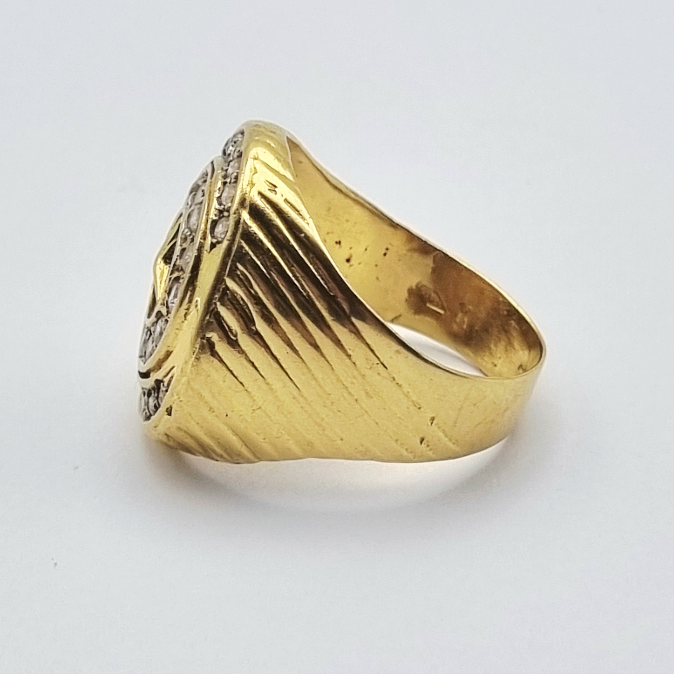 Gouden 18 karaat ring uitgevoerd als zegelring met het Mercedes-Benz logo centraal op een gedetailleerde achtergrond. De ronde kop is omringd door een dubbele rij heldere stenen in briljant slijpsel. Binnenzijde gemerkt 750, datering 21e eeuw. Geïnteresseerd? Bezoek onze kijkdagen op 10, 11 en 12 april van 11:00 tot 17:00 uur! |