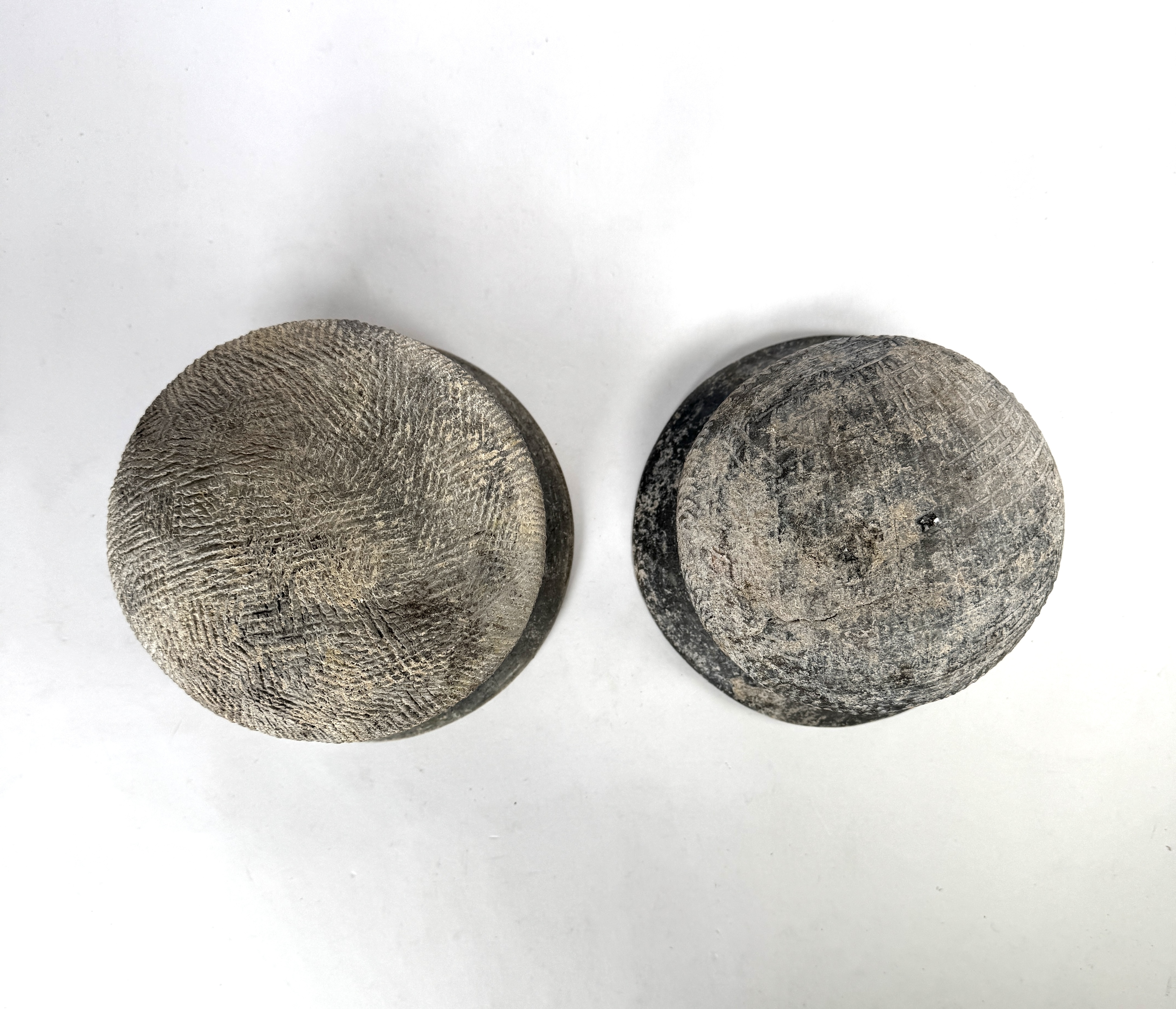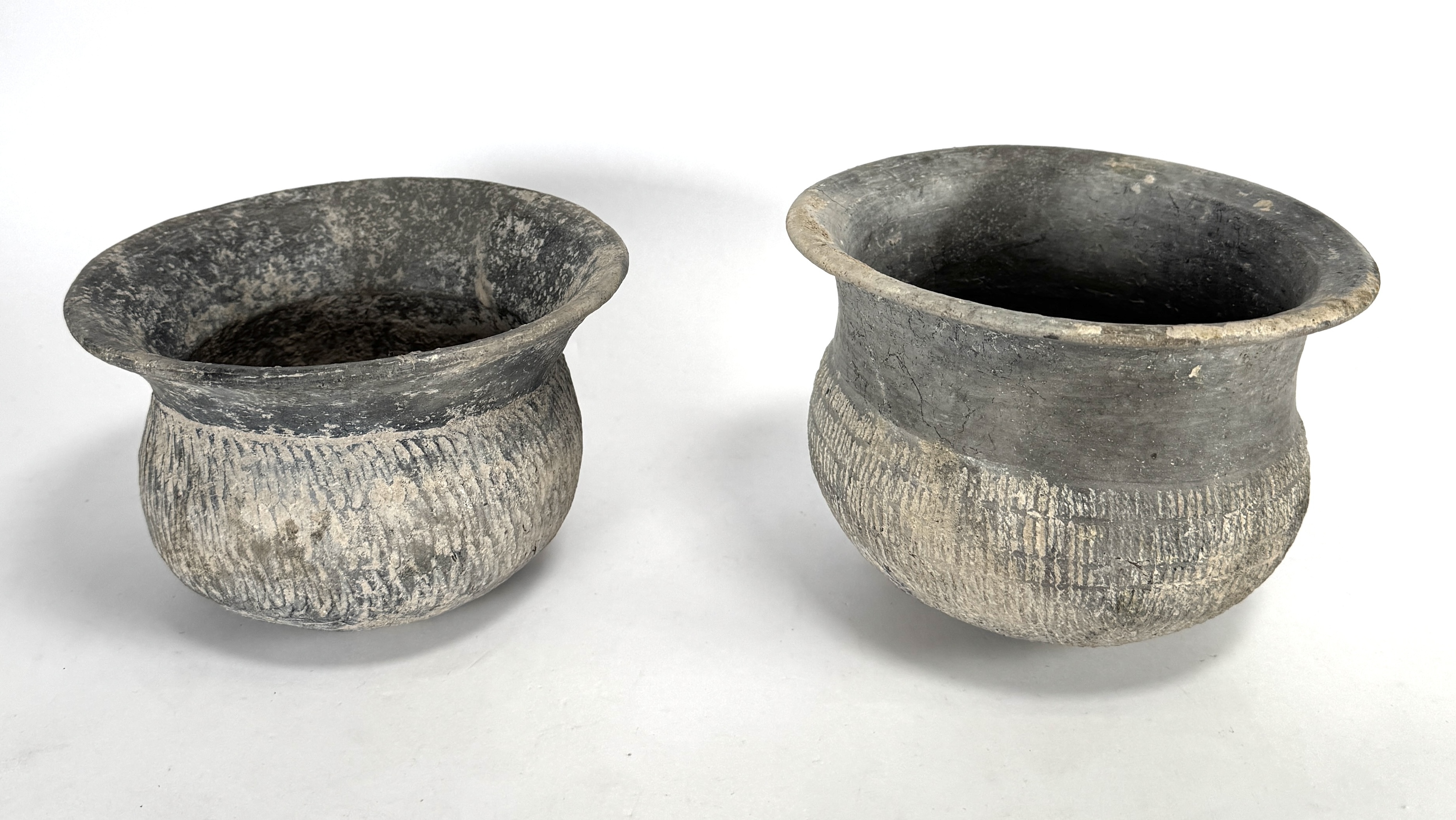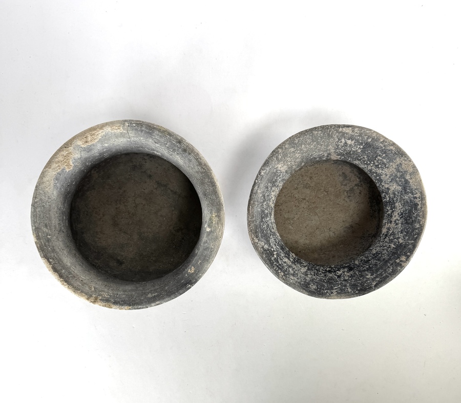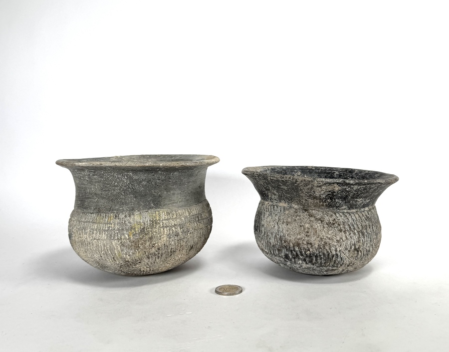 Zuidoost-Aziatische urnen van de Bantake cultuur, ca. 200 v. Chr., Cambodja. De handgevormde urnen in donkergrijs aardewerk vertonen een wijde monding en een licht bolvormig lichaam. De schouders zijn gedecoreerd met fijne, horizontaal ingekraste lijnen en geometrische patronen. Beide urnen vertonen een authentiek verweerd oppervlak met lichte sedimentaire resten. De set vormt een representatief geheel uit de ijzertijd van het vasteland van Zuidoost-Azië. Klaar om te bieden? Registreer je nu en doe mee aan de veiling! |