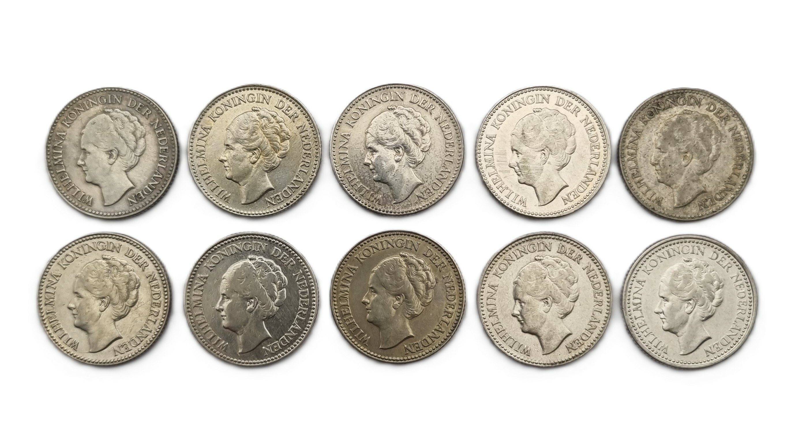 Tien halve guldens van de Rijksmunt Utrecht uit de periode 1921–1930, vervaardigd uit 720/1000 zilver. De tien muntstukken tonen het portret van Koningin Wilhelmina met opgestoken haar op de voorzijde. De keerzijde bevat het gekroonde Nederlandse rijkswapen tussen de waarde aanduiding. De munten bevatten de jaartallen 1921, 1928, 1929 en 1930. Geïnteresseerd? Bezoek onze kijkdagen op 10, 11 en 12 april van 11:00 tot 17:00 uur! |