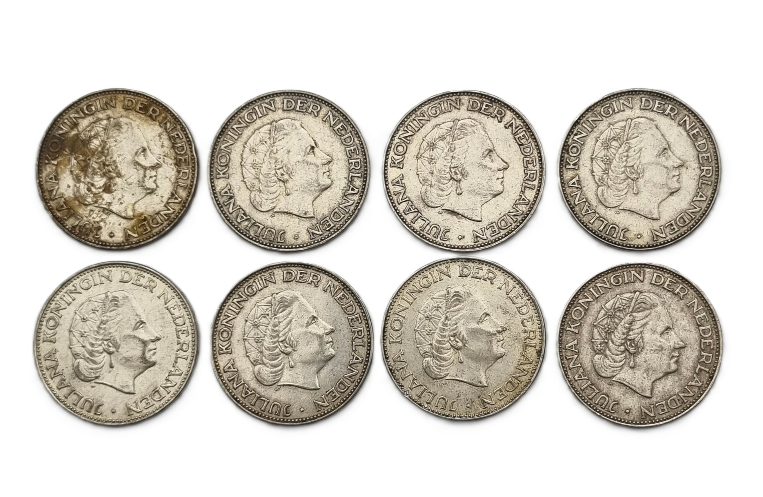 Zilveren rijksdaalders van de Nederlandse Munt uit de Koningin Juliana periode, geslagen tussen 1959 en 1966 in 720/1000 zilver. De set van acht munten toont het borstbeeld van de koningin en het gekroonde rijkswapen op de keerzijde. Elk exemplaar weegt 15 gram en is voorzien van het randschrift God zij met ons. Herkomst Nederland, diverse jaargangen waaronder 1959, 1960, 1961, 1963. Klaar om te bieden? Registreer je nu en doe mee aan de veiling! |