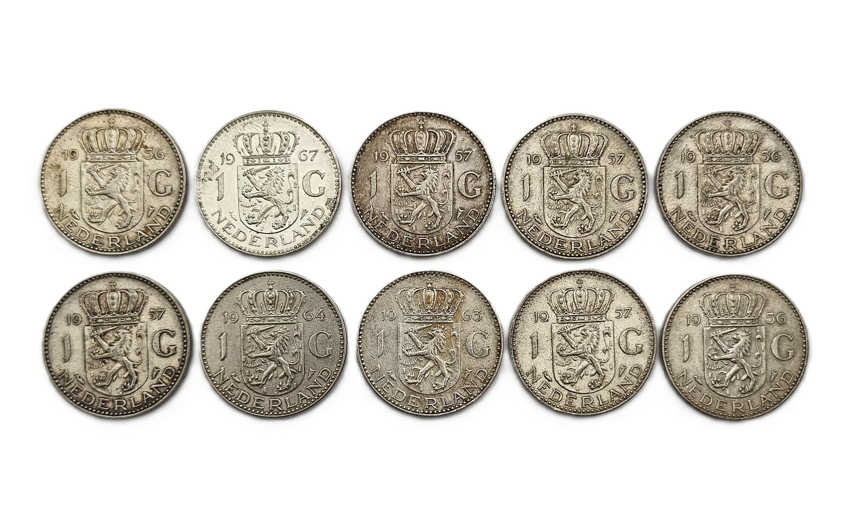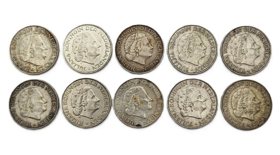 Tien zilveren guldens uit de regeerperiode van koningin Juliana, geslagen tussen 1956 en 1967. De munten zijn vervaardigd uit 720/1000 zilver en tonen het naar rechts gewend portret van de vorstin. De keerzijde bevat het gekroonde Nederlandse rijkswapen tussen de waarde aanduiding. Klaar om te bieden? Registreer je nu en doe mee aan de veiling! |