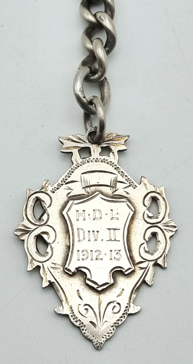 Sterling zilveren horlogeketting uitgevoerd met een robuuste gourmet-schakel en een schildvormig medaillon. Het sieraad is vervaardigd door de firma Robert Pringle & Sons te Birmingham en draagt de jaarletter N voor 1912. Het medaillon is aan de voorzijde gegraveerd met de inscriptie 'H.D.L. Div. II 1912-13' en achterop gepersonaliseerd met de naam 'C. Wyatt'. Eerst de horlogeketting zien voordat je biedt? Bezoek onze kijkdagen op 10, 11 en 12 april! |