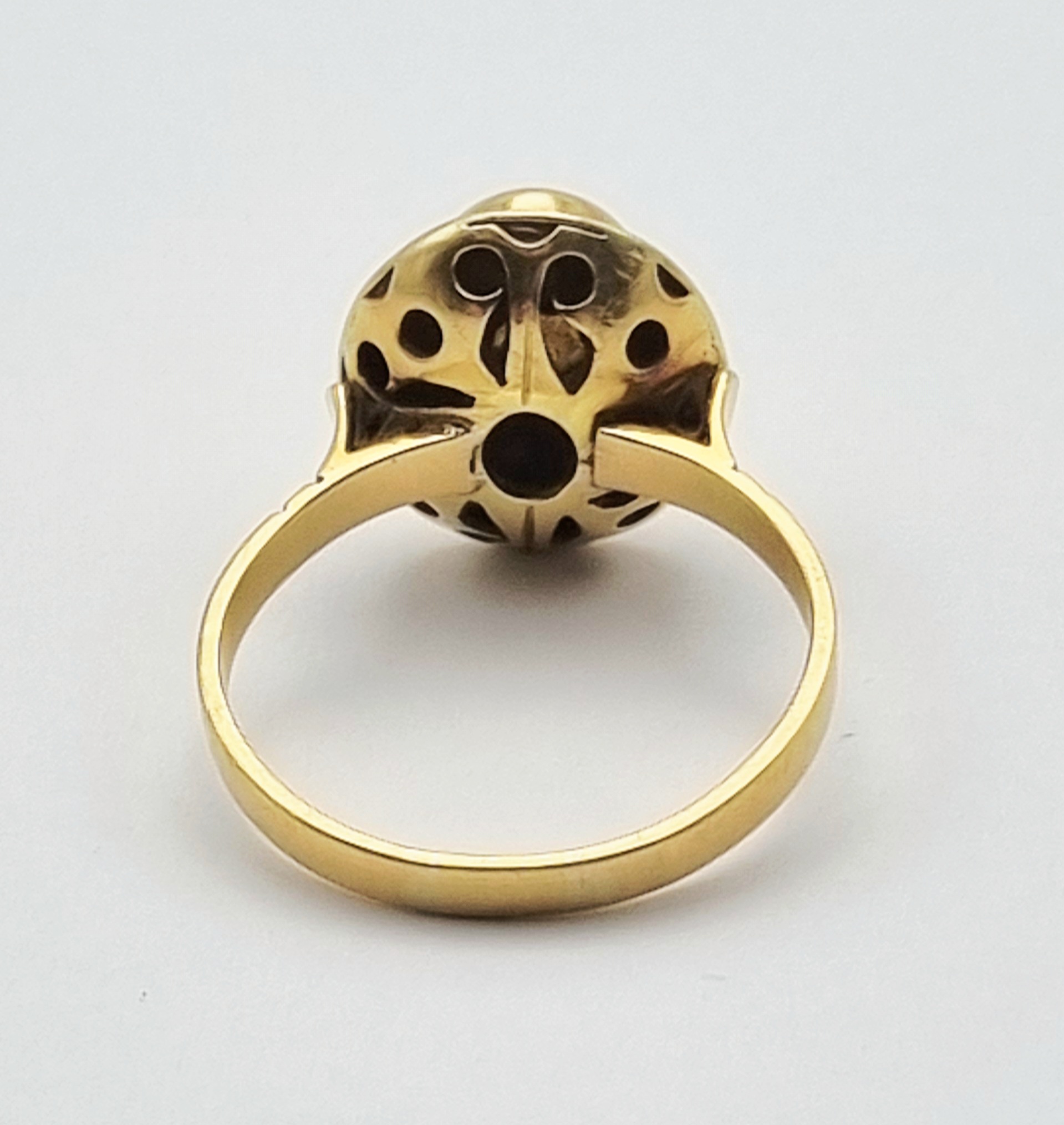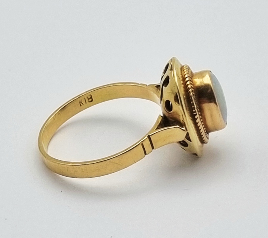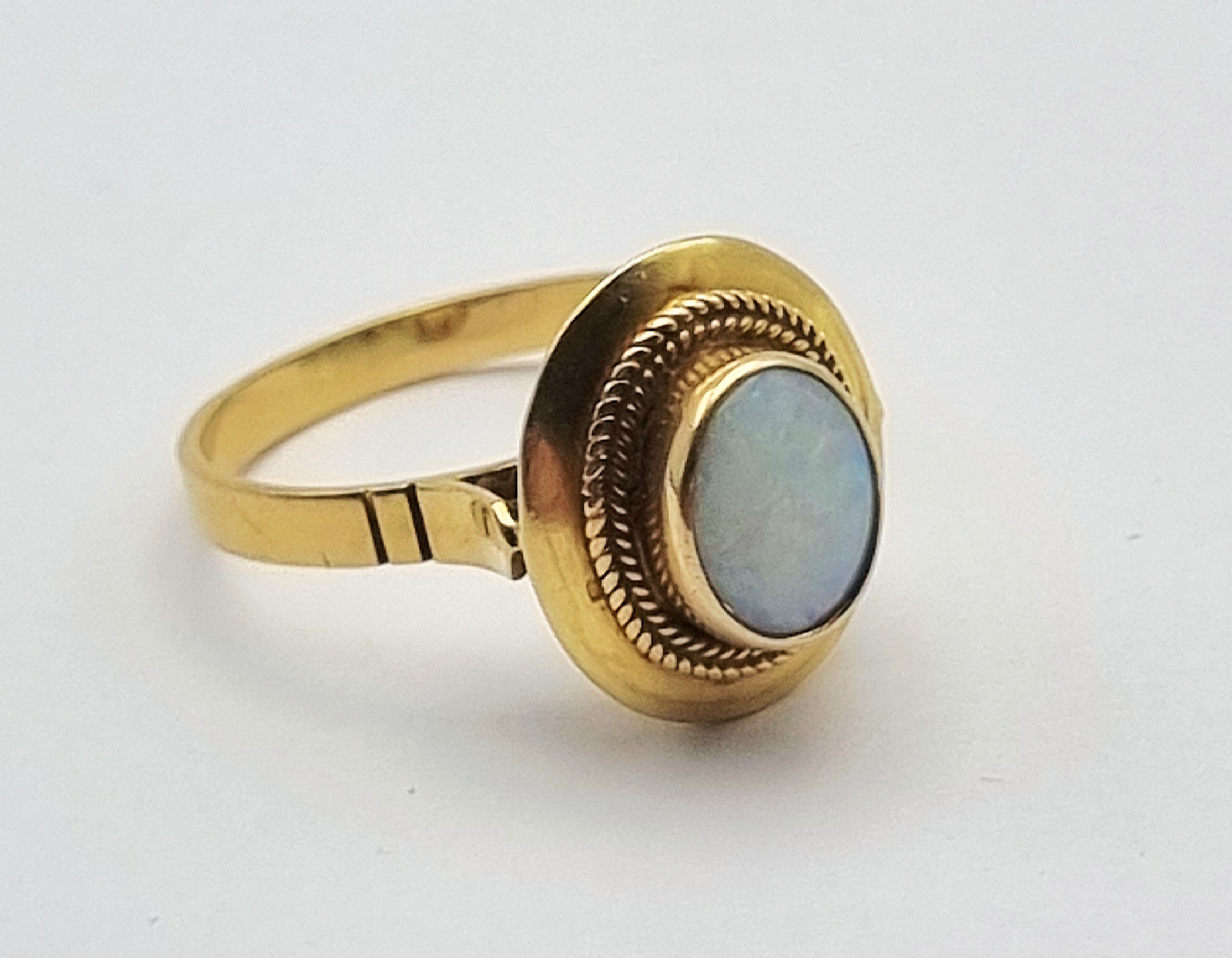 Gouden 18-karaats ring uit de Victoriaanse periode, vervaardigd met een ovaal opaal cabochon. Het sieraad toont getordeerde draadwerk rondom de bezelzetting. De onderzijde van de kop is uitgevoerd in een opengewerkt patroon. Binnenzijde gemerkt met 18K, herkomst West-Europa, daterend circa 1900. Geïnteresseerd? Bezoek onze kijkdagen op 10, 11 en 12 april van 11:00 tot 17:00 uur! |