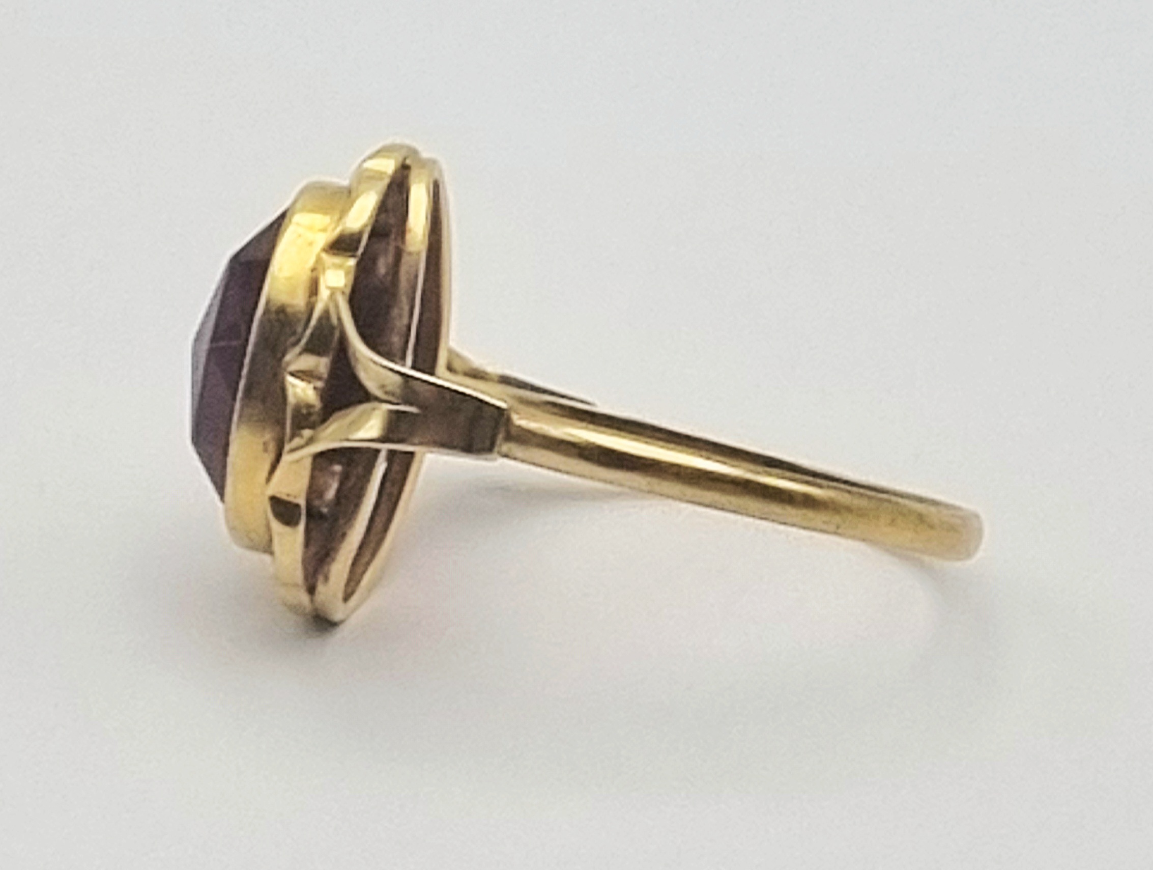 Gouden 14-karaats damesring bezet met een carneool in ovaal facet slijpsel. De steen is gevat in een gladde bezelzetting die wordt omringd door een decoratieve, geschulpte rand. Het montuur toont gespleten schouders die overgaan in de ringband. Het sieraad is aan de binnenzijde voorzien van het Nederlandse eikenbladwaarborgmerk voor 585 goud en dateert uit circa 1950. Wil je direct deelnemen? Plaats vanaf 3 april alvast een schriftelijk bod via onze website! |
