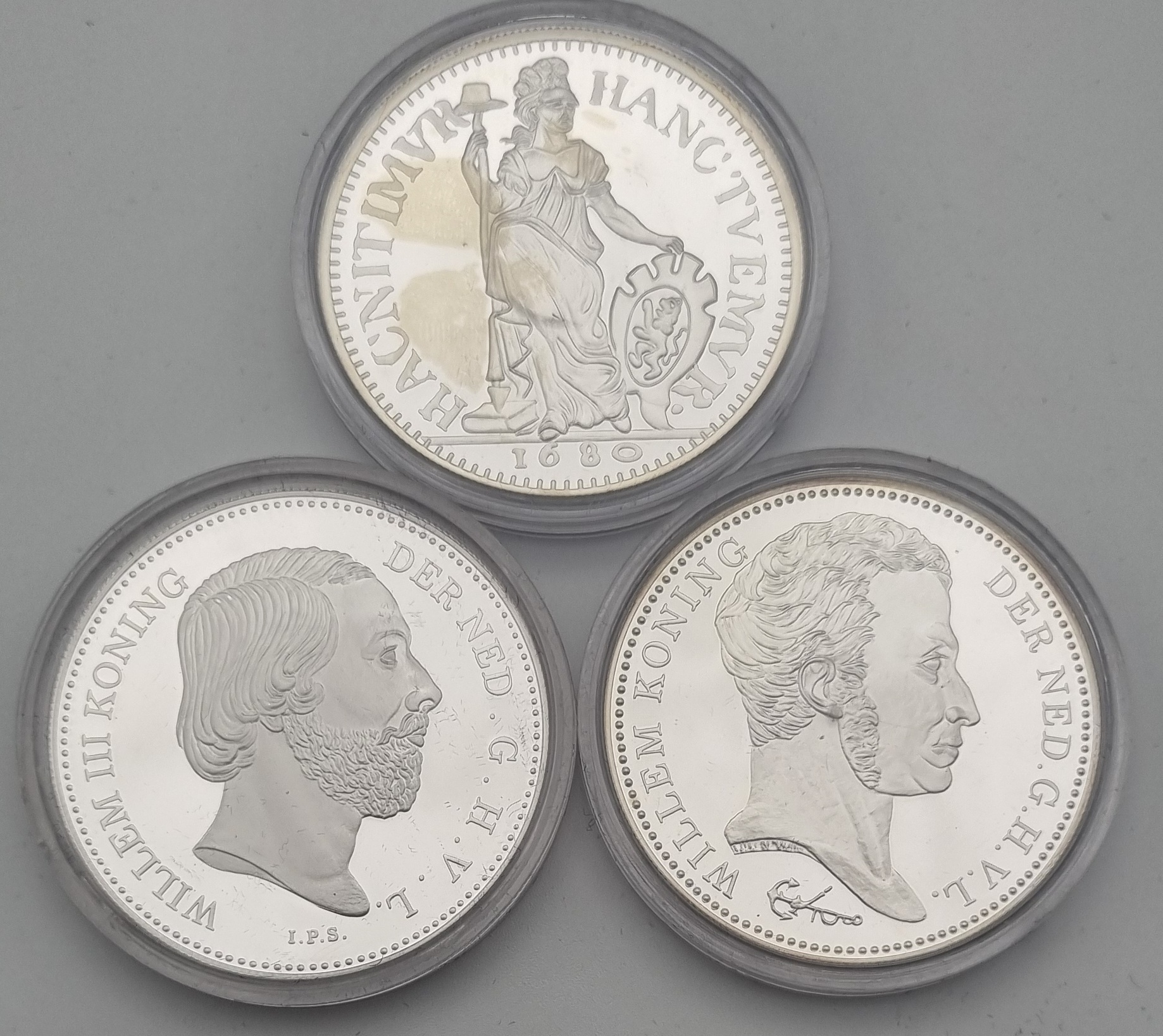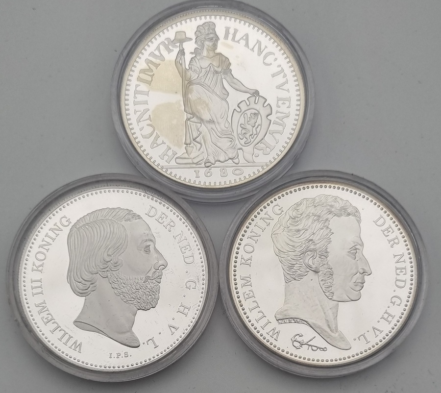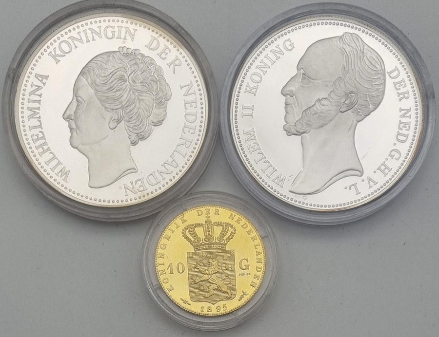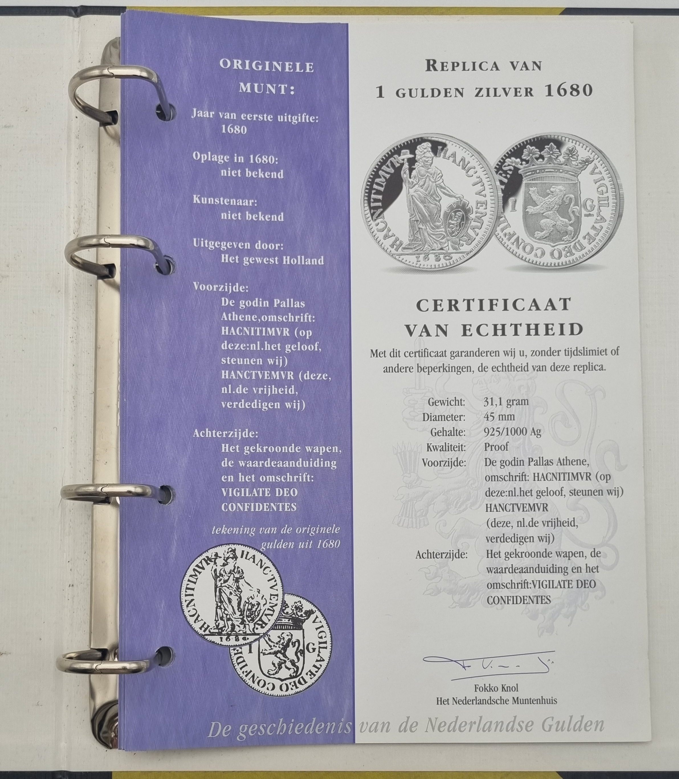 De collectie "De geschiedenis van de Nederlandse Gulden" bestaat uit replica's in sterling 925/1000 zilver en 24 karaats verguld sterling 925/1000 zilver, geslagen ter gelegenheid van het afscheid van de Nederlandse Gulden. In deze set zitten een replica van 1 gulden zilver 1680, een replica 1 gulden zilver 1823, een replica 1 gulden zilver 1842, een replica 1 gulden zilver 1867, een replica 10 gulden 1895 en een 1 gulden replica zilver 1944. Uitgegeven 2001. |