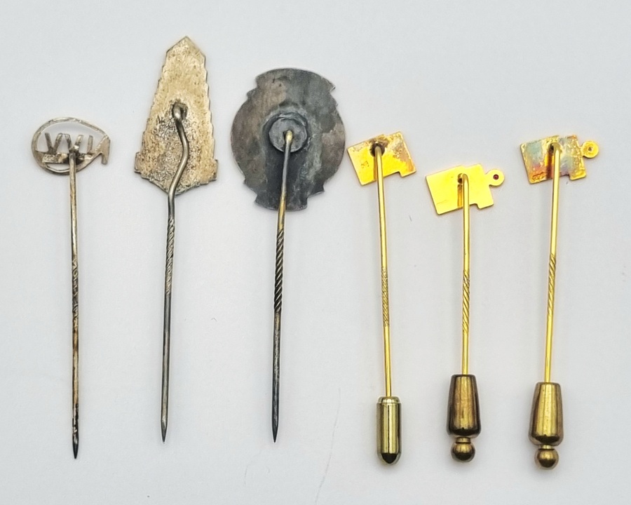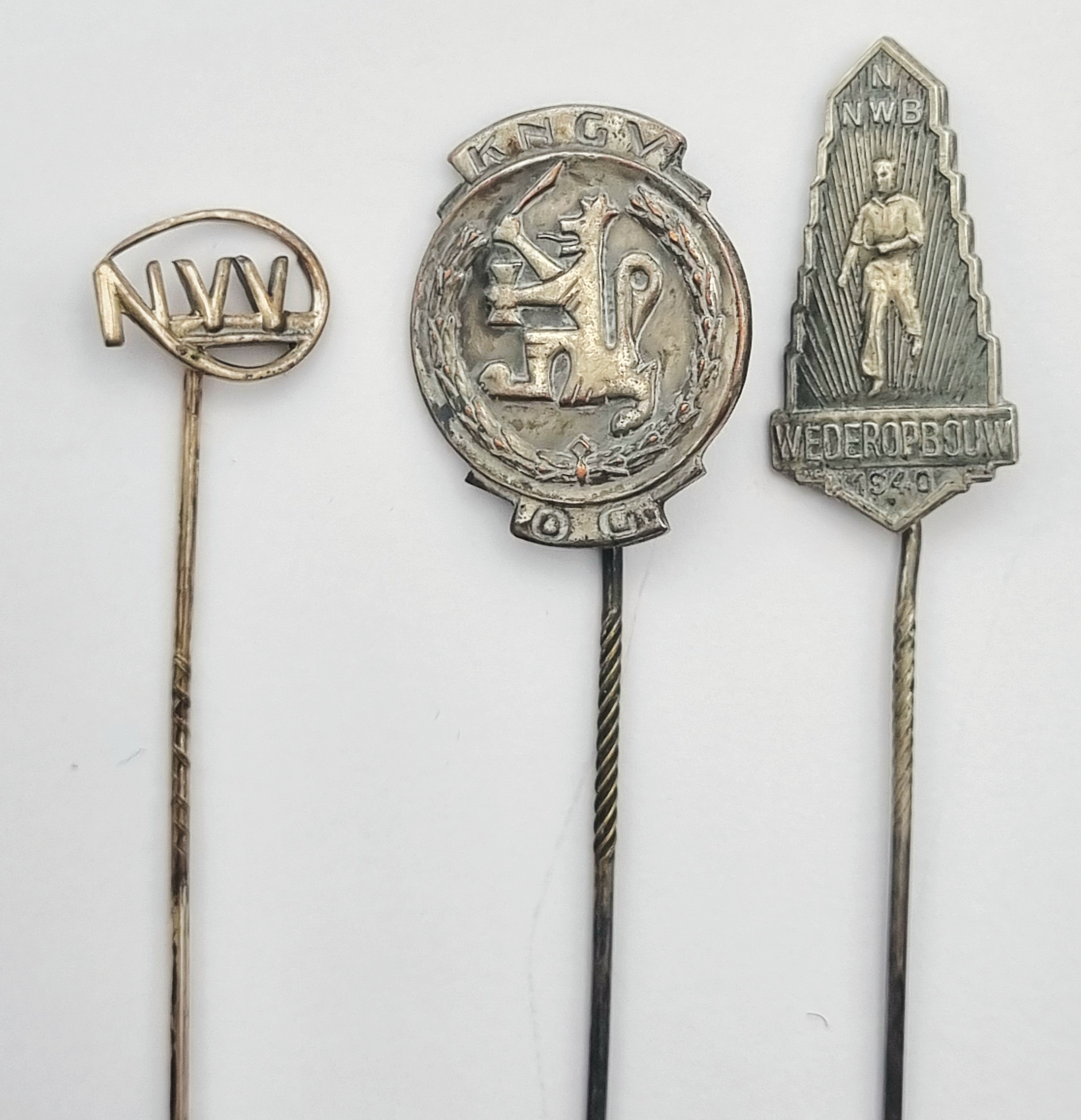 Verzameling speldjes van diverse Nederlandse organisaties, waaronder een zilveren NNWB-speldje Wederopbouw 1940 en gouden FNV-jubileumspeldjes gemerkt 585. De diverse speldjes zijn vervaardigd uit edelmetaal en messing. Gedateerd 1940–1985 en een Nederlandse herkomst. Geïnteresseerd? Bezoek onze kijkdagen op 10, 11 en 12 april van 11:00 tot 17:00 uur! |