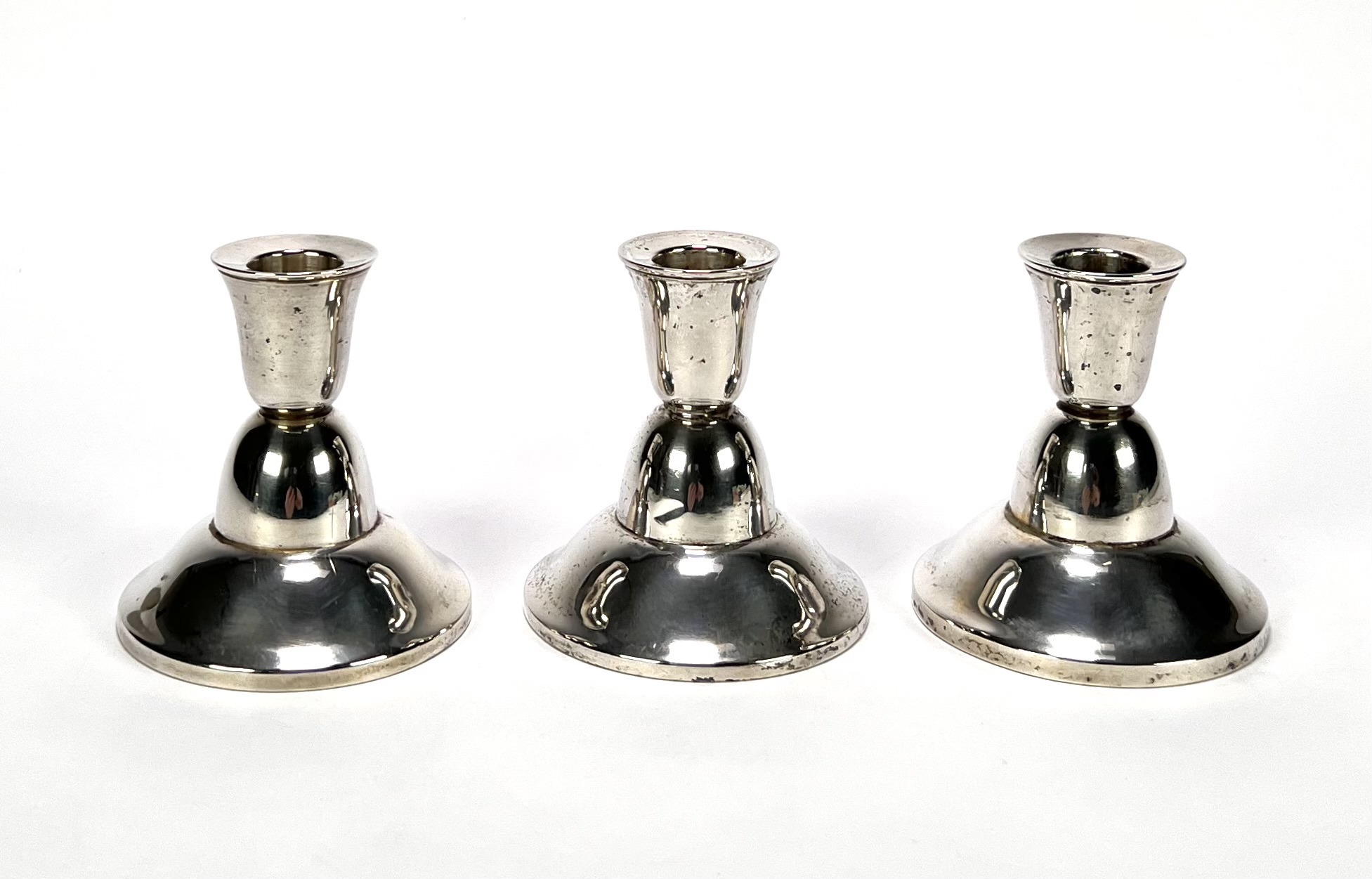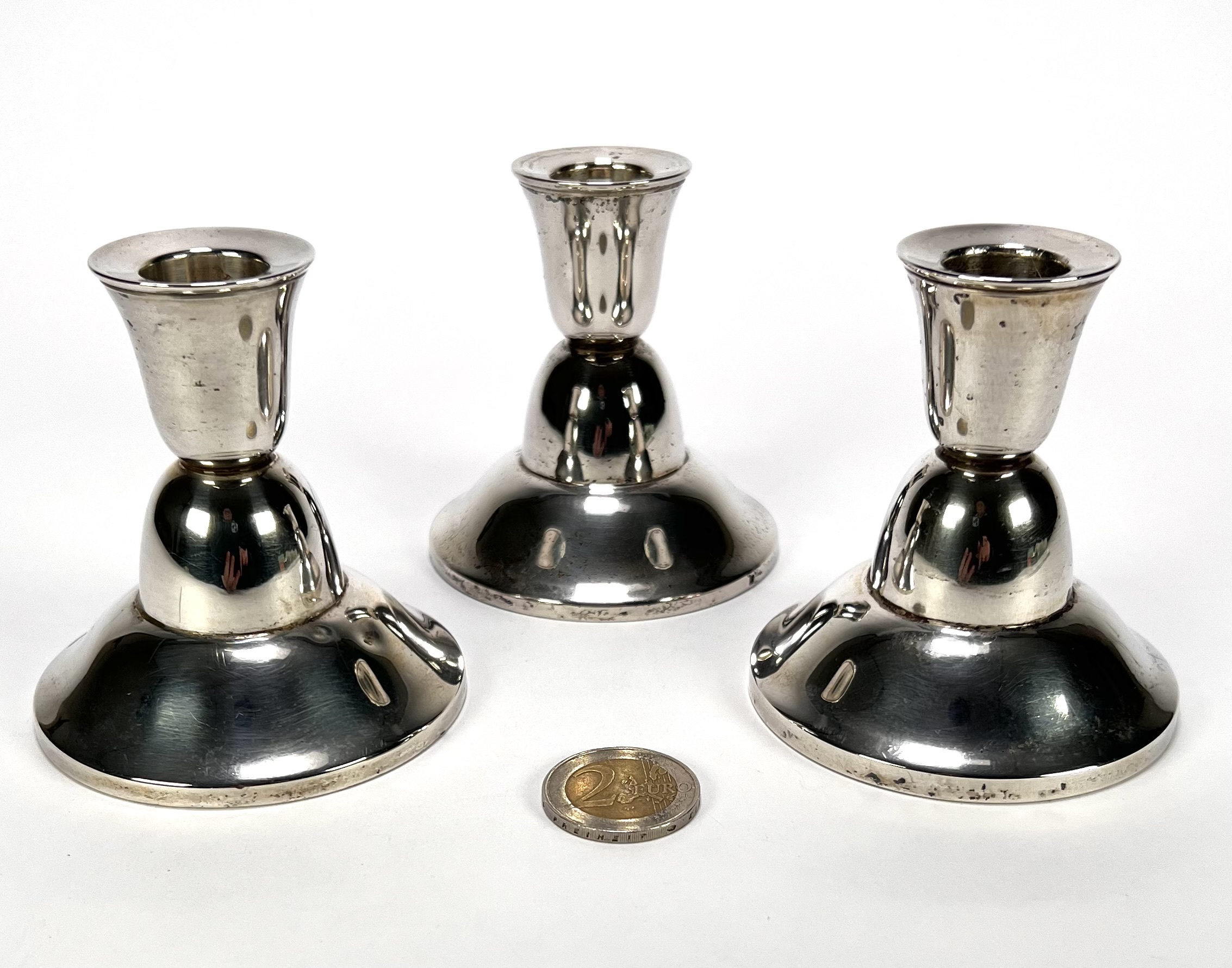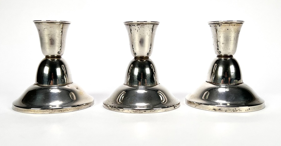 Drie zilveren 835/1000 kandelaren uitgevoerd als lage exemplaren met gewelfde ronde voet, ingesnoerde balusterschacht en uitlopende kaarsvetvanger. De kandelaren hebben een verzwaarde voet, gemerkt met zwaardje, datering tweede helft 20e eeuw. Klaar om te bieden? Registreer je nu en doe mee aan de veiling! |