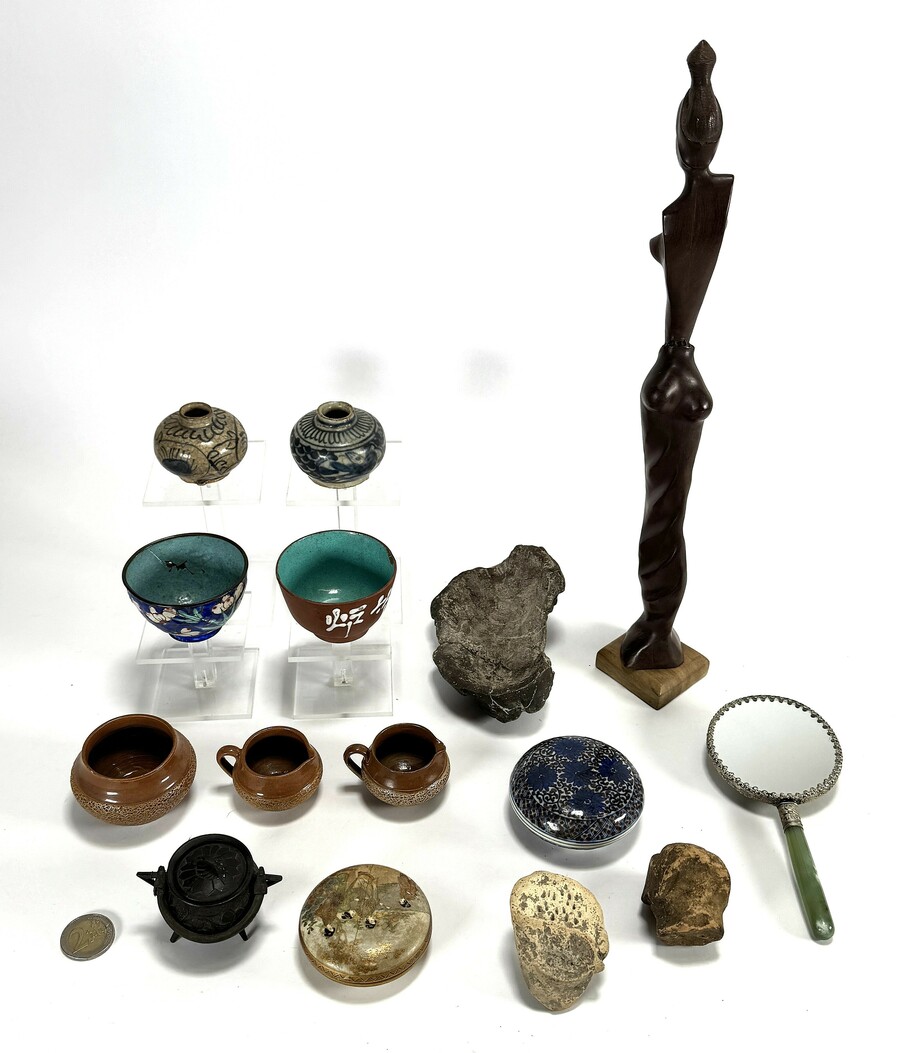 Lot curiosa uit de 20e eeuw, vervaardigd uit porselein, ebbenhout en messing. De verzameling bevat onder andere Chinees exportporselein, een handspiegel met jade handgreep en een ebbenhouten gestileerde vrouwenfiguur. De diverse verzameling dateert uit de periode 1900-1970. Geïnteresseerd? Bezoek onze kijkdagen op 10, 11 en 12 april van 11:00 tot 17:00 uur! |