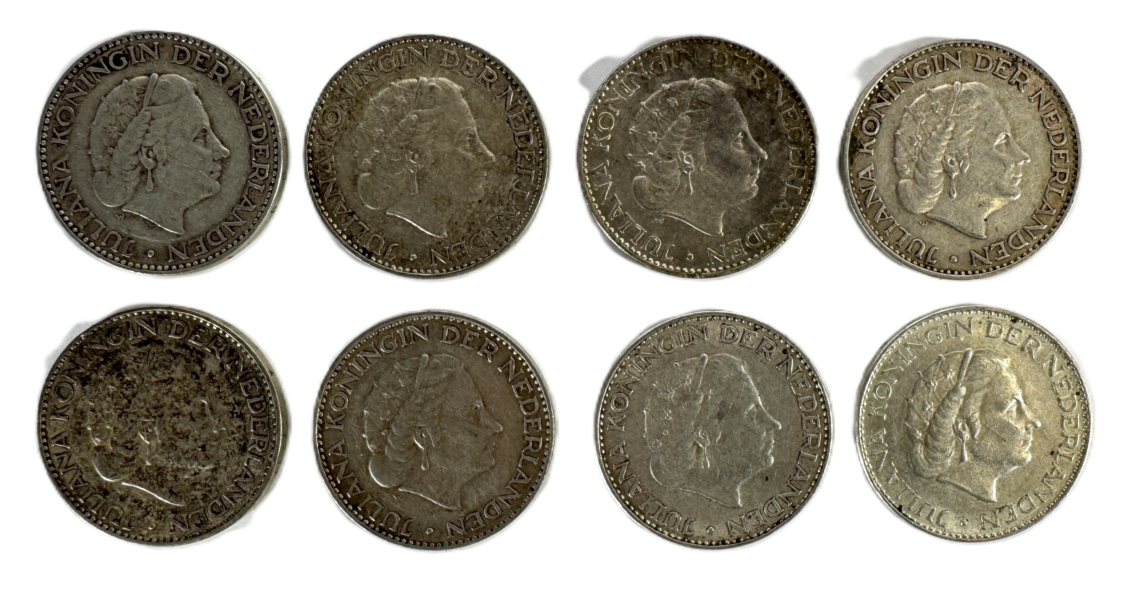 Zilveren guldens van de Koninklijke Nederlandse Munt vervaardigd uit zilver (720/1000) en geslagen met gekartelde rand. De kavel omvat acht munten uit de jaren 1954, 1955 (2x), 1957, 1958 (2x) en 1965 (2x), met het portret van Koningin Juliana door L.O. Wenckebach en het gekroonde rijkswapen op de keerzijde. Wil je direct deelnemen? Plaats vanaf 3 april alvast een schriftelijk bod via onze website! |
