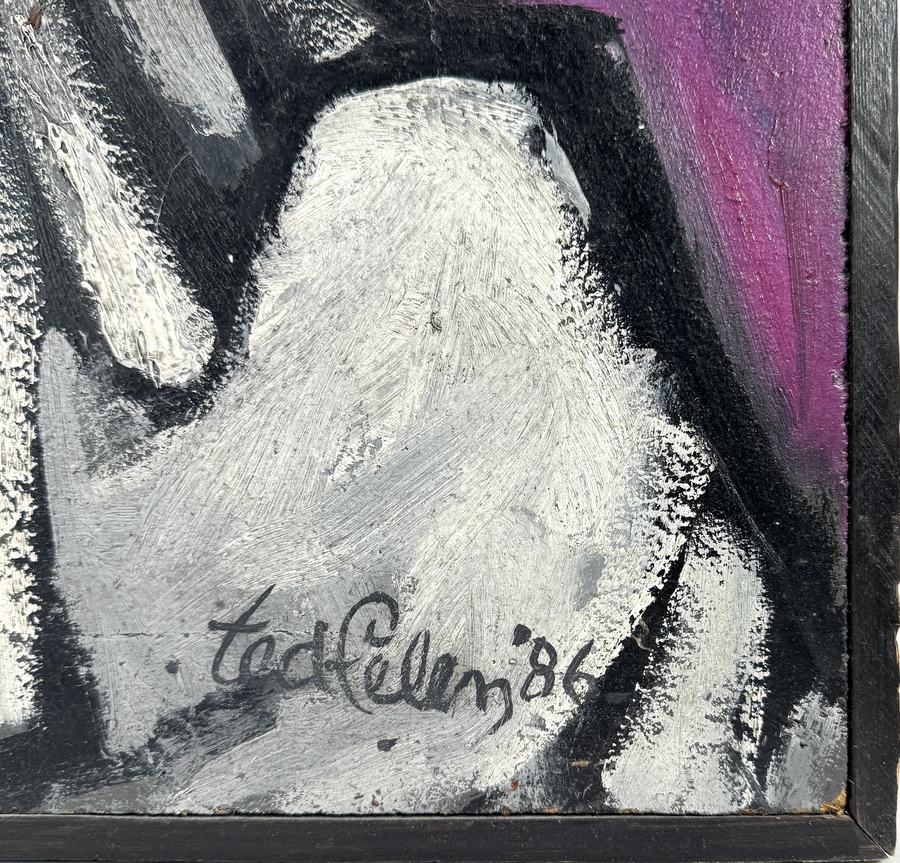 Schilderij door Ted Felen (1931–2016) getiteld “Ecce Homo VI – De Plaatsvervanger. Kermis der ijdelnijd” in expressionistische stijl, acrylverf op paneel. De frontale Christusfiguur met doornenkroon is opgebouwd uit scherpe zwarte contouren en contrasterende vlakken in wit en paars tegen een paarsrode achtergrond. Gesigneerd en gedateerd rechtsonder, verso gesigneerde sticker. Dit schilderij dateert uit 1986 en heeft een Nederlandse herkomst. Registreer nu en bied eenvoudig online mee op dit schilderij! |