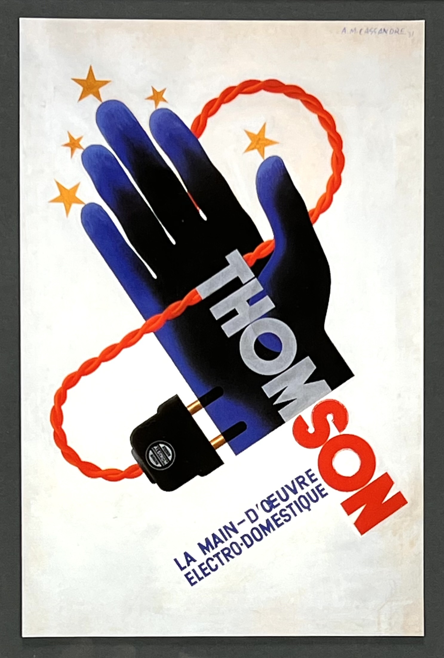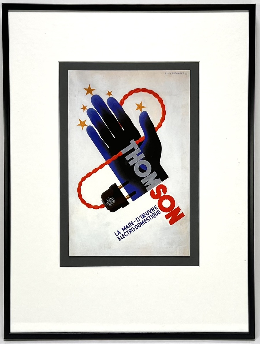 Affiche van A.M. Cassandre (1901–1968) toont een gestileerde blauw-zwarte hand met elektrische stekker en rode gevlochten kabel in Art Deco stijl, gedrukt op papier naar het ontwerp uit 1931. In de plaat gesigneerd rechtsboven “A.M. Cassandre 31”. De herdruk dateert uit eind 20e eeuw en heeft een Franse herkomst. Het affiche zelf beoordelen? Je bent welkom op onze kijkdagen op 10, 11 en 12 april! |