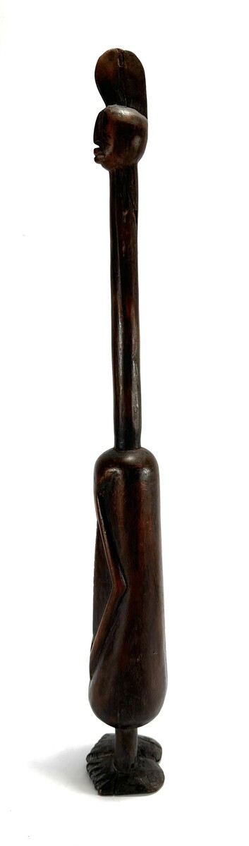 Houten Oost-Afrikaanse figuur met twee houten armbanden en twee metalen armbanden, eind 20e eeuw, uitgevoerd in donker hout en metaal. Het slanke staande beeld rust op een gesneden voet; de lange hals en het kleine hoofd geven het geheel een geabstraheerd silhouet. Geïnteresseerd? Bezoek onze kijkdagen op 10, 11 en 12 april van 11:00 tot 17:00 uur! |