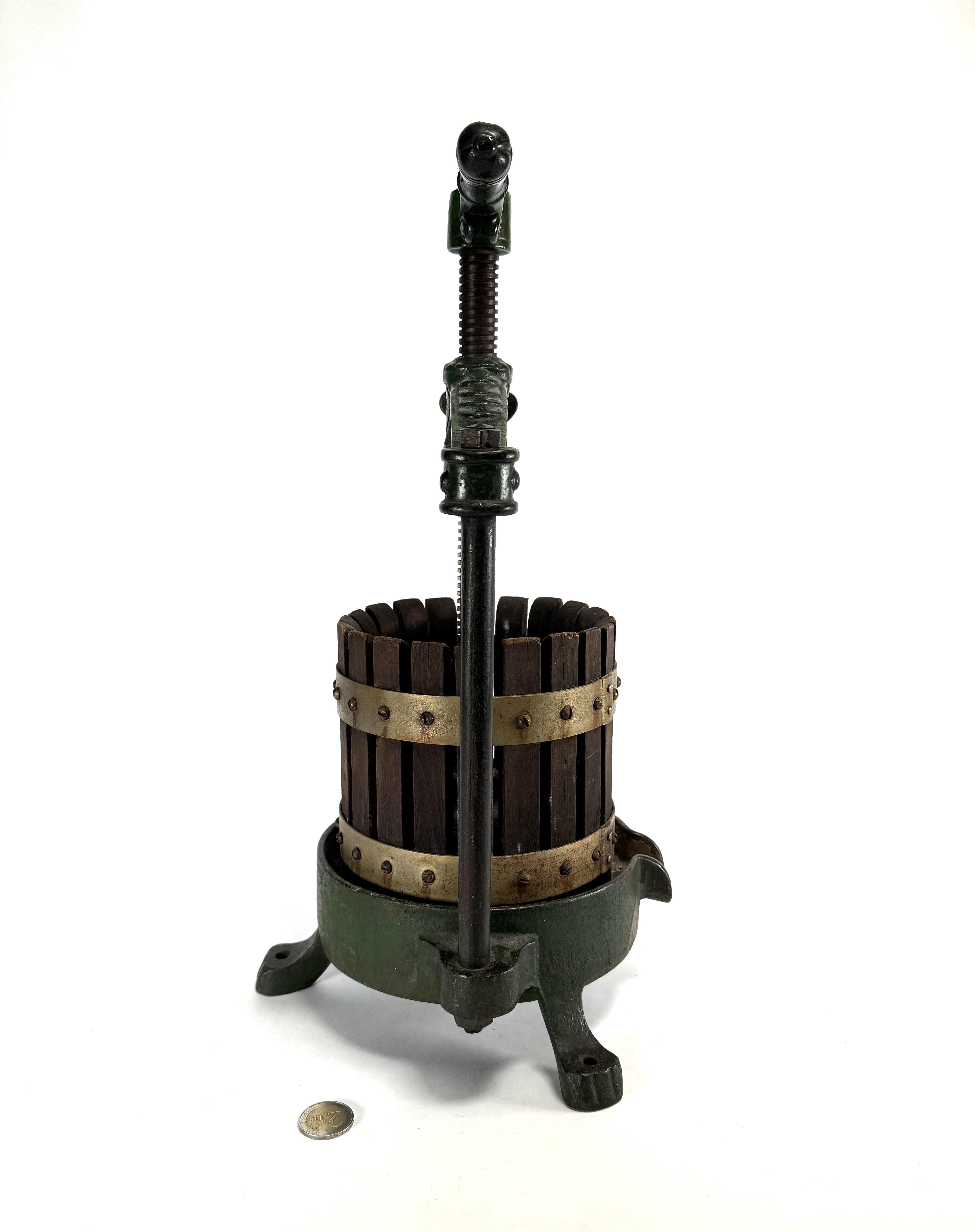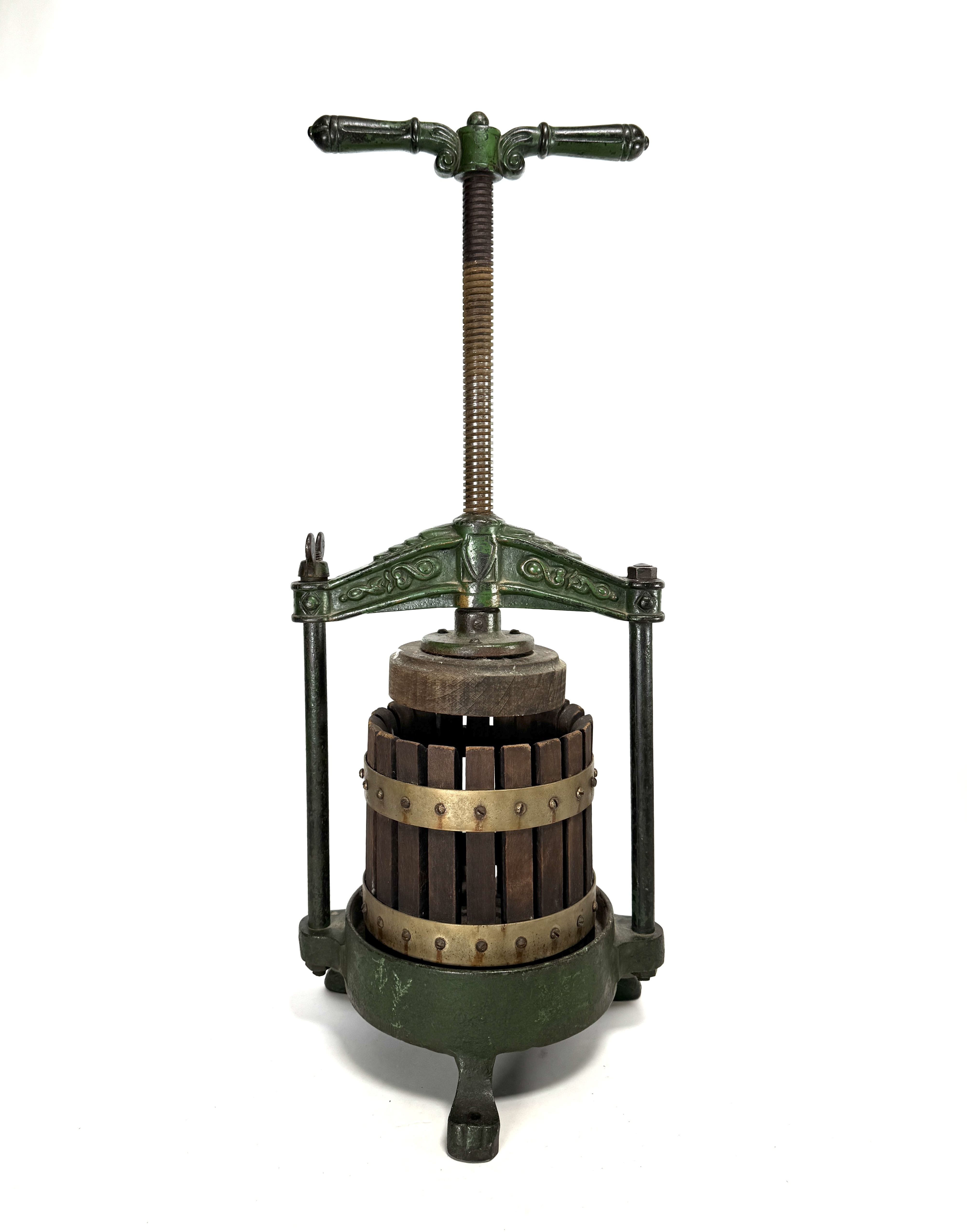 Antieke fruitpers in industriële stijl, vervaardigd uit gietijzer en hout met gegoten en samengestelde constructie. De pers heeft een hoge centrale schroefspindel met dwarsgreep, een cilindrische korf van houten duigen en een opengewerkt frame op vier uitgebogen voeten. De fruitpers dateert uit het het begin van de 20e eeuw en heeft een Europese herkomst. Zeker zijn van deelname? Plaats vanaf 3 april een schriftelijk bod online! |