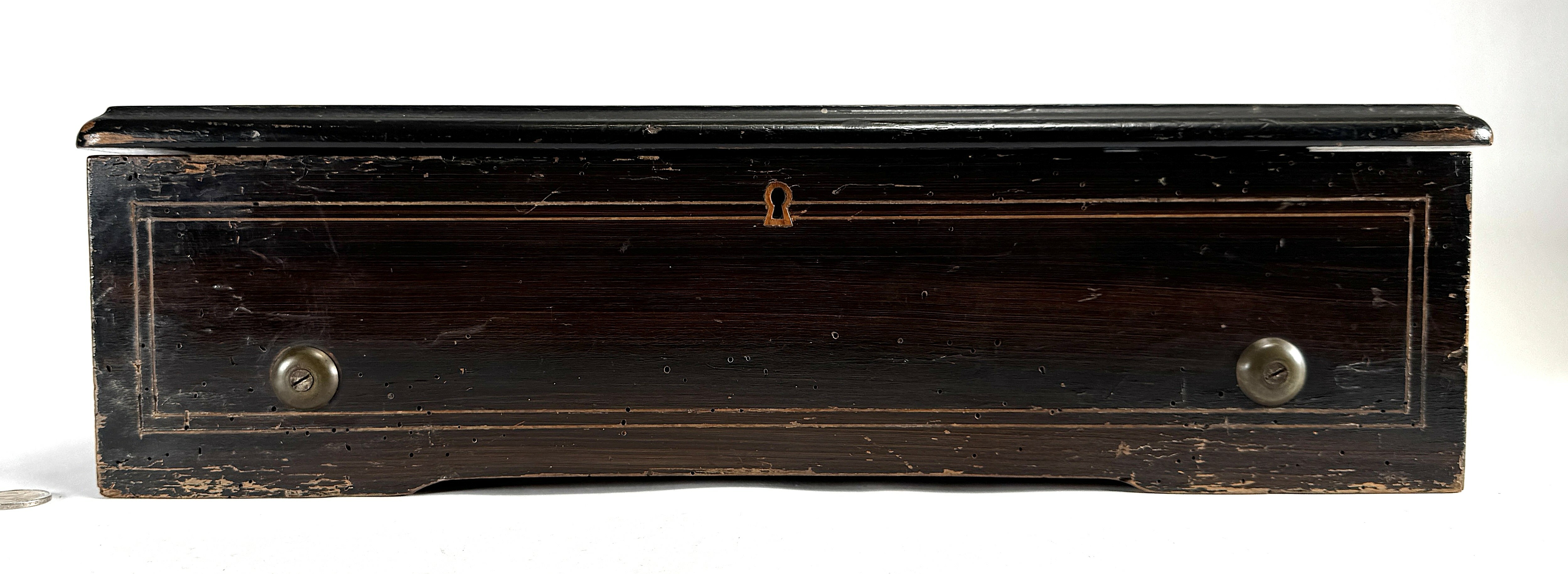 Muziekdoos van Zwitserse makelij uit de late 19e eeuw, vervaardigd uit geëboniseerd vruchtenhout met verfijnd florale intarsia op het deksel. De binnenzijde toont de originele lithografische titellijst met tien operastukken en de messing rol onder glas. Klaar om te bieden? Registreer je nu en doe mee aan de veiling! |