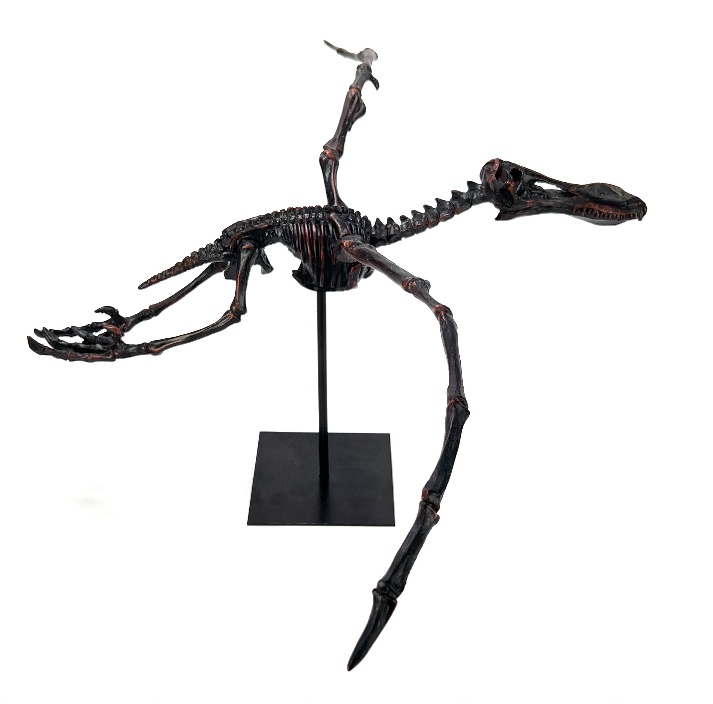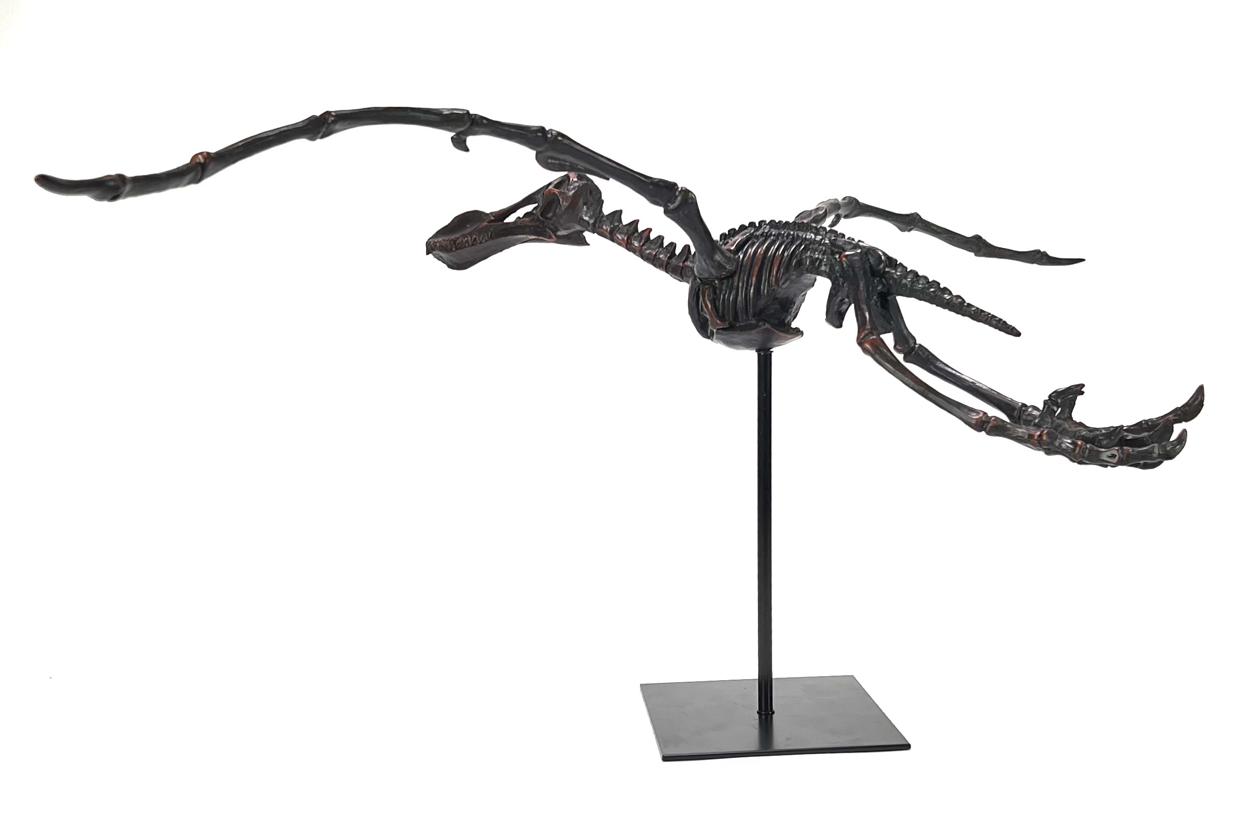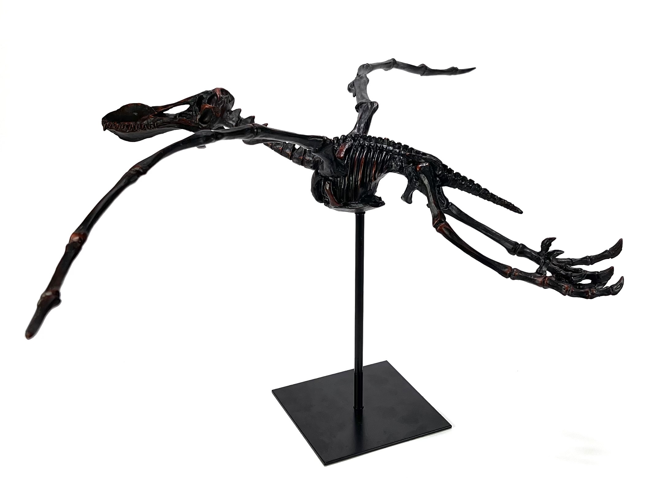 Archaeopteryx skelet, vervaardigd uit polychroom beschilderde kunststof op een zwarte metalen standaard. De weergave toont de kenmerken van de vliegende dinosauriërs, waaronder de lange staartwervels en de klauwen aan de vleugels. De uitvoering is gemonteerd in een dynamische vlieghouding. De vogel dateert uit de 20e eeuw en heeft een herkomst in Europa. Geïnteresseerd? Bezoek onze kijkdagen op 10, 11 en 12 april van 11:00 tot 17:00 uur! |