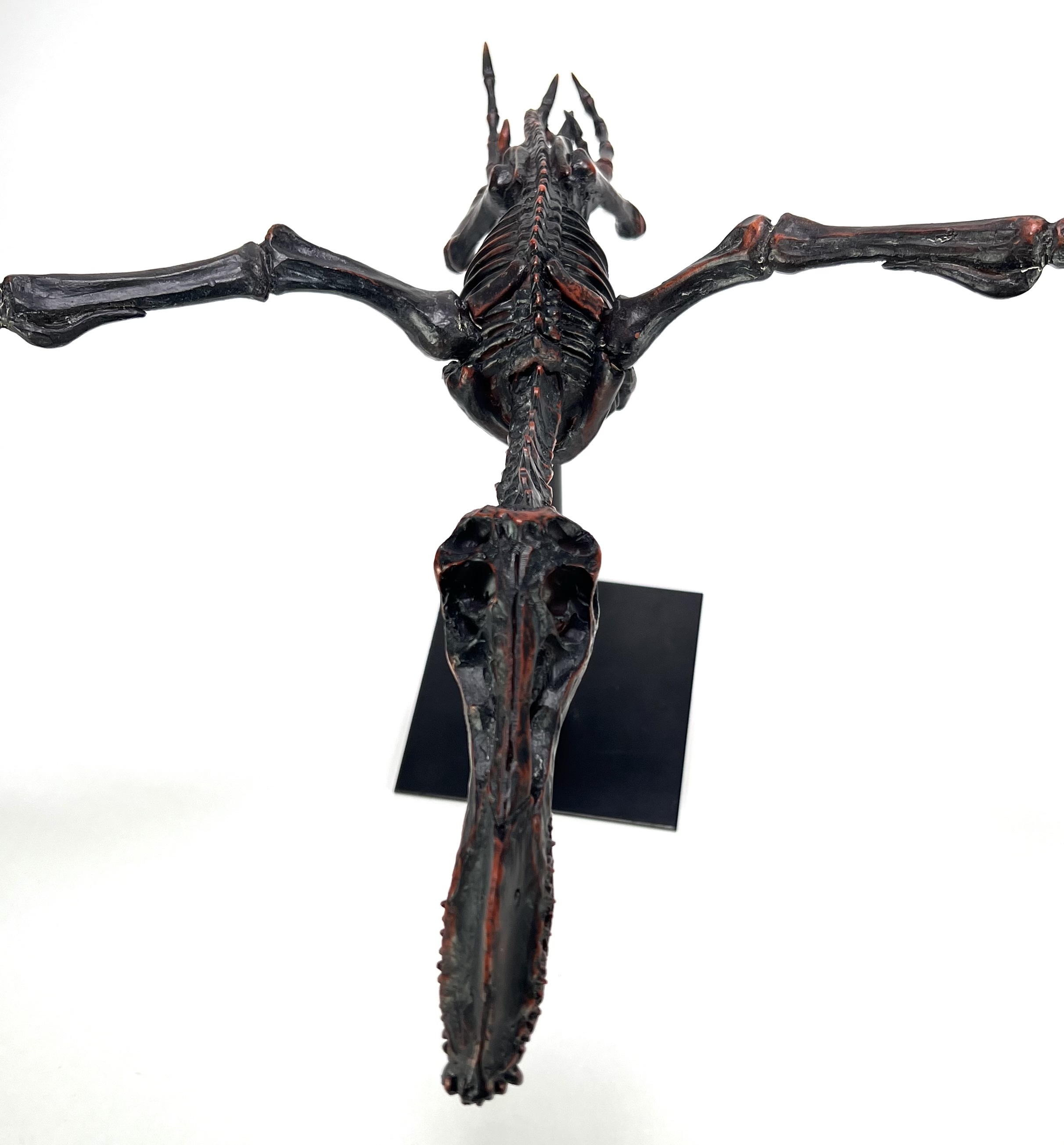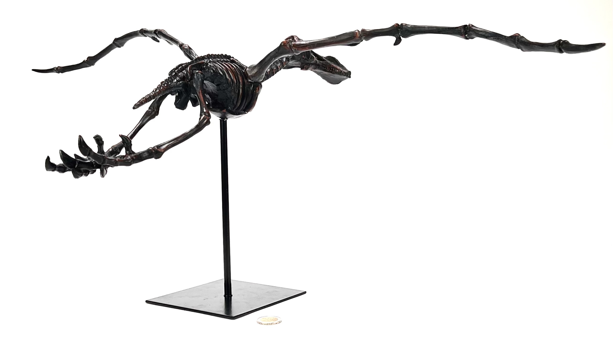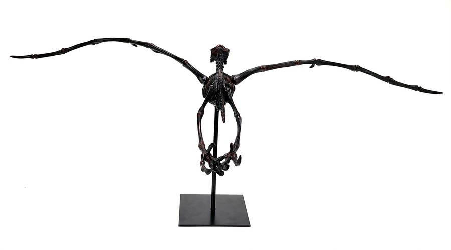 Archaeopteryx skelet, vervaardigd uit polychroom beschilderde kunststof op een zwarte metalen standaard. De weergave toont de kenmerken van de vliegende dinosauriërs, waaronder de lange staartwervels en de klauwen aan de vleugels. De uitvoering is gemonteerd in een dynamische vlieghouding. De vogel dateert uit de 20e eeuw en heeft een herkomst in Europa. Geïnteresseerd? Bezoek onze kijkdagen op 10, 11 en 12 april van 11:00 tot 17:00 uur! |
