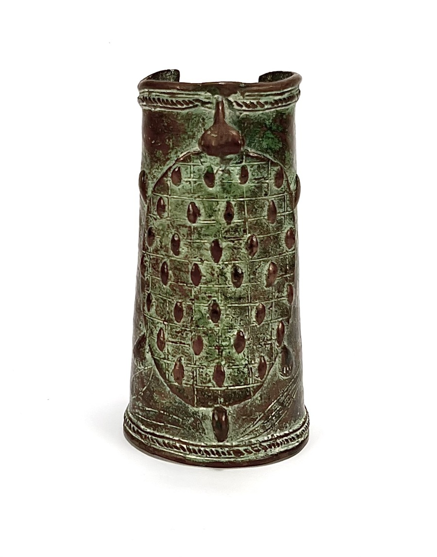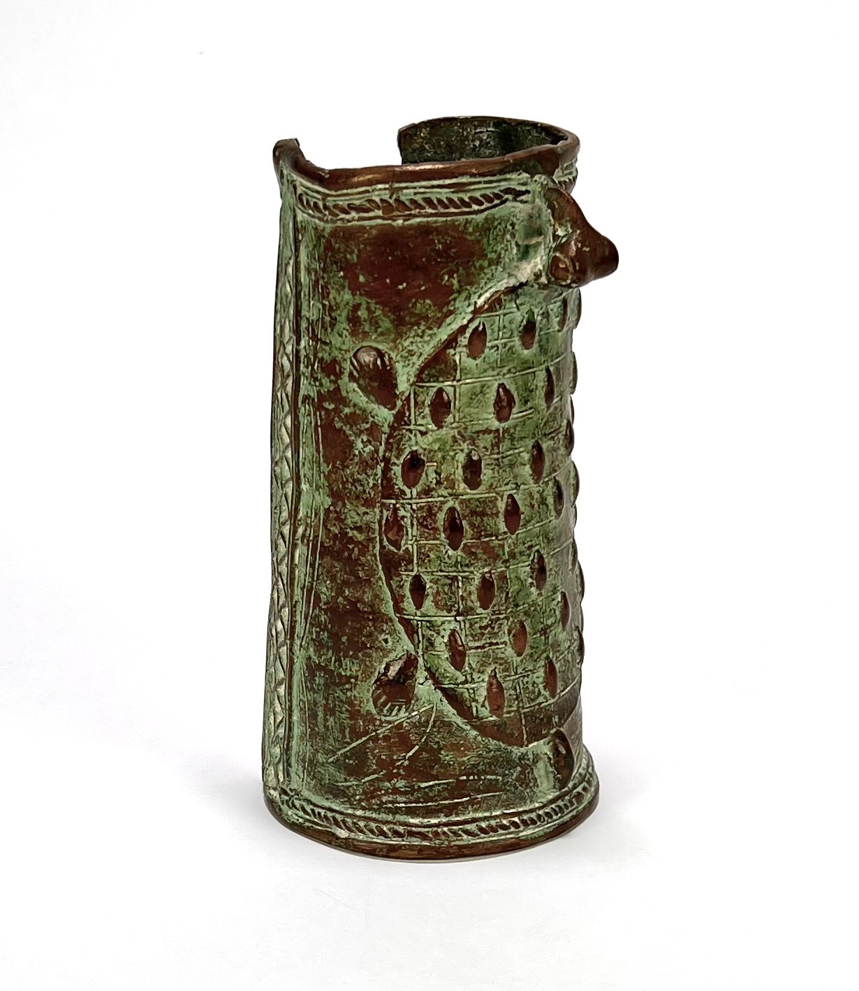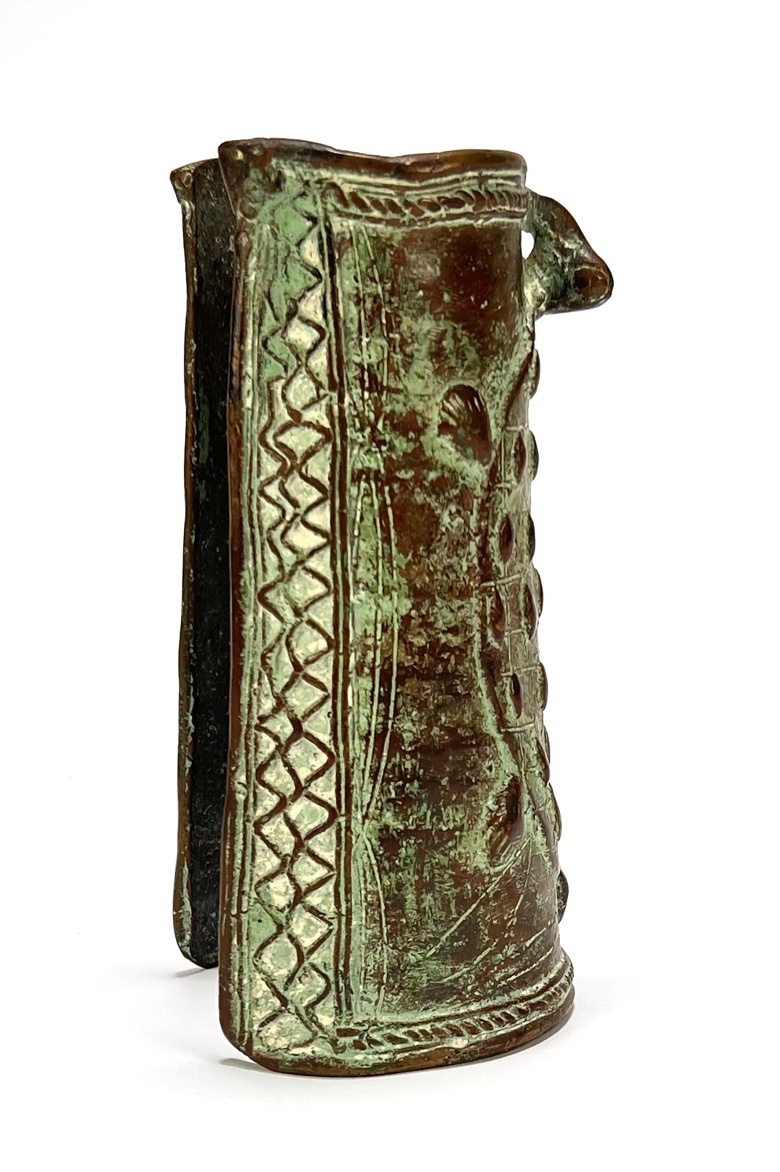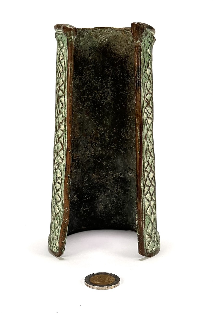Benin armband uit Nigeria, midden 20e eeuw, uitgevoerd in gegoten messing middels de verloren wastechniek. De cilindrische vorm toont een complex opengewerkt decor van geometrische patronen en gestileerde reliëf elementen, kenmerkend voor de hofkunst van het Benin Koninkrijk. Dit type sieraad diende historisch als prestigieus status object binnen de koninklijke regalia. Eerst deze armband zien voordat je biedt? Bezoek onze kijkdagen op 10, 11 en 12 april! |