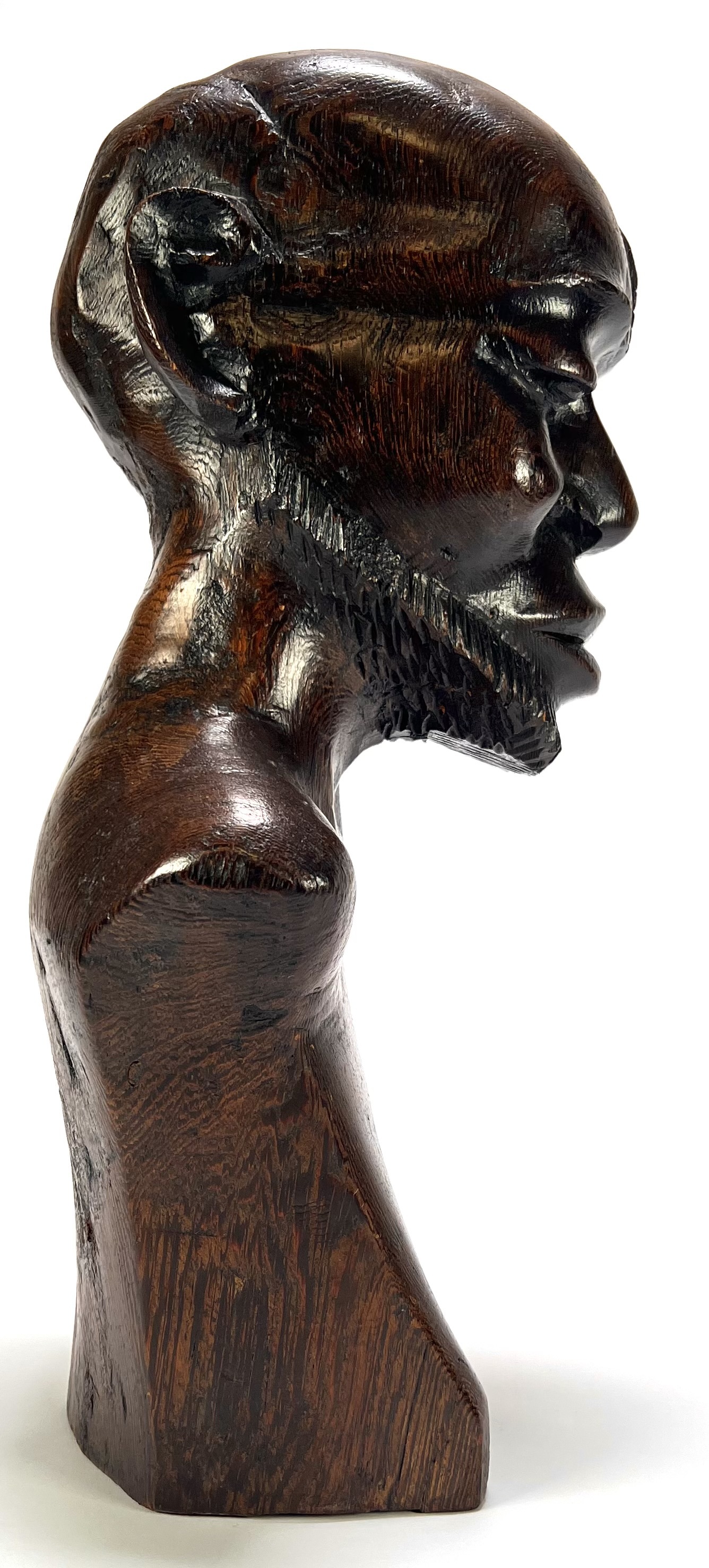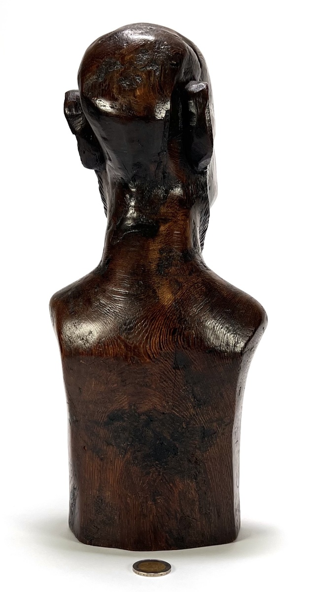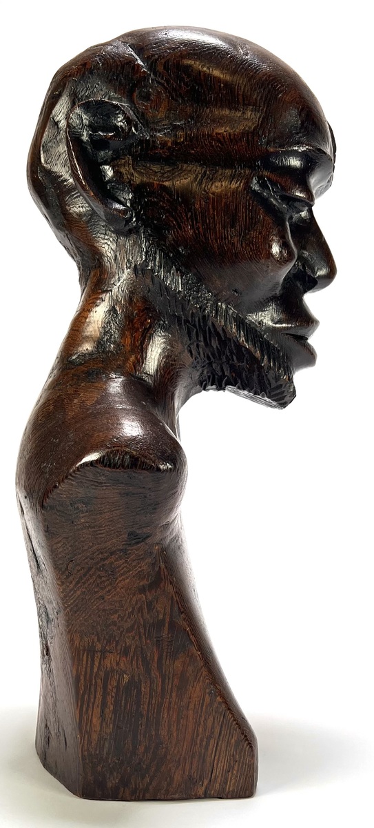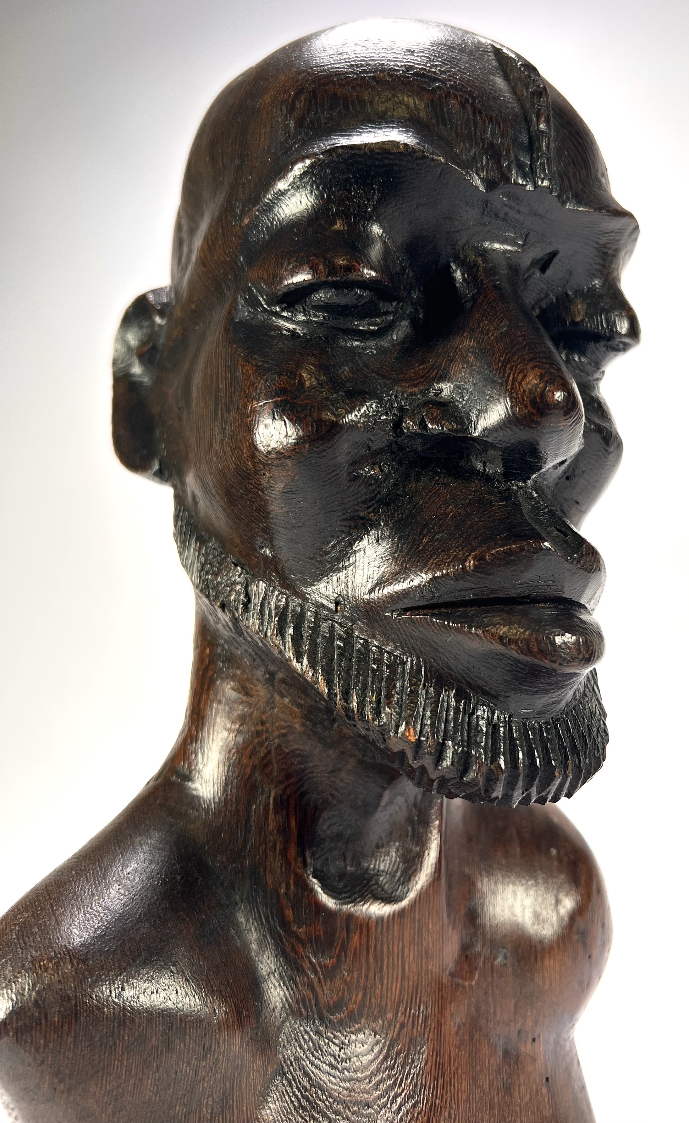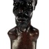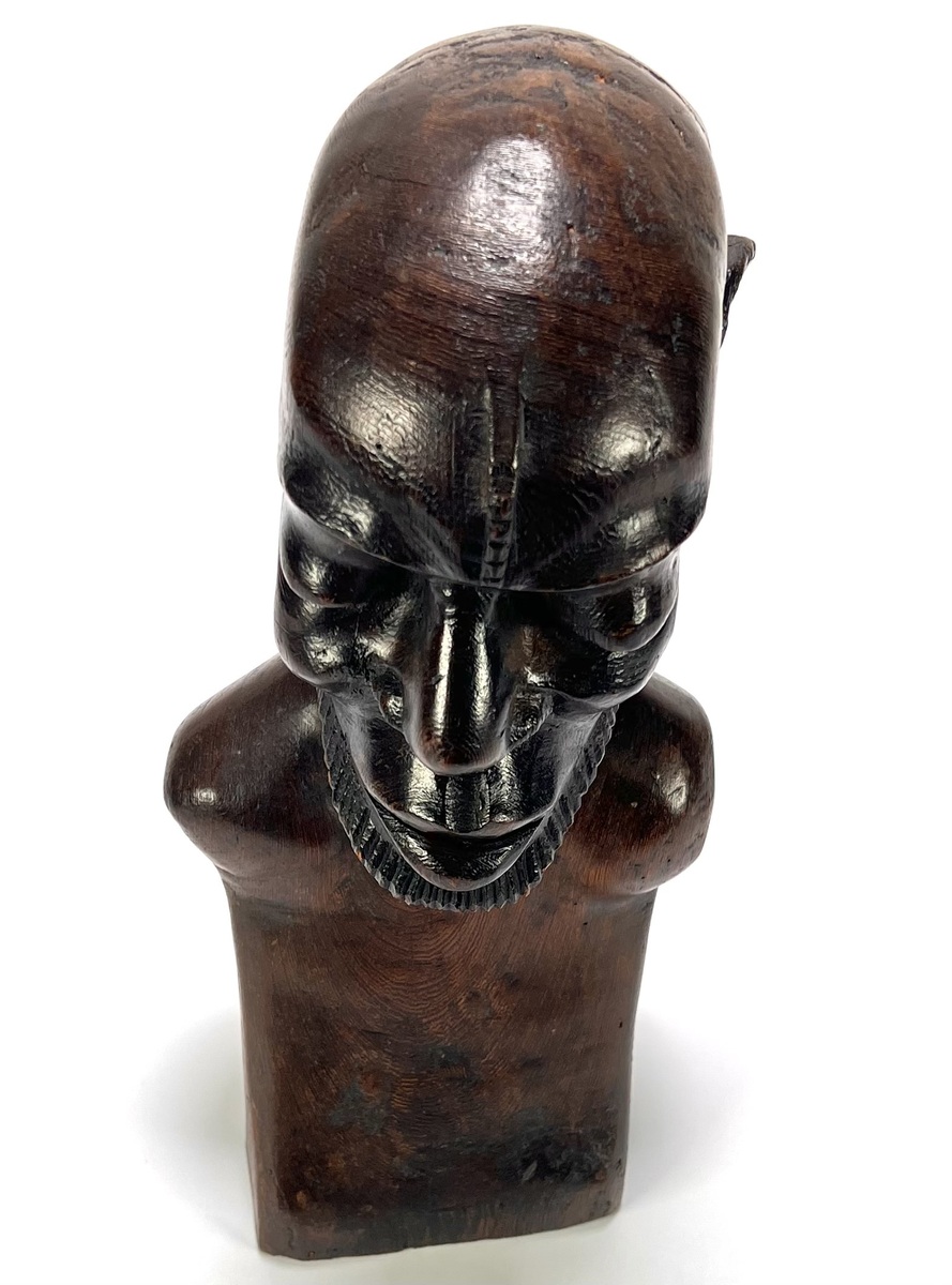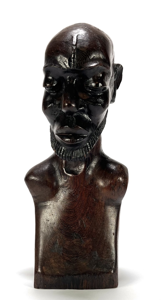 Makonde beeld uit Tanzania, late 20e eeuw, handgesneden uit donker gepolijst hardhout. Het mannelijke figuur toont naturalistische gelaatstrekken met een gestileerde baard en karakteristieke lineaire scarificatie op het hoge voorhoofd. De diepe, glanzende patina en het vakmanschap zijn kenmerkend voor de Makonde-stijl. Klaar om te bieden? Registreer je nu en doe mee aan de veiling! |