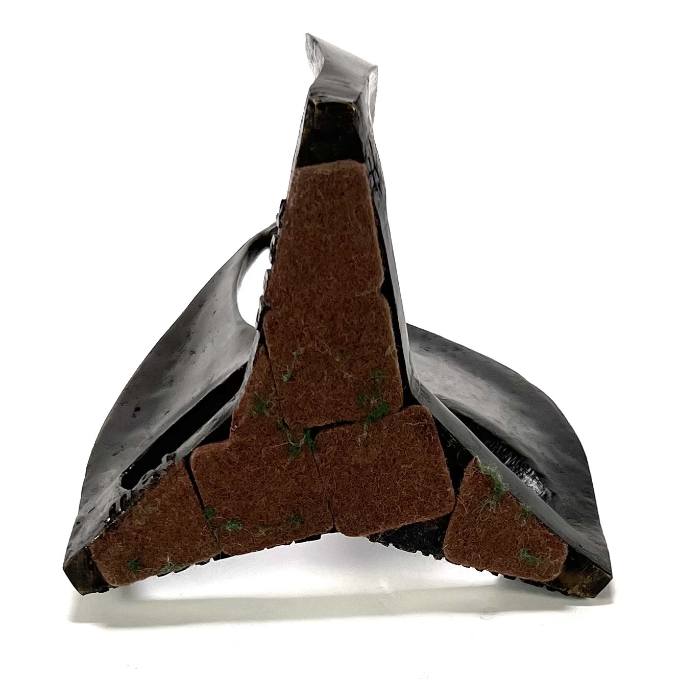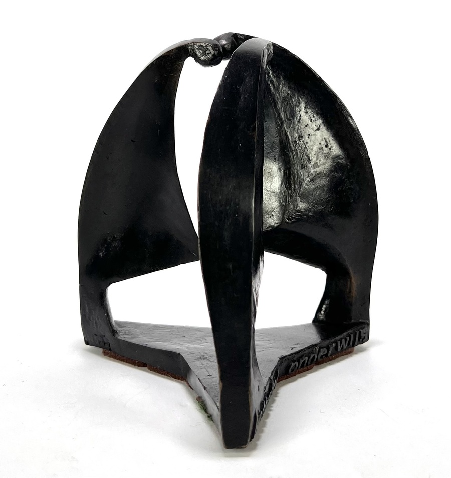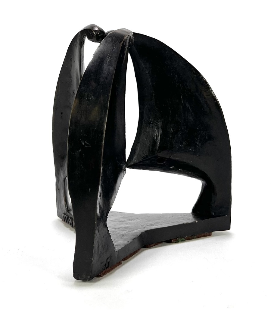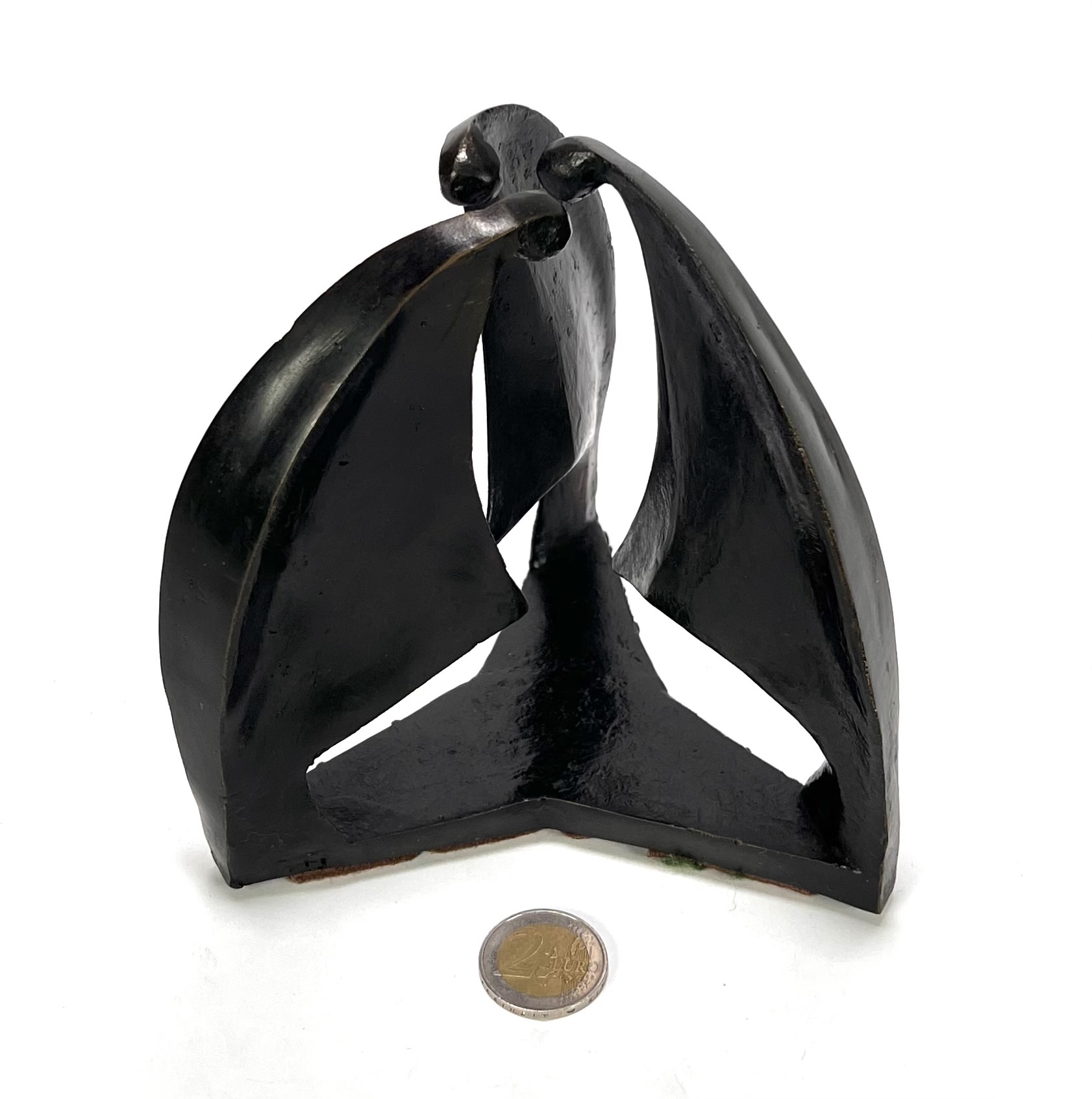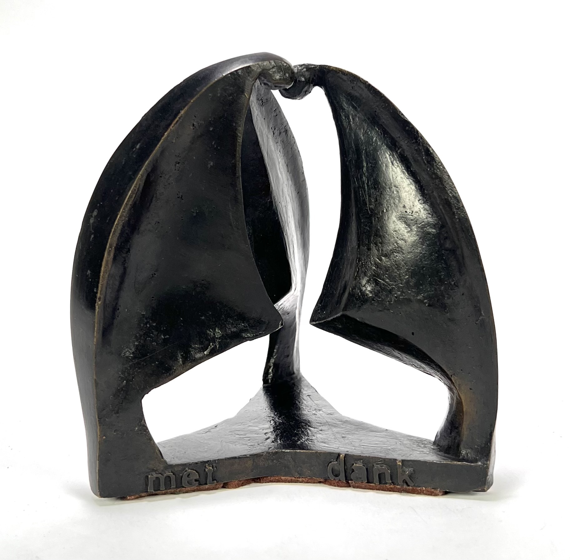 Beeld in modernistische stijl, vervaardigd uit brons met een donkerbruine patine. Het beeld toont een abstracte compositie van drie geabstraheerde mensen die vanuit een driehoekige basis omhoog reiken. De voet is voorzien van de gegoten tekst "met dank aan het Katholiek onderwijs". Het beeld dateert uit circa 1980 en heeft een Nederlandse herkomst. Geïnteresseerd? Bezoek onze kijkdagen op 10, 11 en 12 april van 11:00 tot 17:00 uur. |