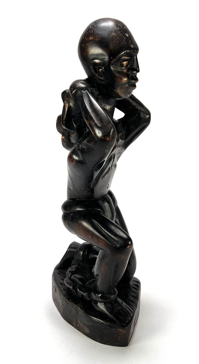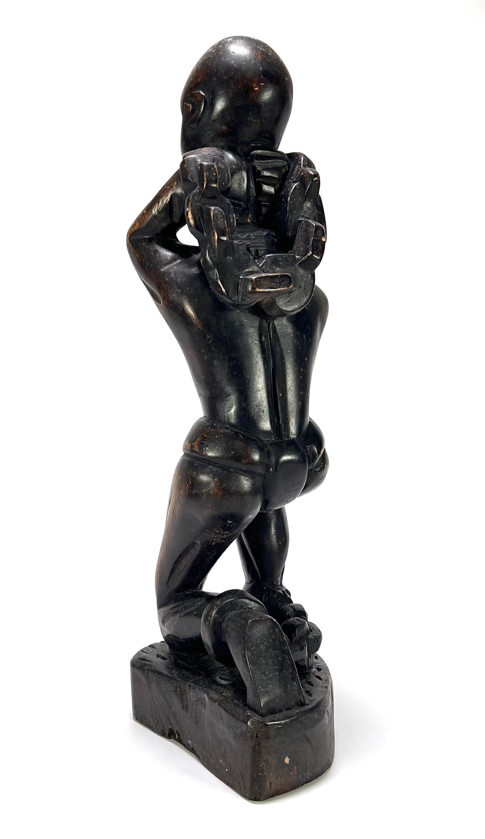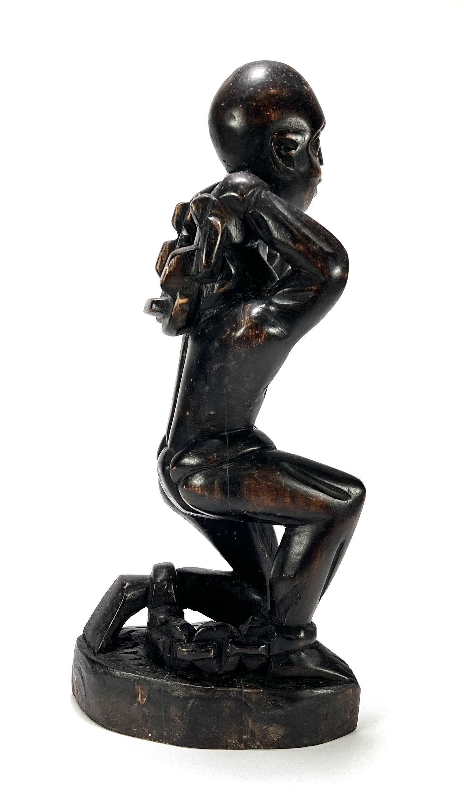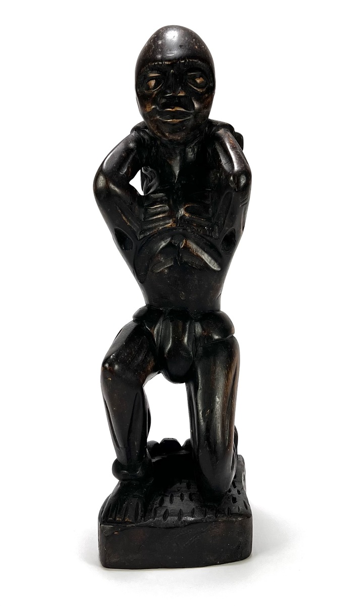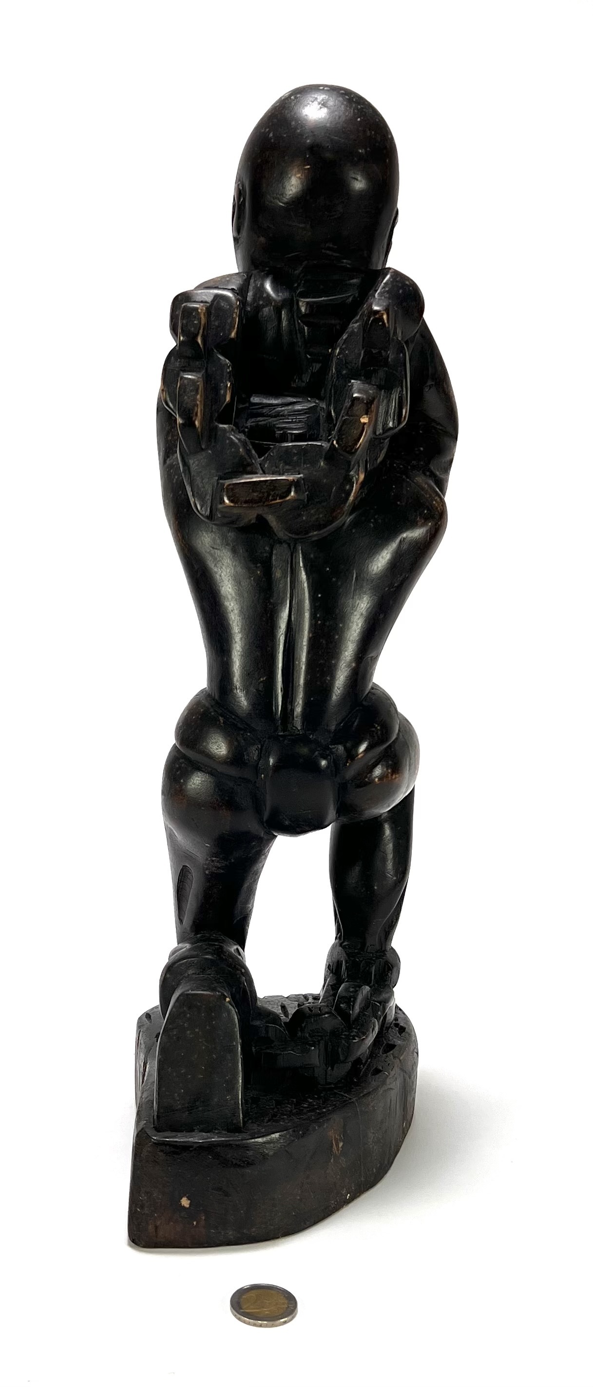 Baule beeld uit de Ivoorkust, uitgevoerd in hardhout met een donker gepolijste afwerking. Het beeld toont een knielend mannelijke figuur, datering late 20e eeuw en een Afrikaanse herkomst. Klaar om te bieden? Registreer je nu en doe mee aan de veiling! |