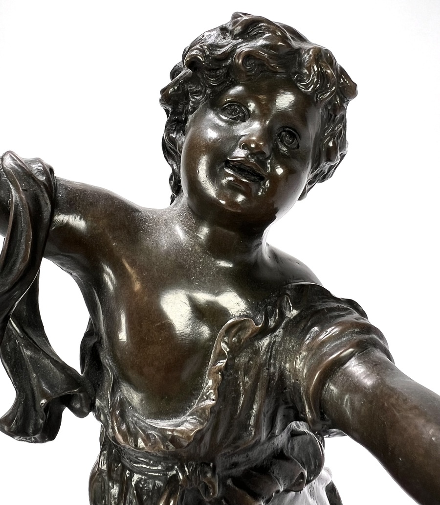 Beeld in Art Deco stijl, vervaardigd uit brons met gegoten en geciseleerde afwerking, geplaatst op rond marmeren basement met geprofileerde rand. Het beeld toont een vrolijk kind in een dynamische, dansende pose met vloeiende draperieën. Gemerkt aan de onderzijde met “Bronze J.B. Déposé Garanti Paris”. Daterend 20e eeuw en herkomst Frankrijk. Geïnteresseerd? Bezoek onze kijkdagen op 10, 11 en 12 april van 11:00 tot 17:00 uur! |