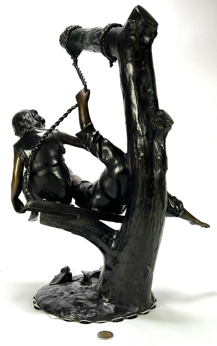 Beeld in de stijl van de Franse school, vervaardigd uit messing met een donkerbruine patina middels giettechniek. Het beeld toont een jongen en meisje op een schommel bevestigd aan een boomstam met getordeerd touwwerk. De figuratieve weergave is typerend voor de romantische beeldhouwkunst rond de eeuwwisseling. Het beeld dateert uit de eerste helft van de 20e eeuw en heeft een herkomst in Frankrijk. Klaar om te bieden? Registreer je nu en doe mee aan de veiling! |