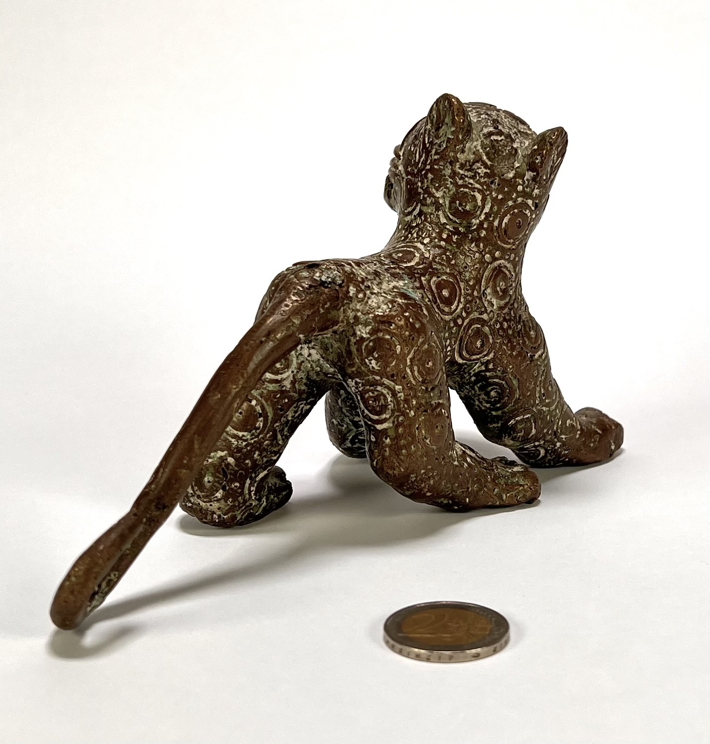 Benin-stijl beeld uit Nigeria, midden 20e eeuw, uitgevoerd in brons met de verloren wastechniek. Het lopende luipaard toont rozetvormige stippen in reliëf over het gehele corpus. De bek met ontblote tanden en de sierlijk gekrulde staart zijn elementen binnen de Beninkunst. De donkere patina met lichte oxidatie wijst op een gietsel uit de traditie van het Edo volk. Dit beeld zelf beoordelen? Je bent welkom op onze kijkdagen op 10, 11 en 12 april! |