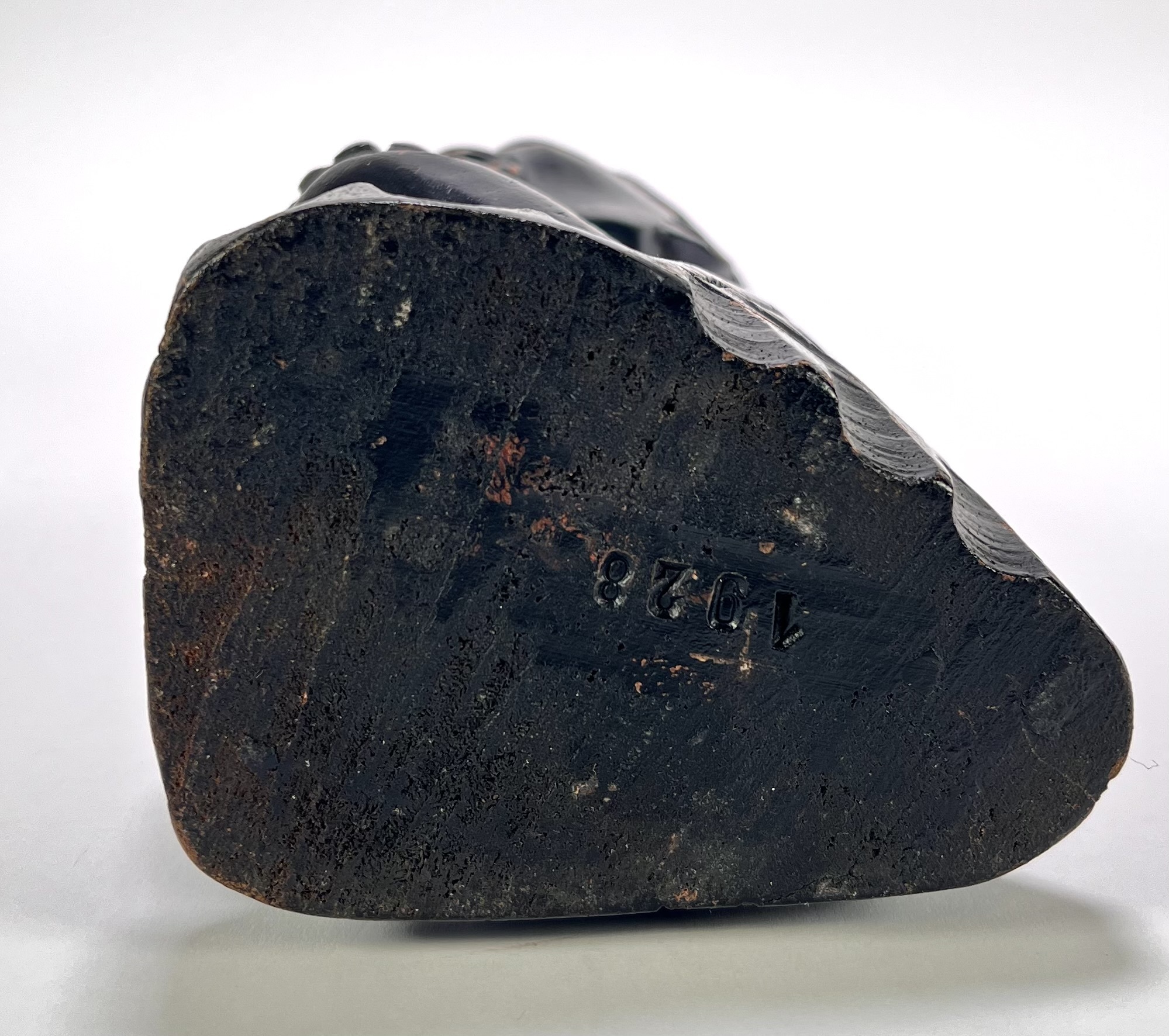 Makonde beeld uit Tanzania, eind 20e eeuw, uitgevoerd in massief ebbenhout. De zittende figuur toont een gestileerd gezicht met geprononceerde jukbeenderen, amandelvormige ogen en een karakteristieke geometrische coiffure. De rugzijde is gedecoreerd met een herhalend gepunt patroon. Wil je direct deelnemen? Plaats vanaf 3 april alvast een schriftelijk bod via onze website! |