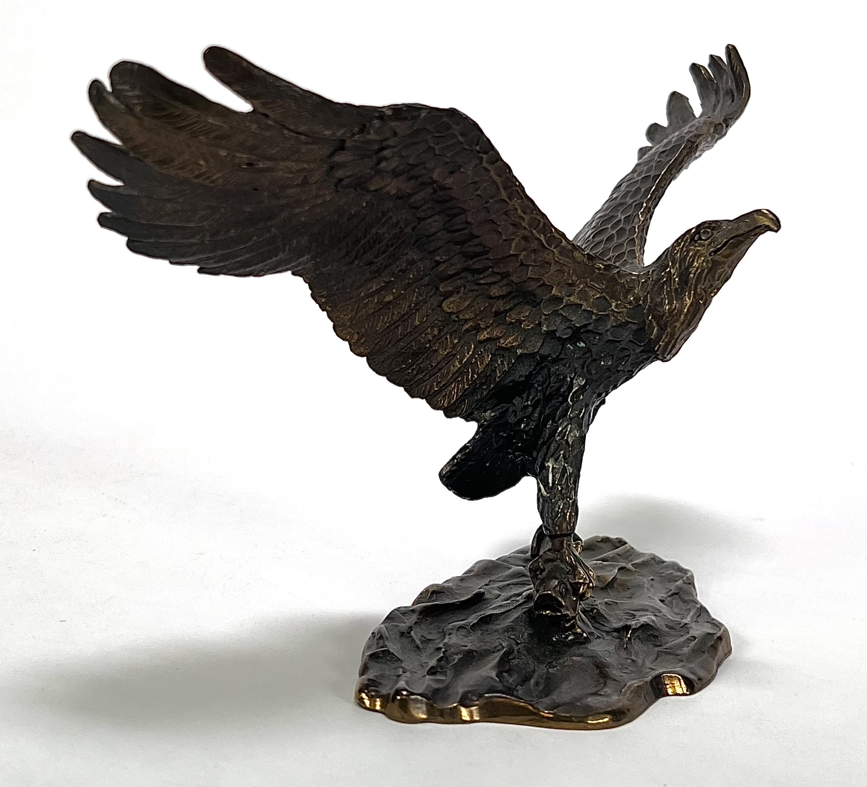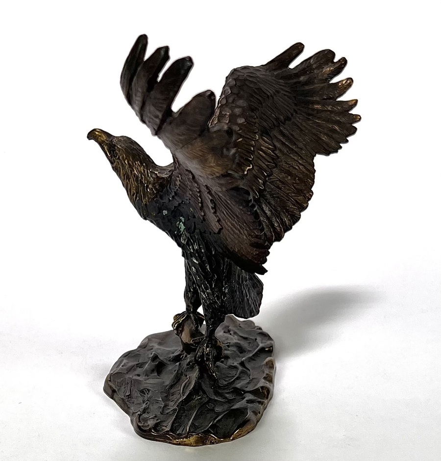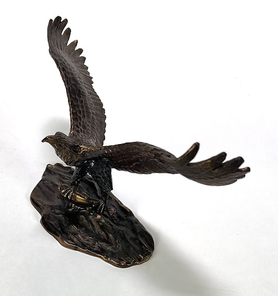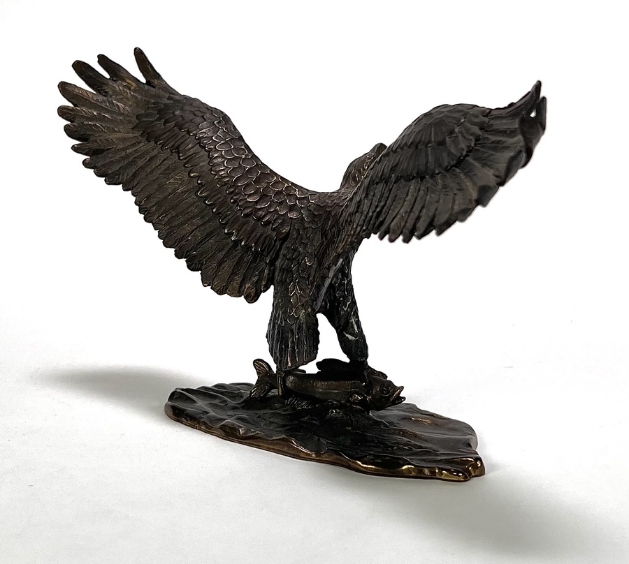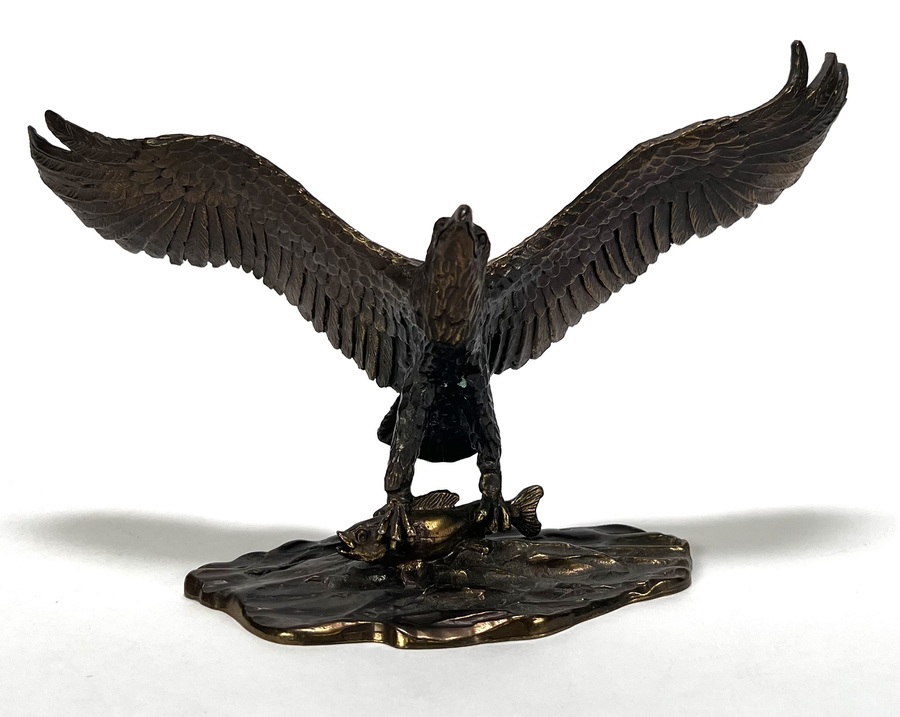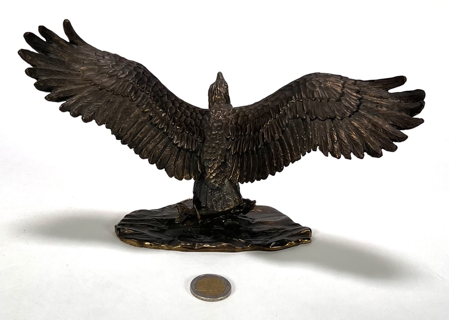 Bronzen beeld met gegoten en geciseleerde details. Het realistische beeld toont een zeearend met wijd uitgeslagen vleugels, staand op een rotsachtige basement met vis onder de klauwen, waarbij de veren in lagen zijn uitgewerkt. Aan de onderzijde gegraveerd met “1946-1996 Van den Herik- Sliedrecht, 50 jaar waterbouw, Sponsor WNF projekt Zeearend” en oplagenummer 86/750. Wil je direct deelnemen? Plaats vanaf 3 april alvast een schriftelijk bod via onze website! |