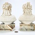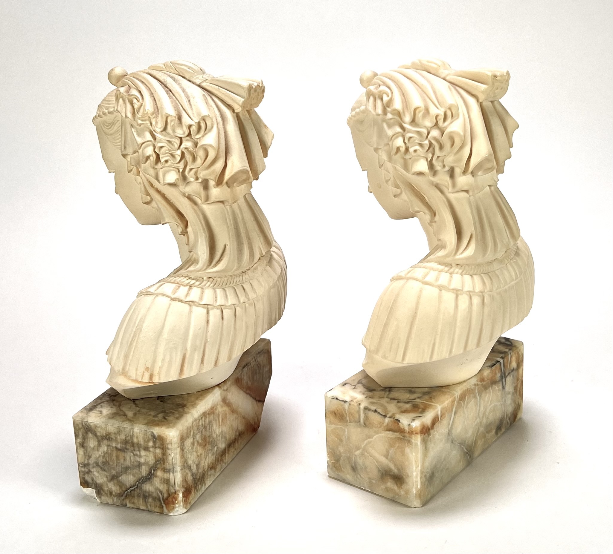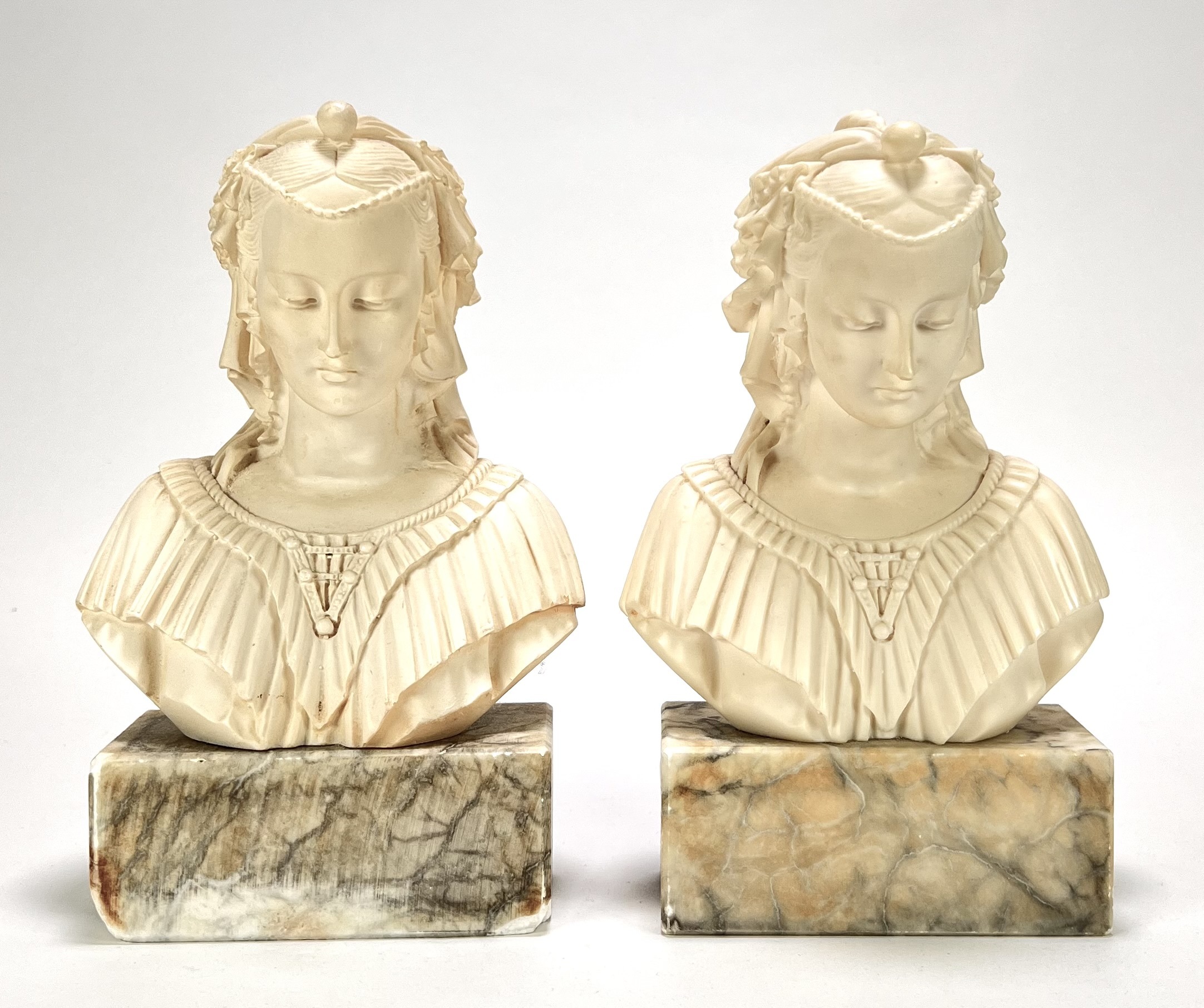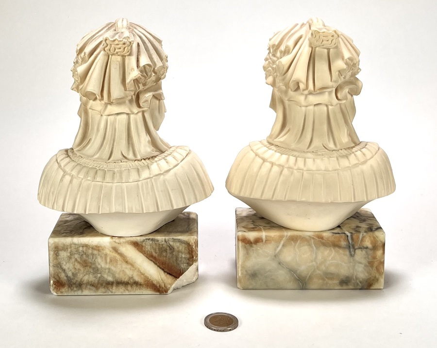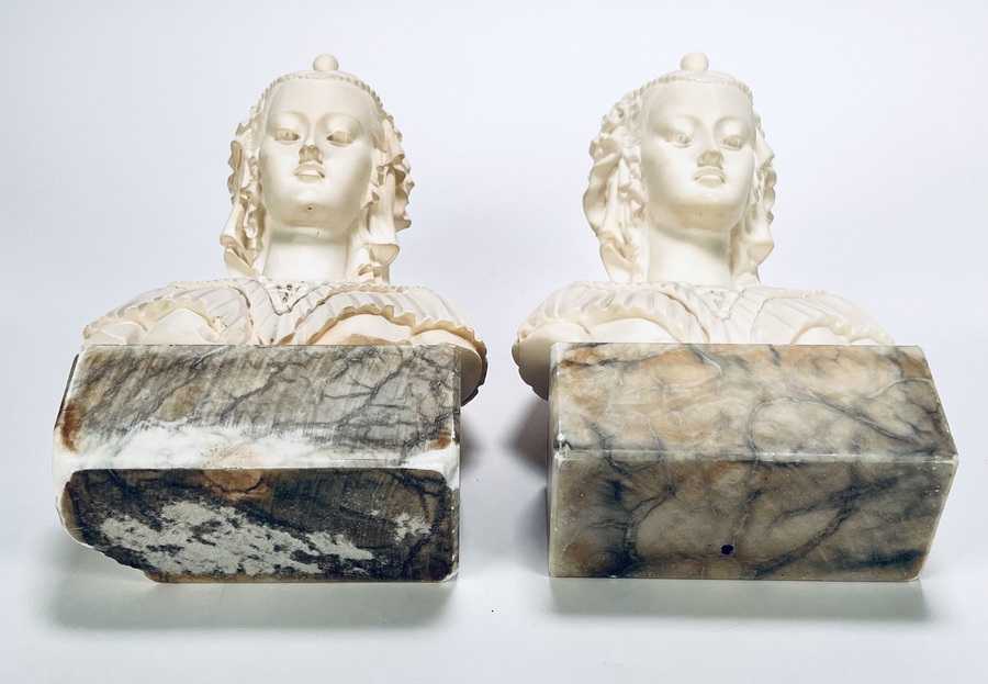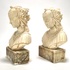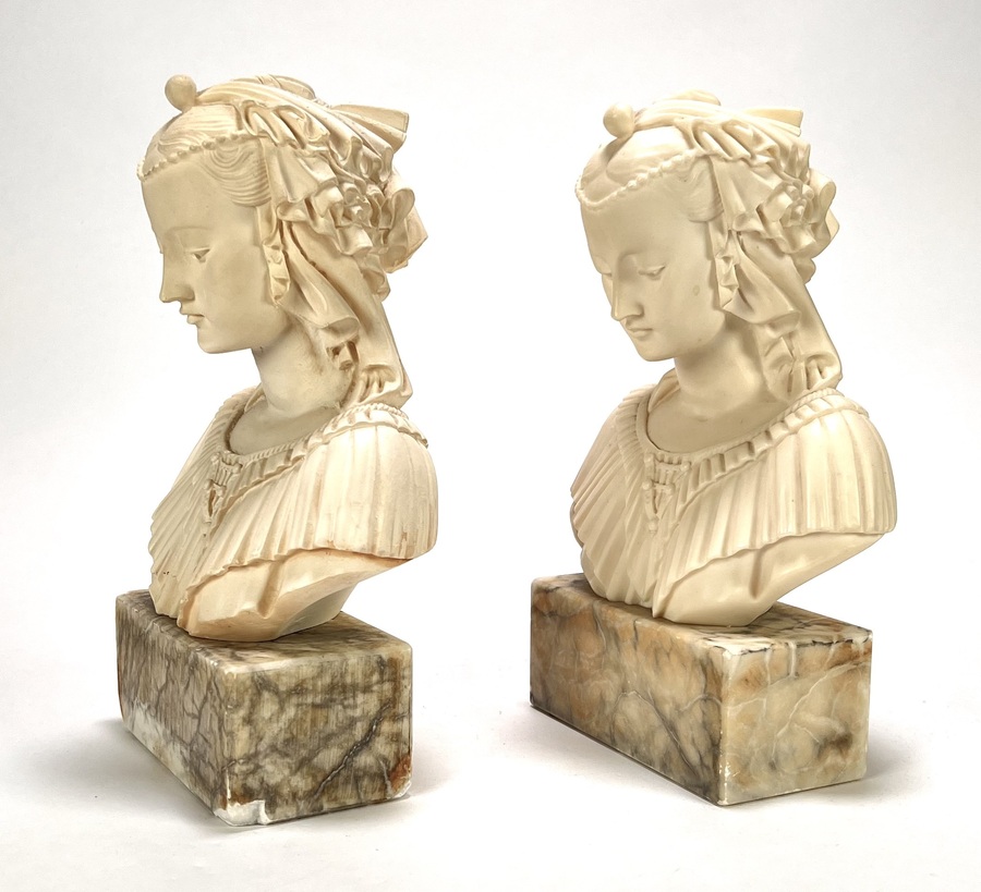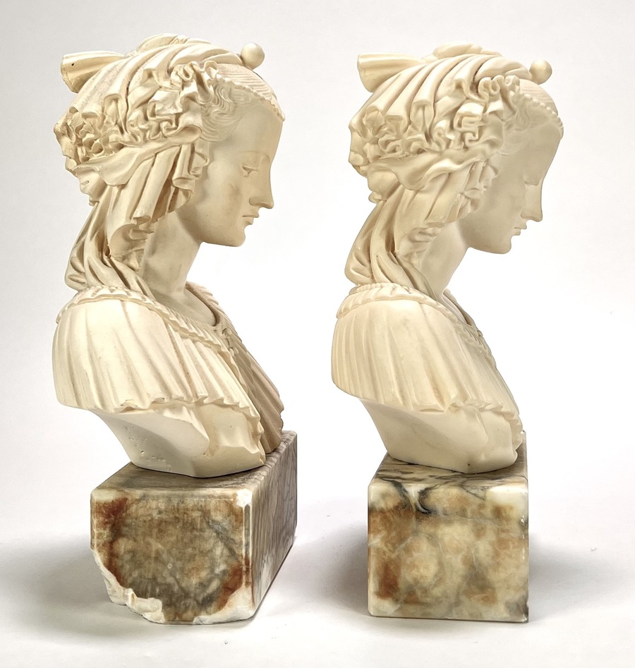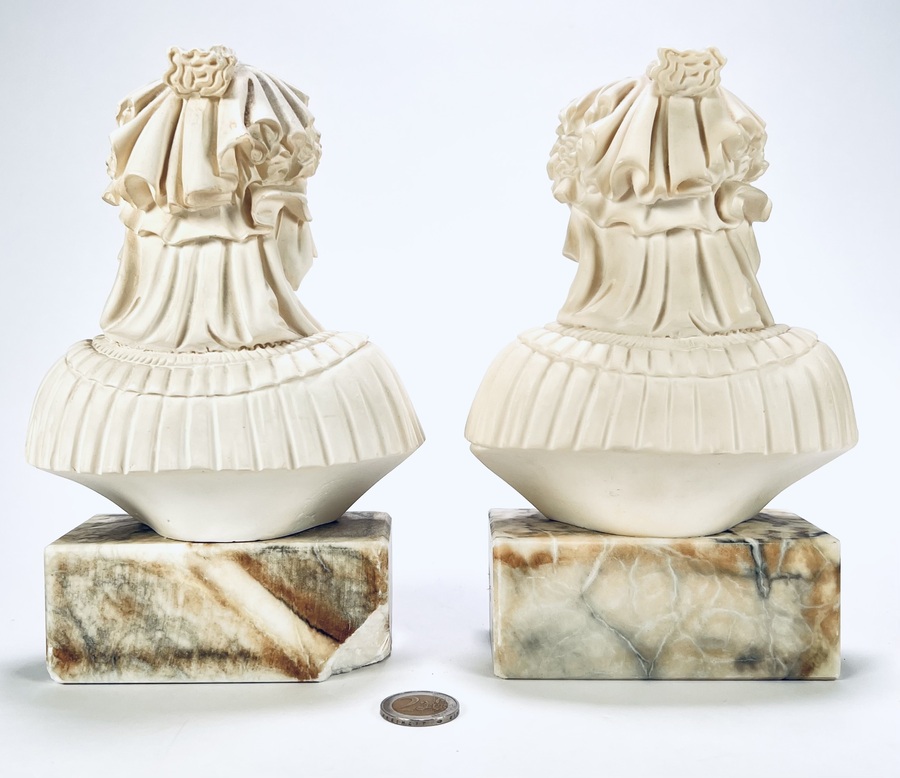 Bustes in neoclassicistische stijl, vervaardigd uit gegoten composiet op rechthoekige natuurstenen sokkels. Uitgevoerd naar het bekende Angelica Maria-model van A. Giannelli en toont vrouwelijke bustes met neerwaartse blik, opgestoken haar met lintornamenten en een geplooide schouderpartij. De reproducties dateren uit de tweede helft van de 20e eeuw en hebben een Europese herkomst. De bustes zelf beoordelen? Je bent welkom op onze kijkdagen op 10, 11 en 12 april! |