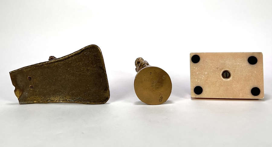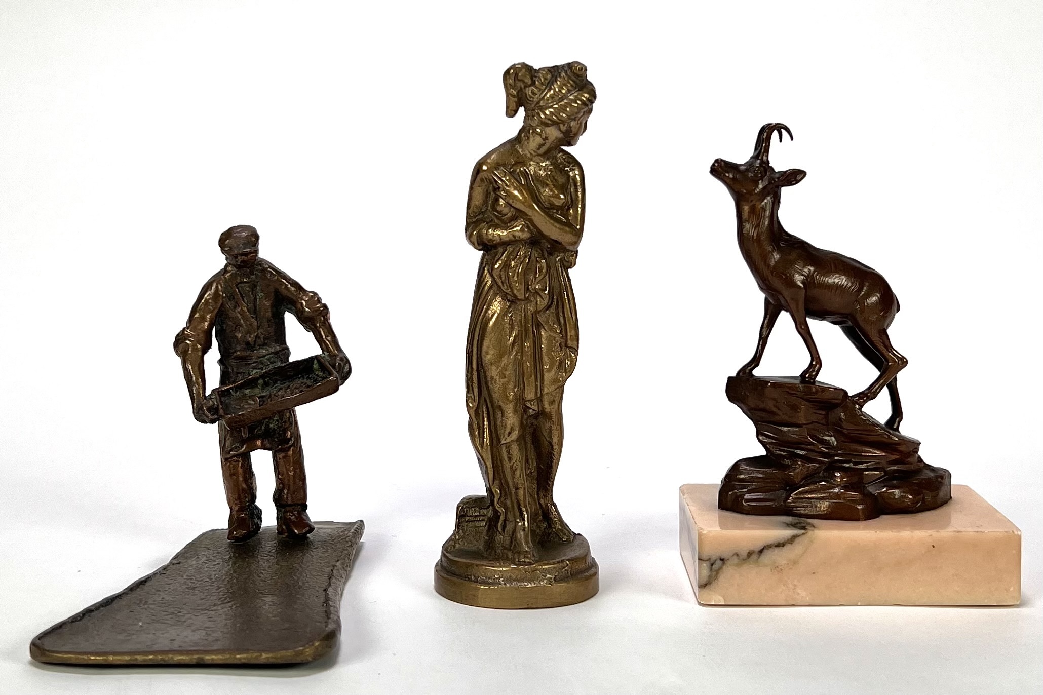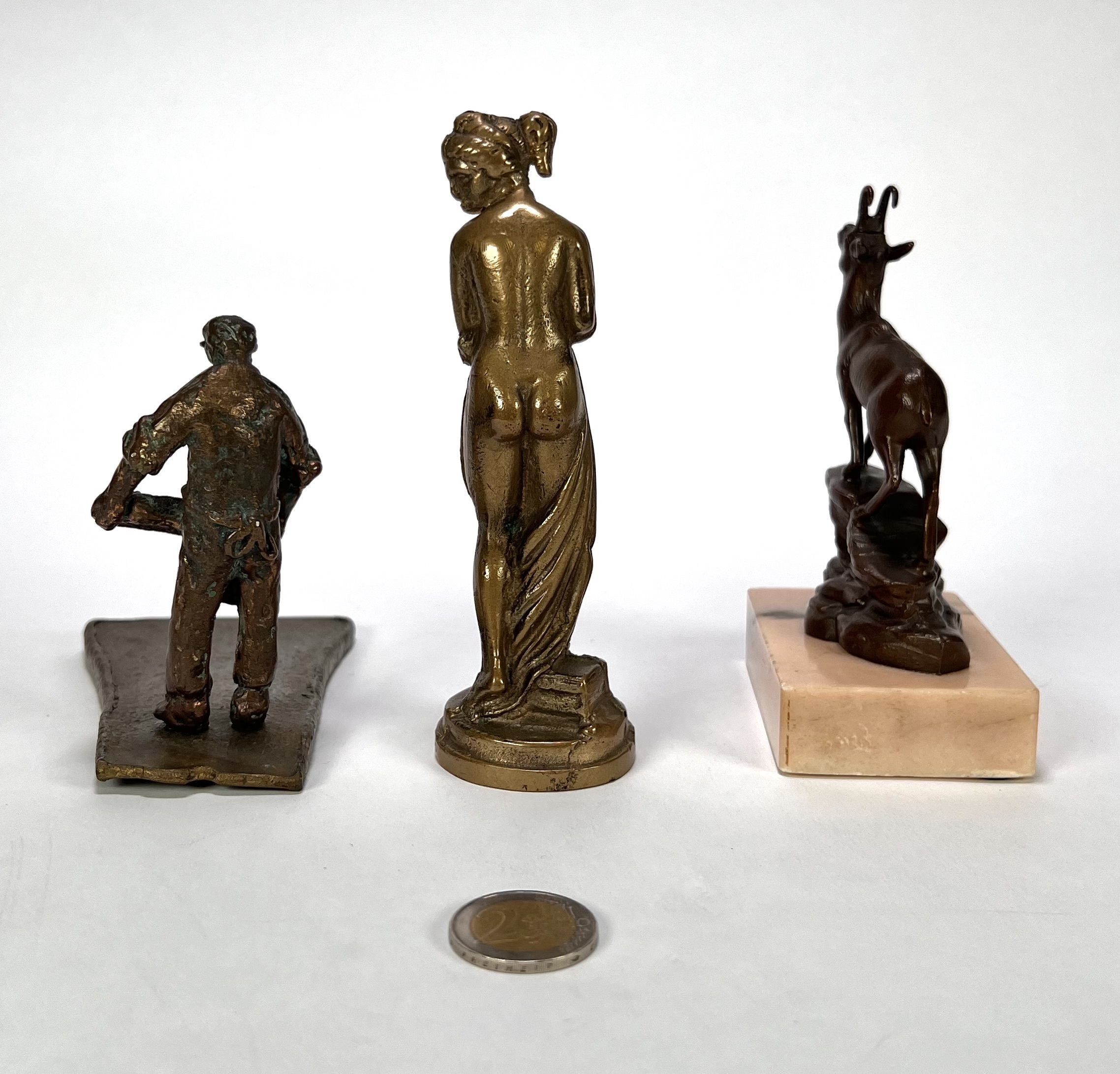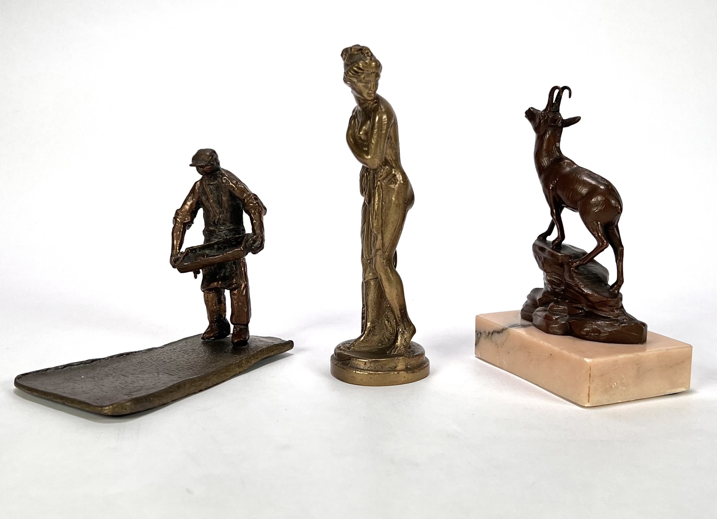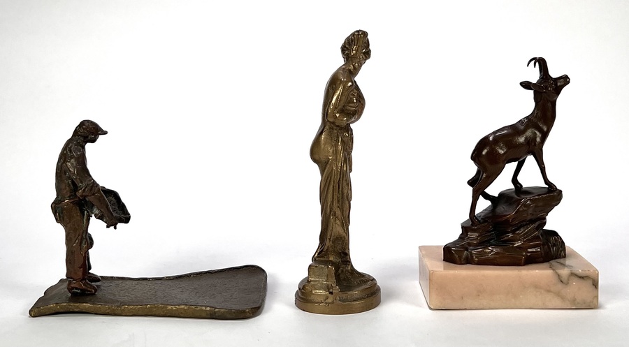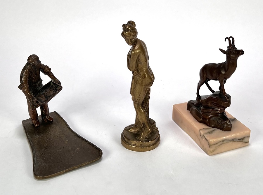 Beeldjes vervaardigd uit messing, brons en wit metaal met diverse voorstellingen; een berggeit op rotsbodem, een klassiek gestileerde vrouwenfiguur en een ambachtsman met werktuig. De beeldjes dateren uit de eerste helft van de 20e eeuw en hebben een West-Europese herkomst. Registreer nu en bied eenvoudig online mee op de beeldjes! |