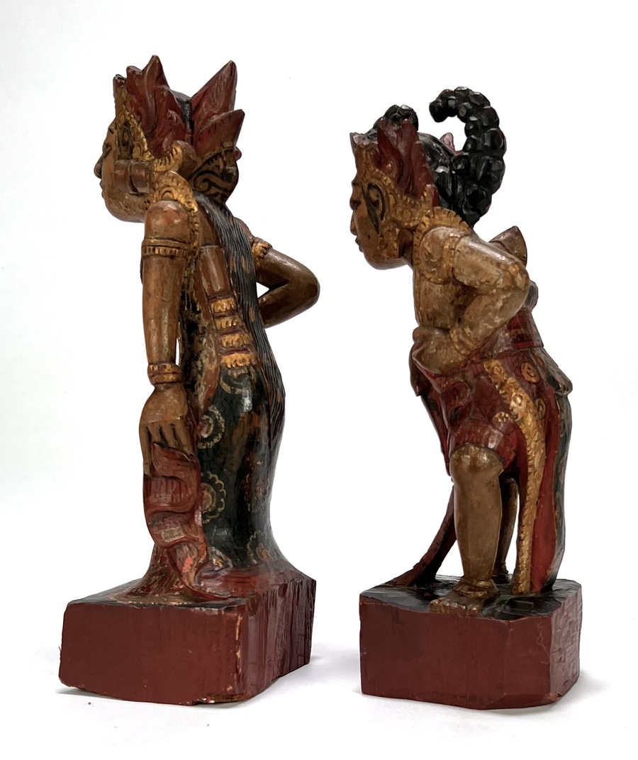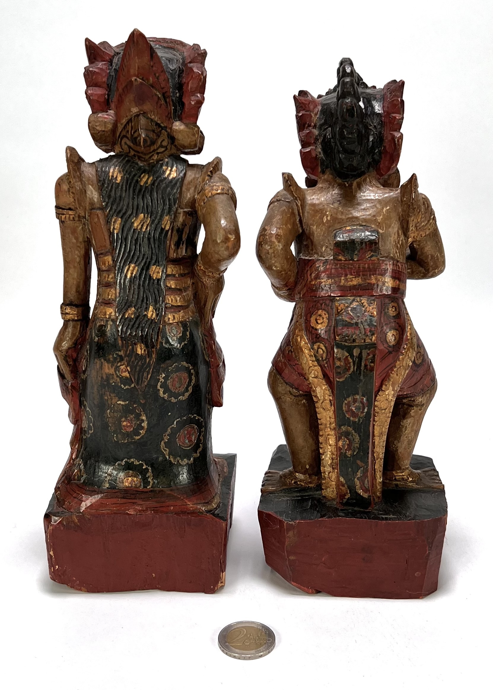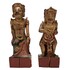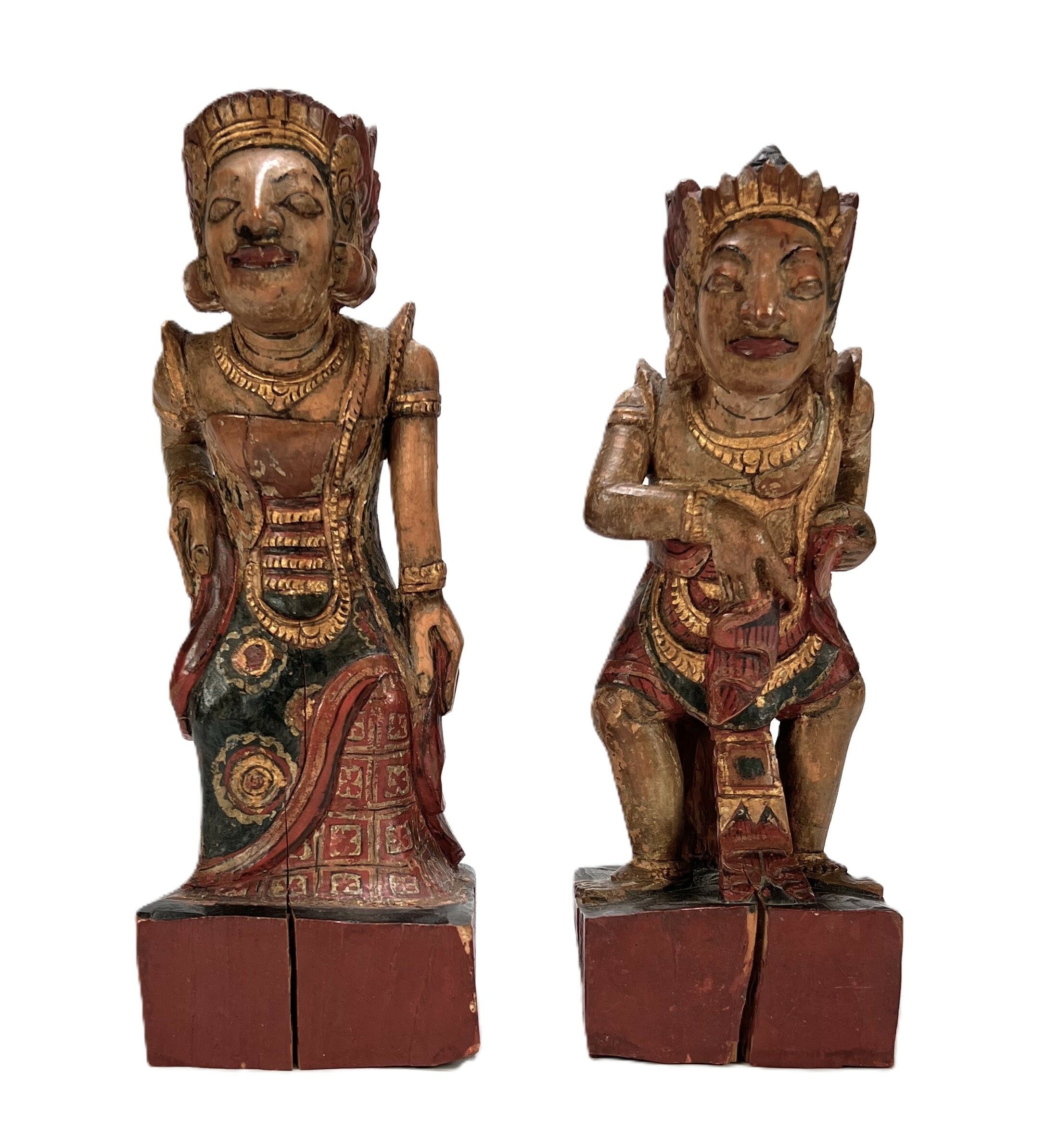 Beelden in Balinese stijl, vervaardigd uit gepolychromeerd hout met gedetailleerd handgesneden reliëf. Een mannelijke en vrouwelijke figuur in traditionele ceremoniële kleding, uitgevoerd met gesso-applicaties en veelkleurige beschildering in rood, zwart en goudkleurige accenten. De beelden staan op een rechthoekige basis. Datering midden 20e eeuw en een Indonesische herkomst. Wil je dit paar beelden in het echt bekijken? Kom naar de kijkdagen! |