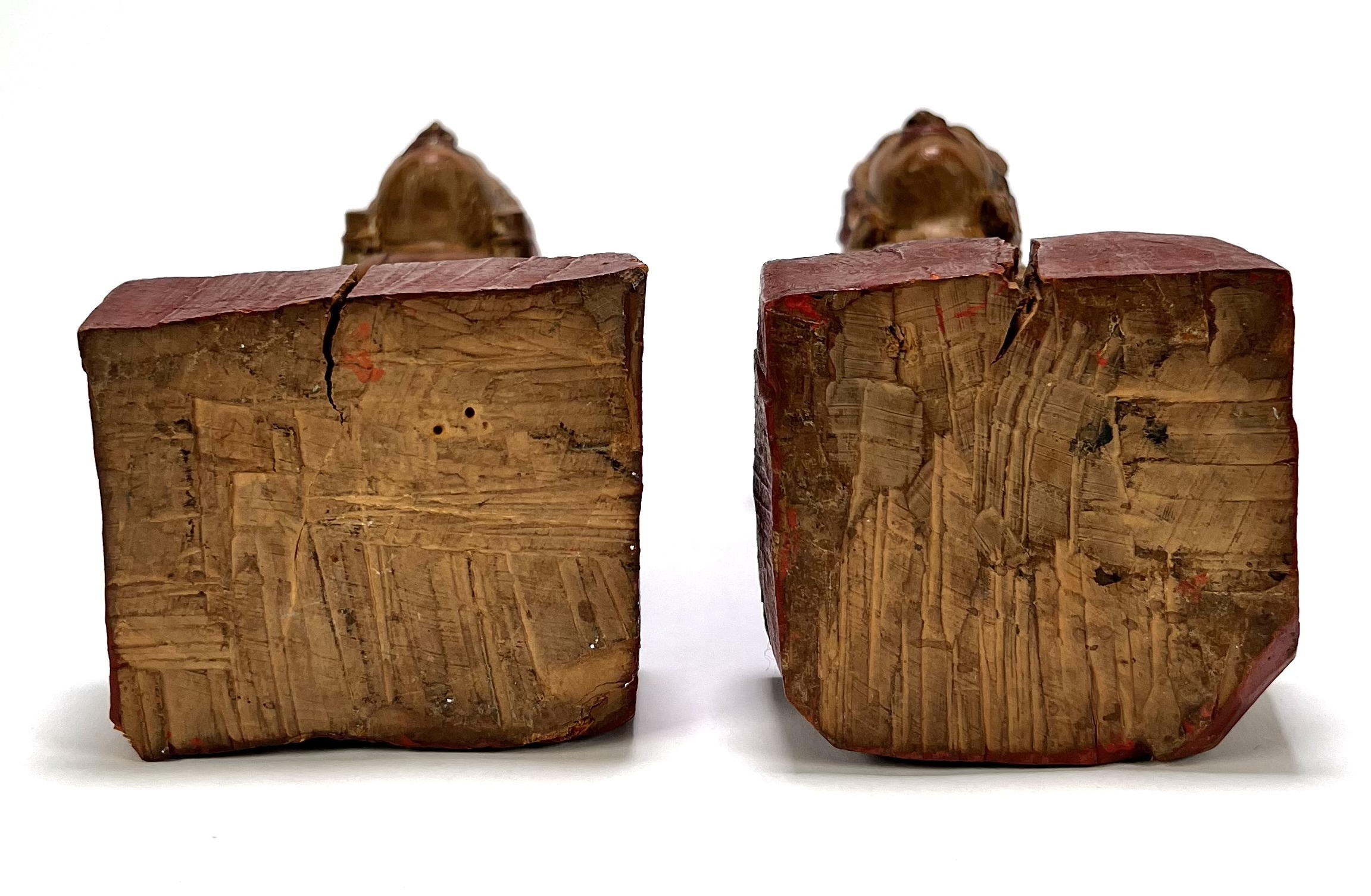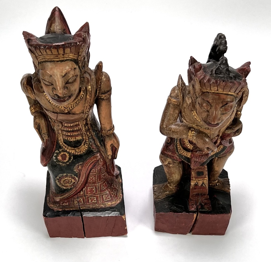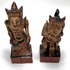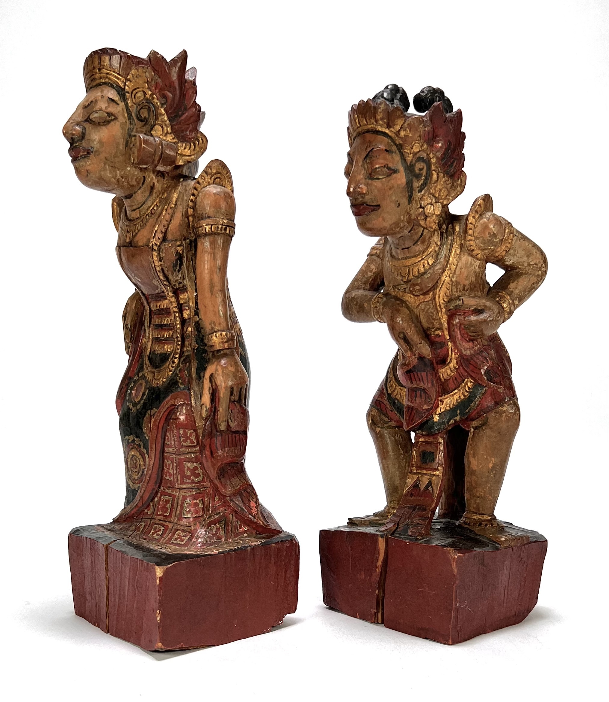 Beelden in Balinese stijl, vervaardigd uit gepolychromeerd hout met gedetailleerd handgesneden reliëf. Een mannelijke en vrouwelijke figuur in traditionele ceremoniële kleding, uitgevoerd met gesso-applicaties en veelkleurige beschildering in rood, zwart en goudkleurige accenten. De beelden staan op een rechthoekige basis. Datering midden 20e eeuw en een Indonesische herkomst. Wil je dit paar beelden in het echt bekijken? Kom naar de kijkdagen! |