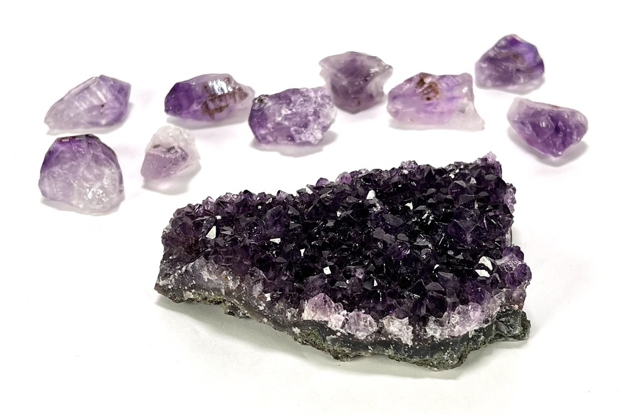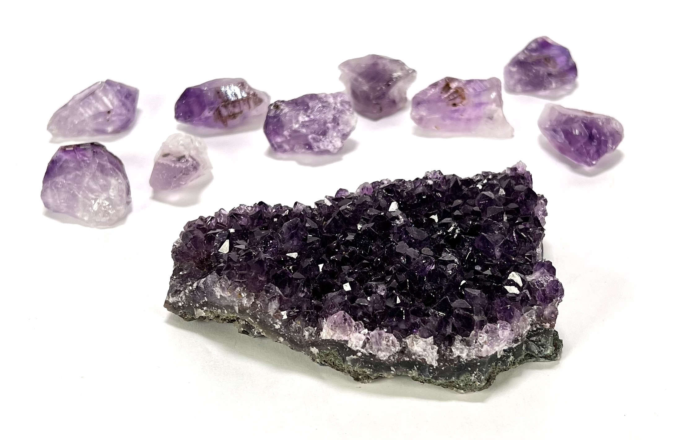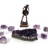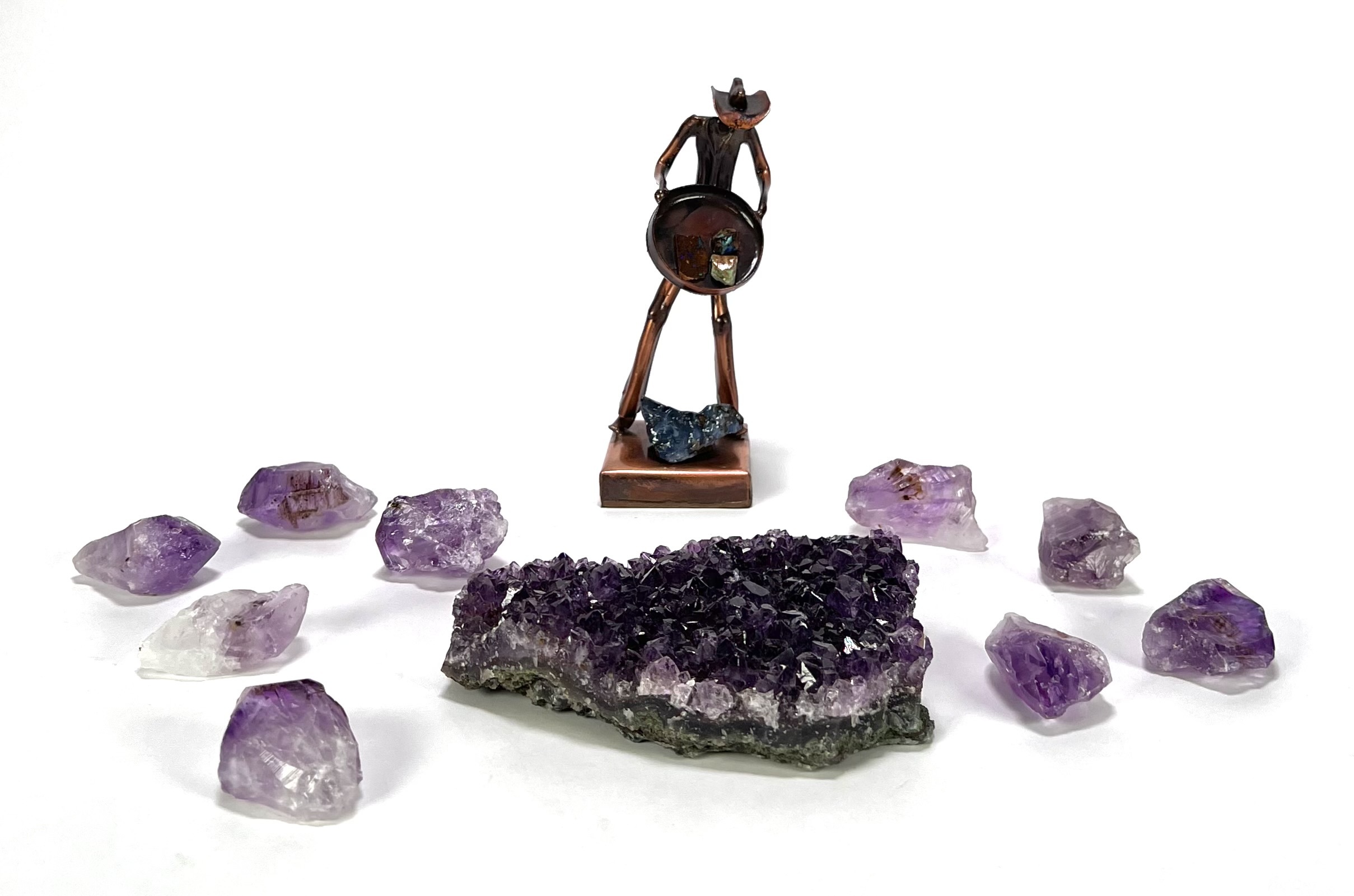 Beeldje van koper vergezeld door een verzameling kristallen, waaronder een amethistgeode en diverse ruwe kwartsfragmenten. De koperen figuur stelt een goudzoeker voor met een breedgerande hoed en waspan, gemonteerd op een vierkante sokkel. De kavel dateert uit de tweede helft van de 20e eeuw en heeft een Europese herkomst. Geïnteresseerd? Bezoek onze kijkdagen op 10, 11 en 12 april van 11:00 tot 17:00 uur! |