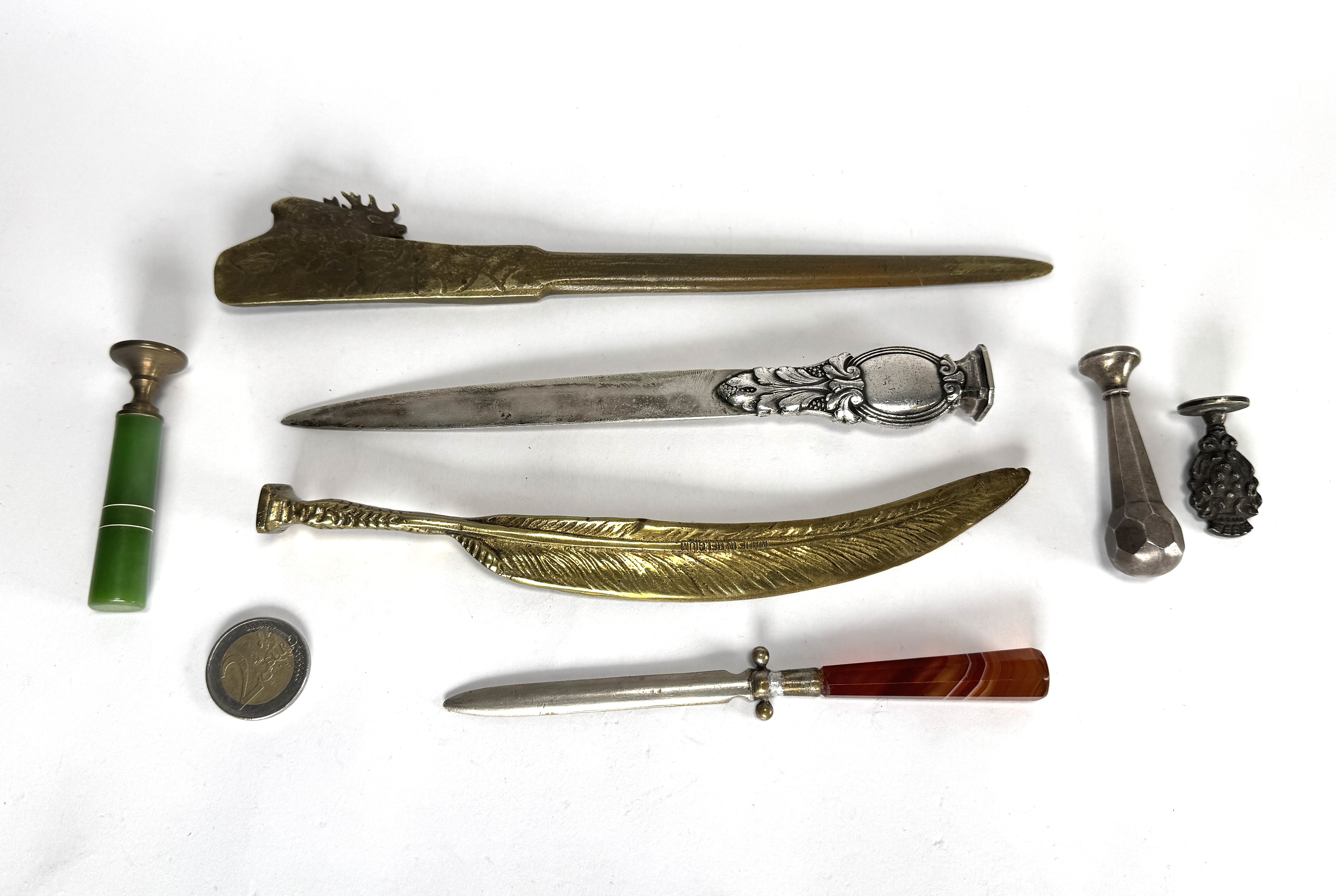 Briefopeners en lakstempels vervaardigd uit messing met stalen klingen en agaat-inleg. Vier briefopeners met uiteenlopende decors, waaronder een vogelpoot en florale motieven, aangevuld met drie lakstempels voorzien van diverse initialen. Eén exemplaar is gemerkt met de herkomstduiding uit België. Datering eind 19e eeuw, een West-Europese herkomst. Jouw kans op deze bievenopeners en lakstempels begint met registreren – bied live of online mee! |