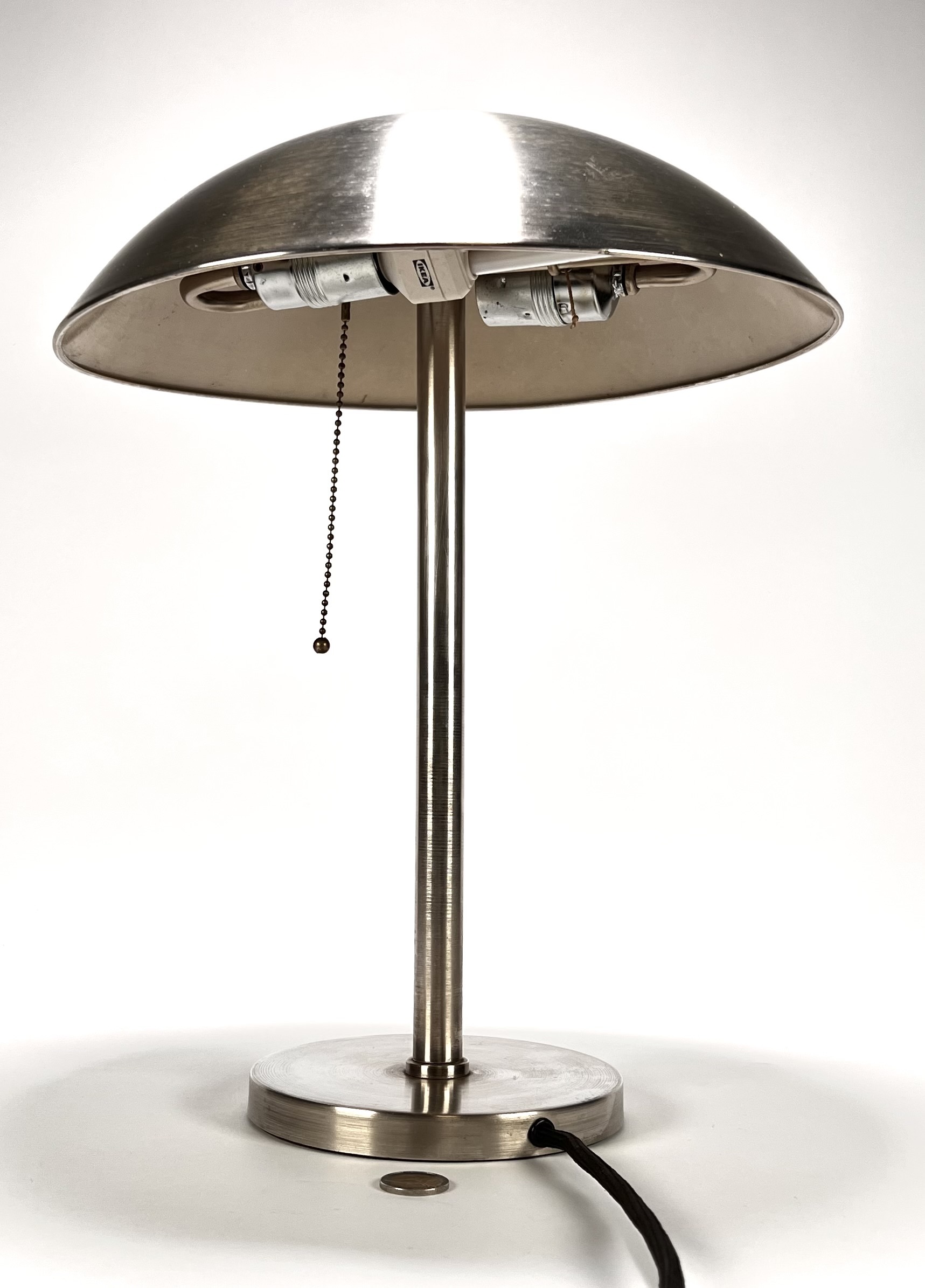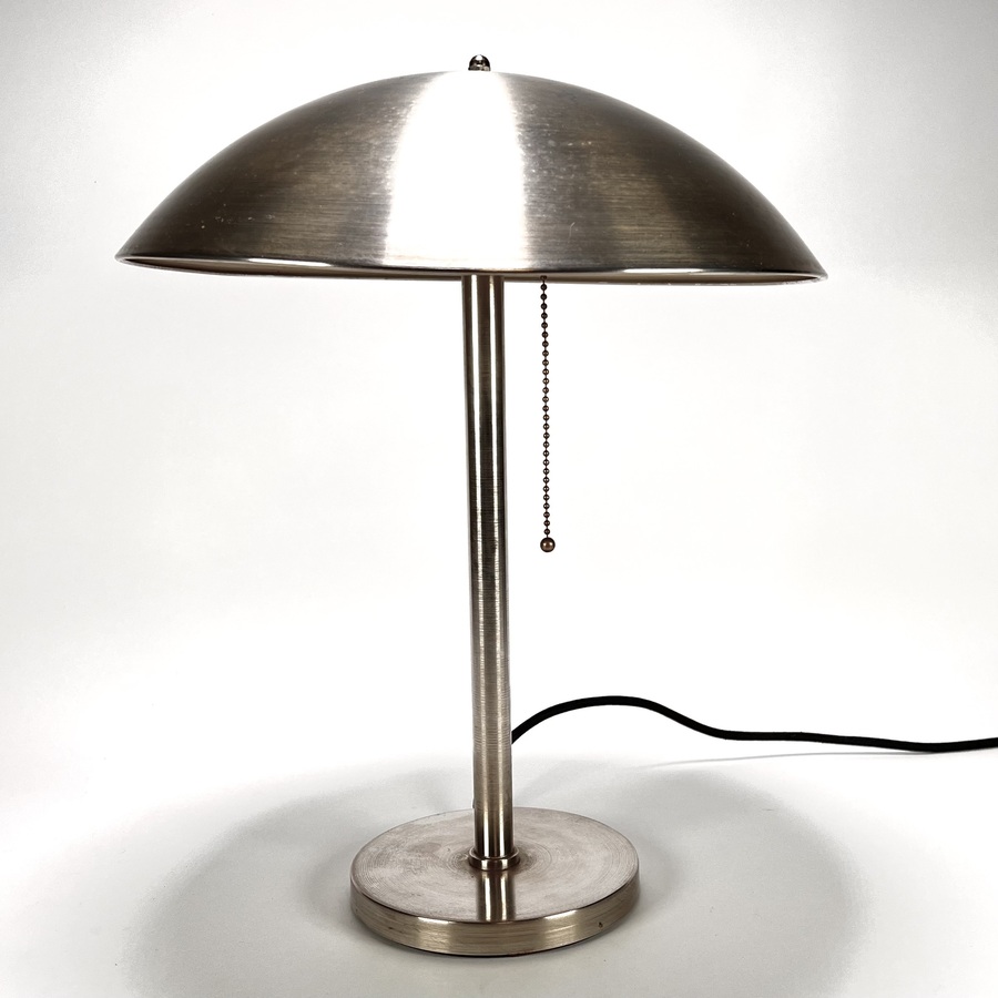 Bureaulamp van IKEA in moderne stijl, vervaardigd uit geborsteld metaal. De lamp heeft een halfronde kap op een slanke cilindrische stam, rustend op een platte ronde voet. Fabriekssticker op de binnenzijde van de armatuur. De lamp dateert uit circa 1995 en heeft een herkomst in Zweden. Kom langs tijdens de kijkdagen (10 t/m 12 april) en ontdek deze lamp zelf! |