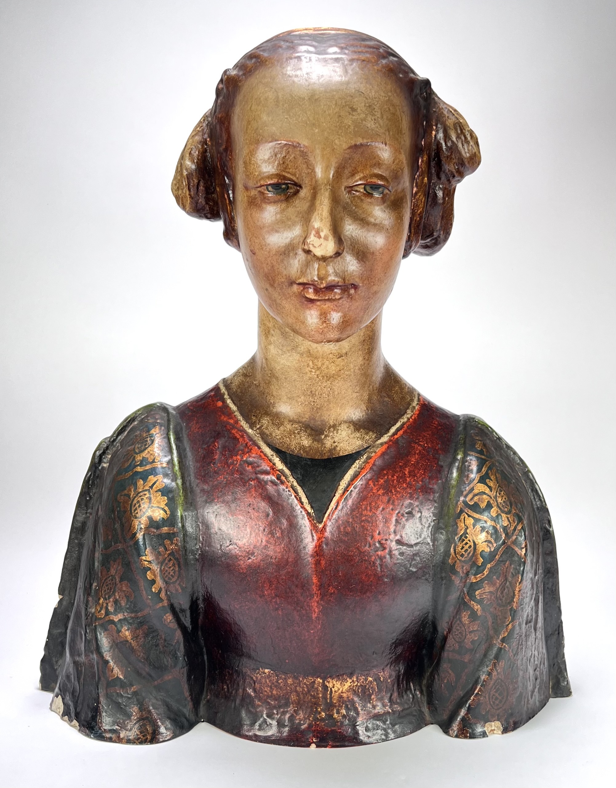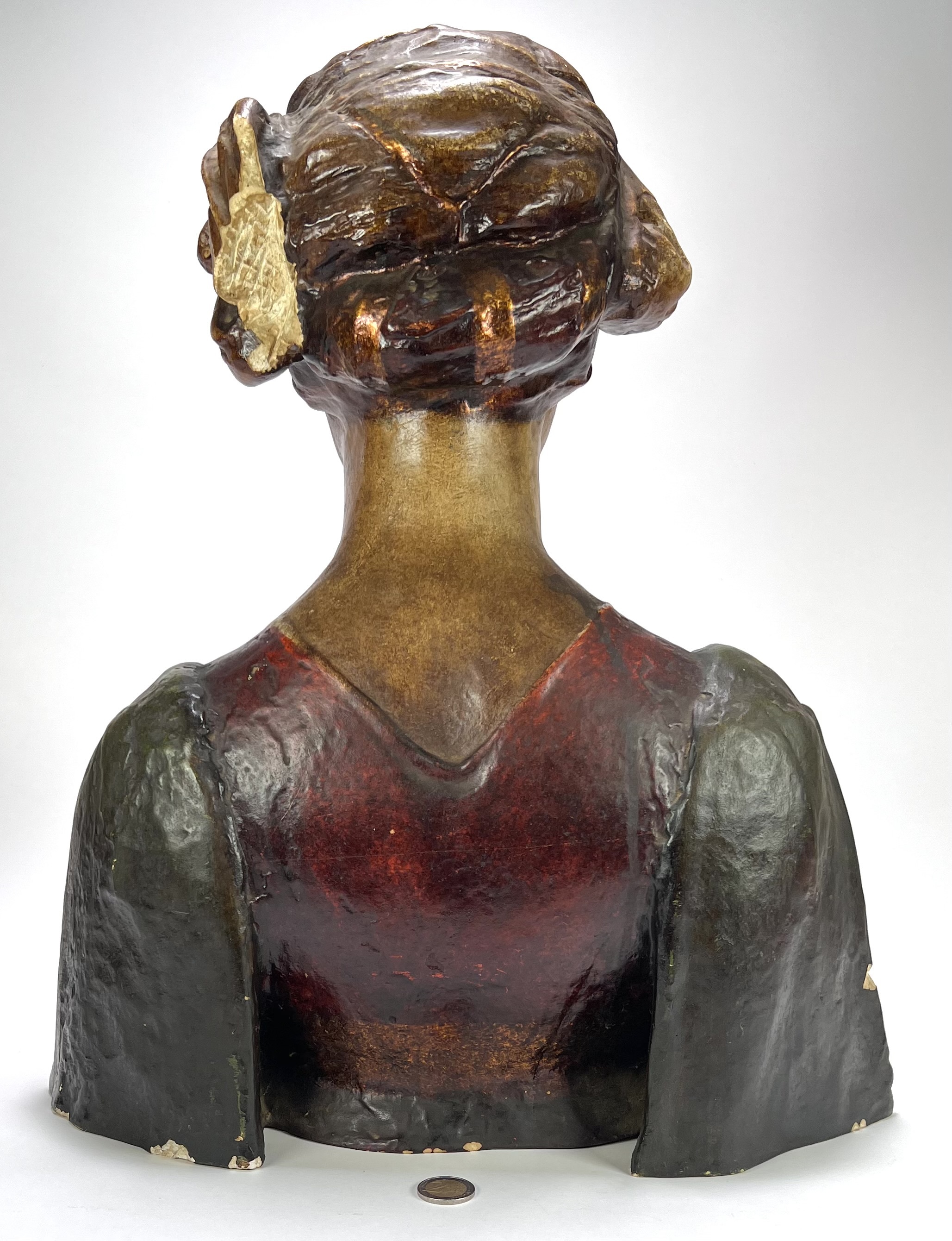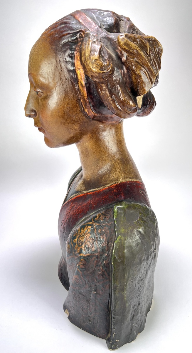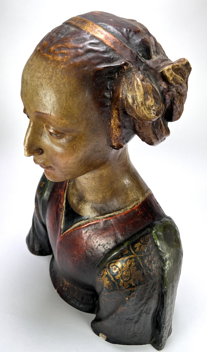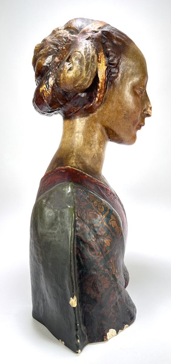 Buste uit de 19e eeuw, vervaardigd uit polychroom beschilderd gips. Het object toont een vrouwfiguur in neorenaissance stijl, gekenmerkt door een rijke decoratie op het gewaad en een verfijnde haarstijl met diadeem. Het academische model diende oorspronkelijk als studieobject voor tekenacademies. De buste heeft een Europese herkomst. Geïnteresseerd? Bezoek onze kijkdagen op 10, 11 en 12 april van 11:00 tot 17:00 uur! |