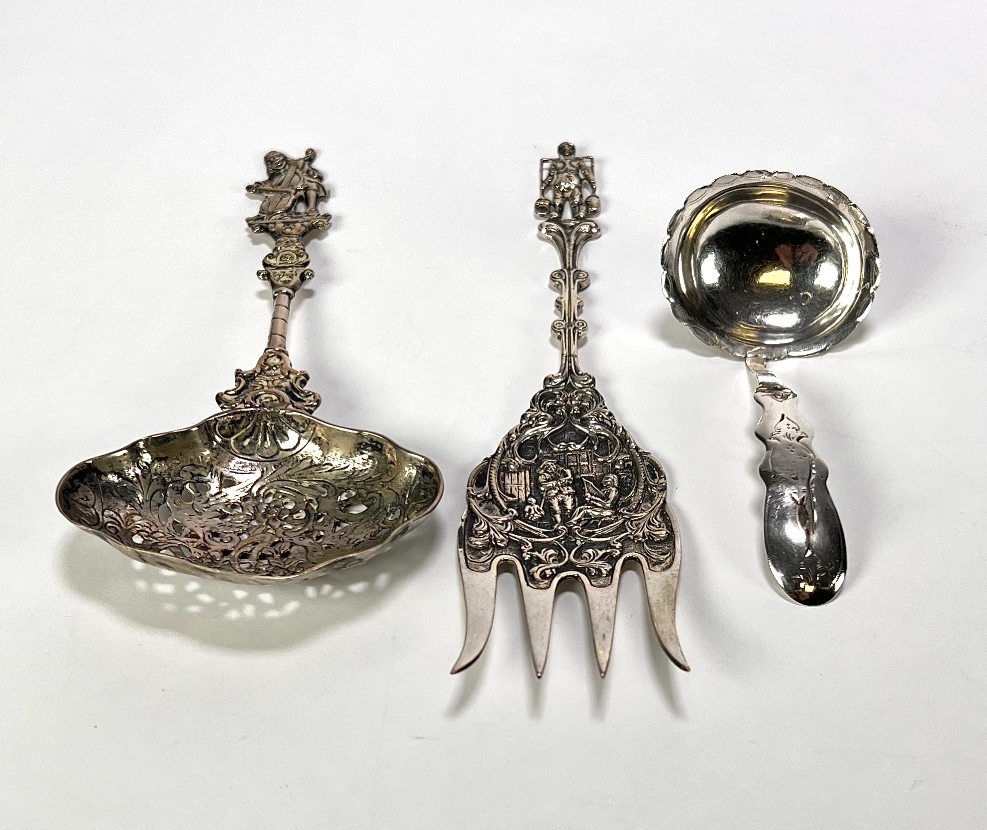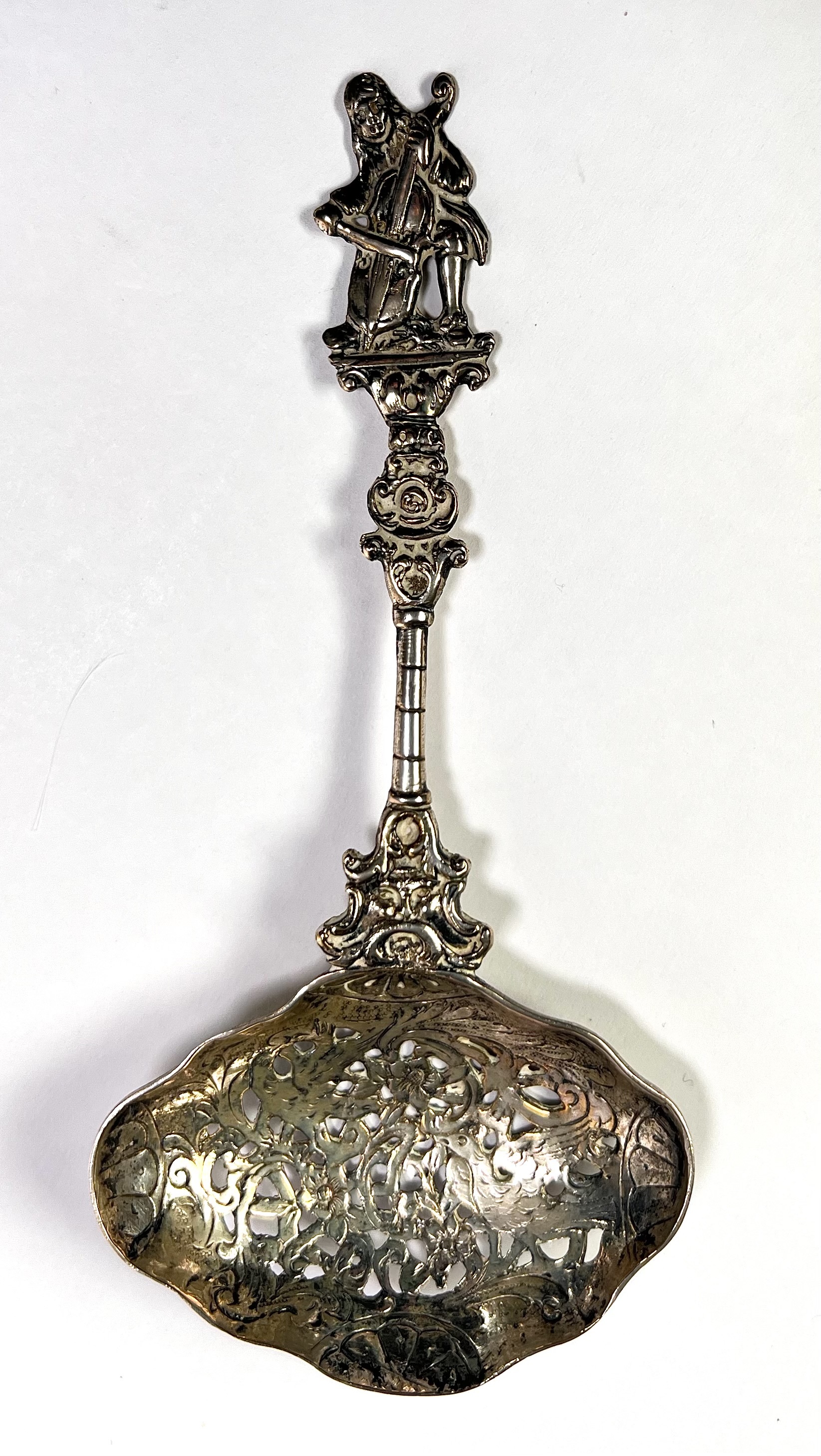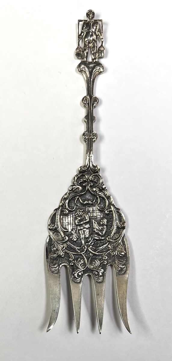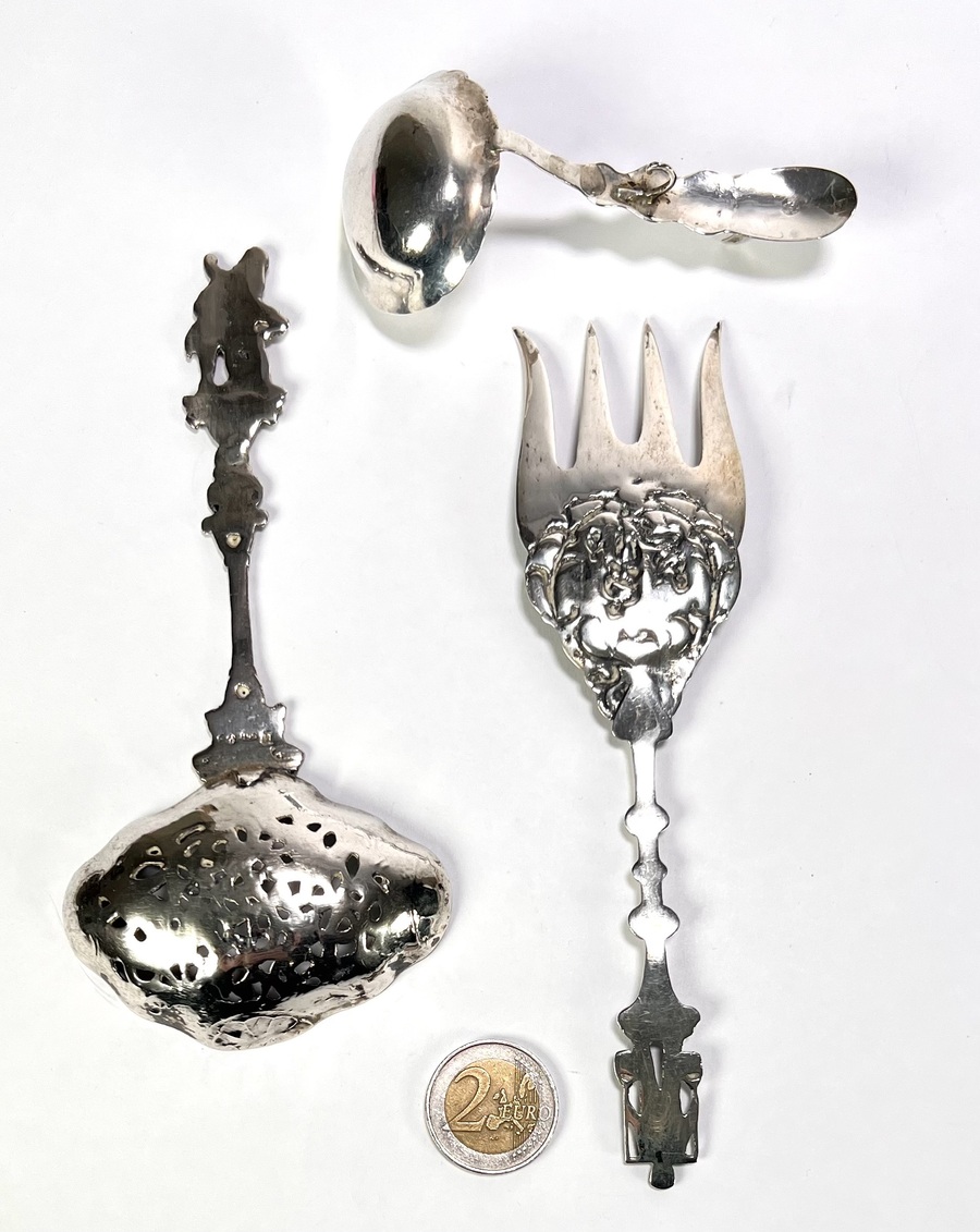 Tafelzilver uit circa 1880–1928, vervaardigd uit 835 en 800 zilver. De driedelige set bestaat uit een roomlepel met apostelfiguur, een floraal gedreven suikerstrooilepel en een vork met gegoten figuratieve bekroning. Onderdelen vertonen Nederlandse keuren waaronder lopende leeuw 2, minervakop en jaarletters. Dit zilver zelf beoordelen? Je bent welkom op onze kijkdagen op 10, 11 en 12 april! |