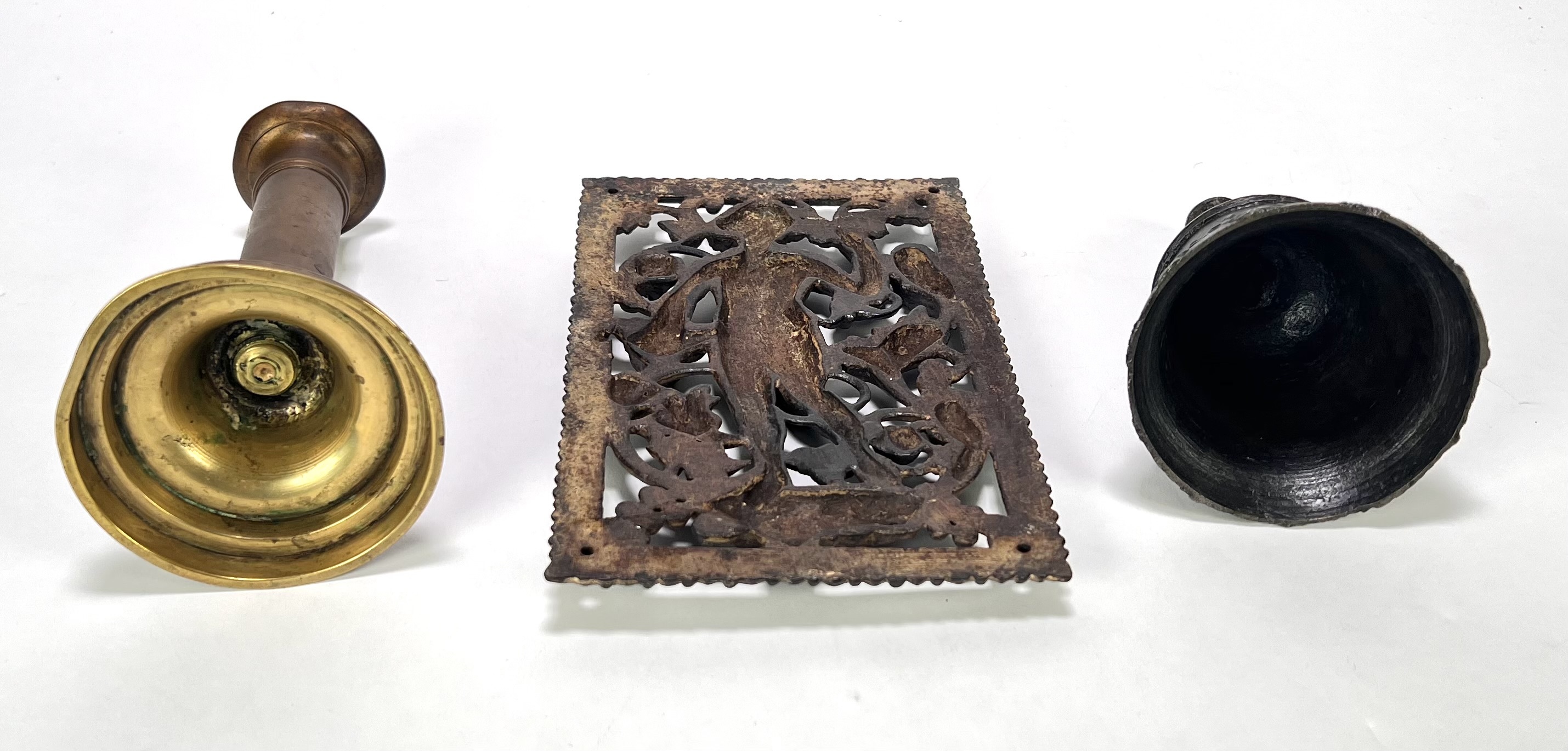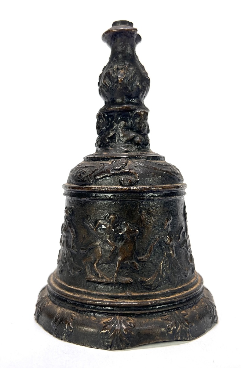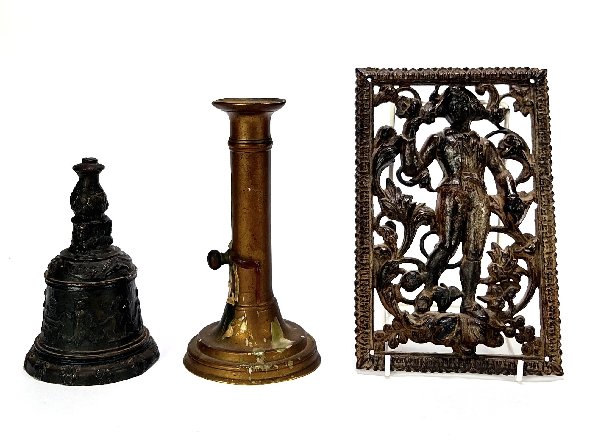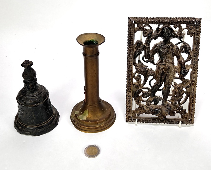 Bronzen en messing curiosa – bel, kandelaar en ornament, eerste helft 20e eeuw