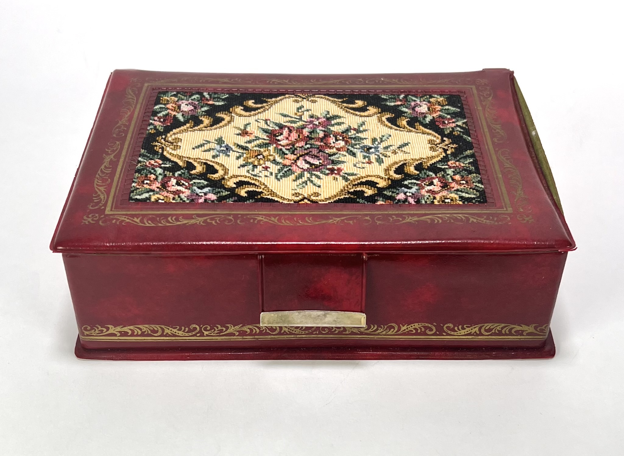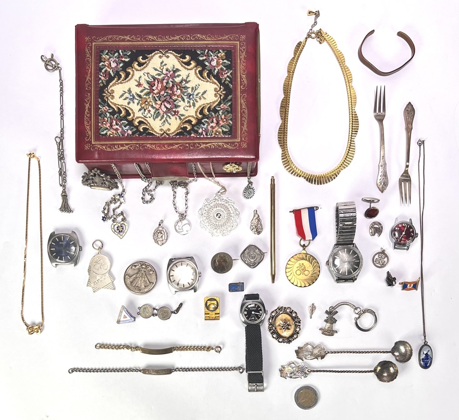 Lot sieraden en curiosa bestaande uit onder andere vintage horloges, armbanden, kettingen, zilverkleurig bestek en een bordeauxrode sieradendoos met floraal tapisserie-inzetstuk. Datering tweede helft 20e eeuw. Wil je direct deelnemen? Plaats vanaf 3 april alvast een schriftelijk bod via onze website! |