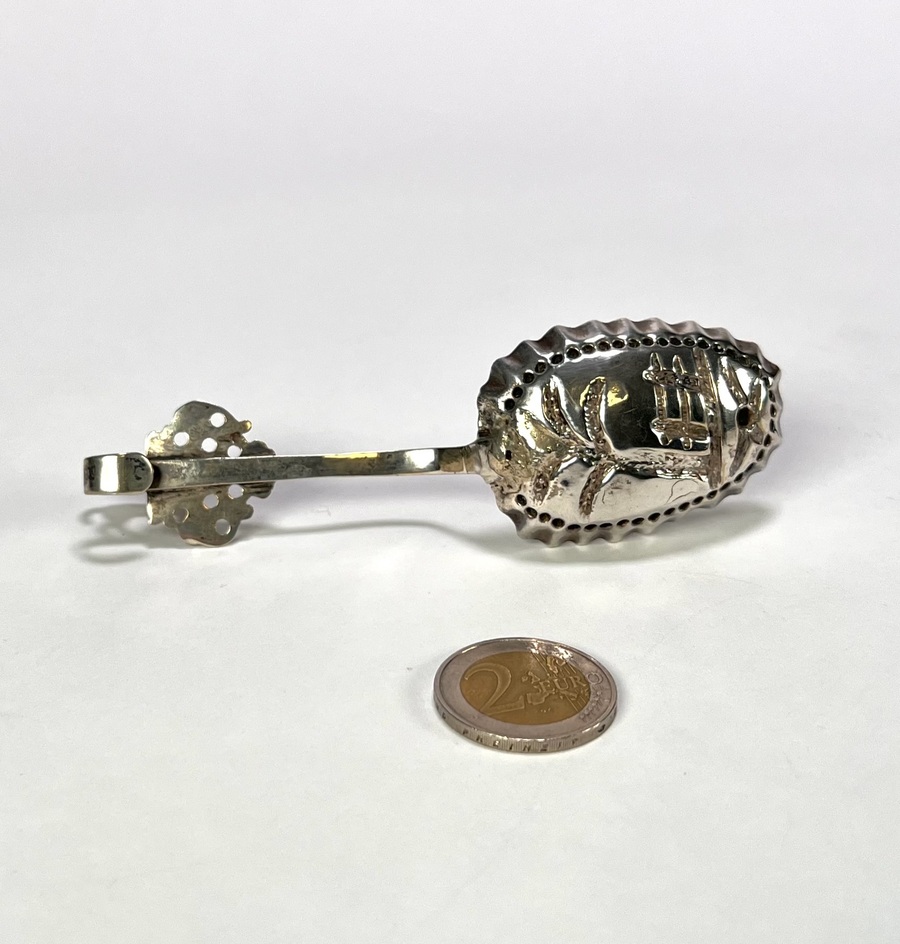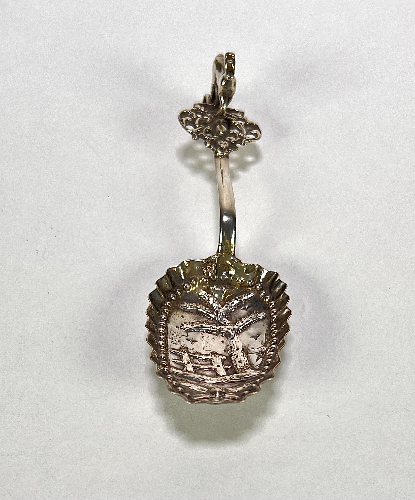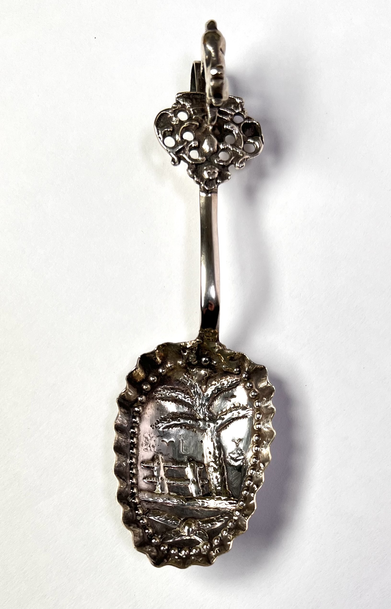Zilveren roomlepel uit de Biedermeier periode, circa 1860. De getrapte bak toont een gedreven landschapsscene met architecturale elementen. De steel is voorzien van een gegoten bekroning in de vorm van een paard op een opengewerkte console. Nederlandse herkomst, getoetst zilver. Zeker zijn van deelname? Plaats vanaf 3 april een schriftelijk bod online! |